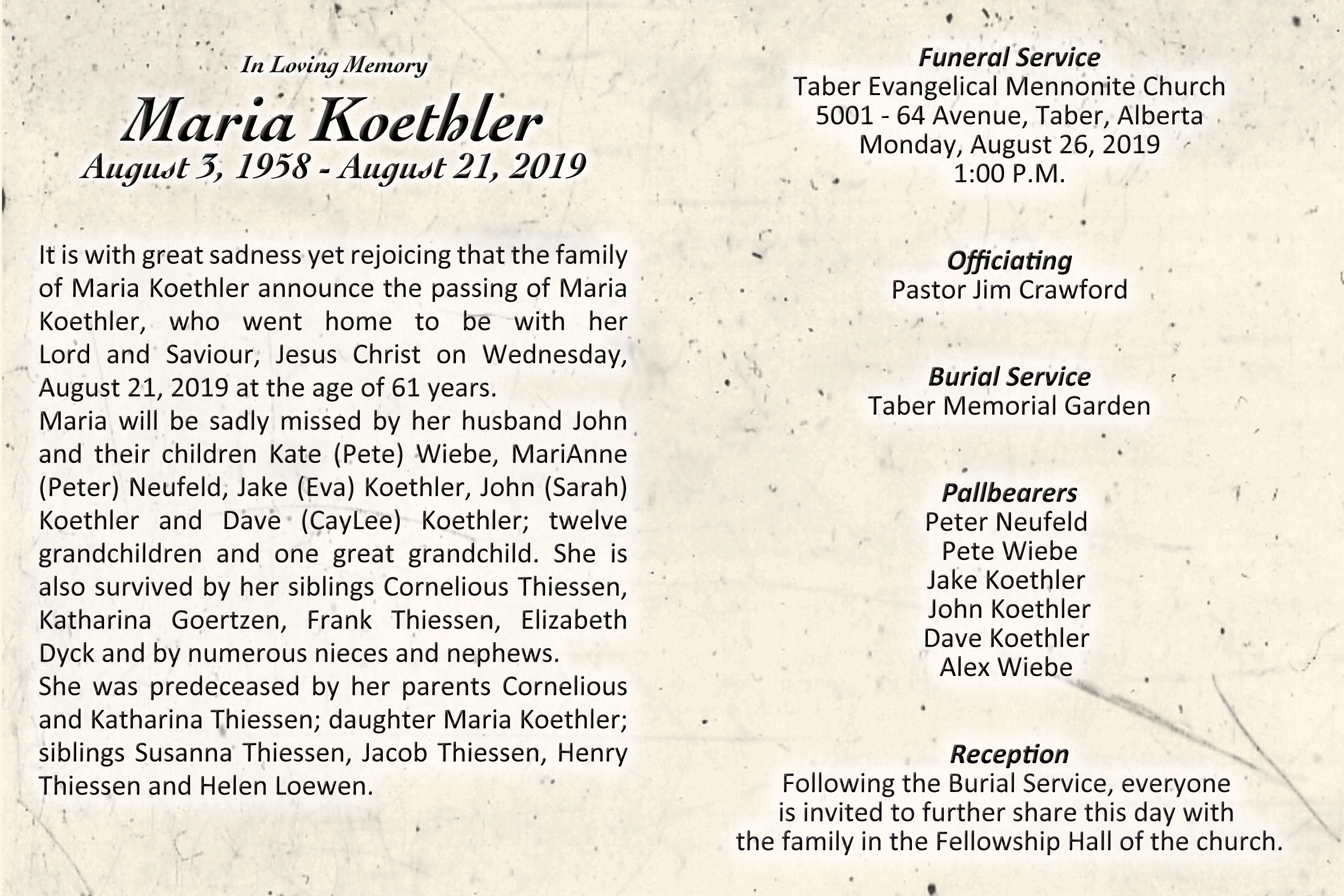 The Funeral Service was held at the Evangelical Mennonite Church, 5001 - 64 Avenue, Taber on Monday, August 26, 2019 at 1:00 P.M. Burial followed at the Taber Memorial Garden.