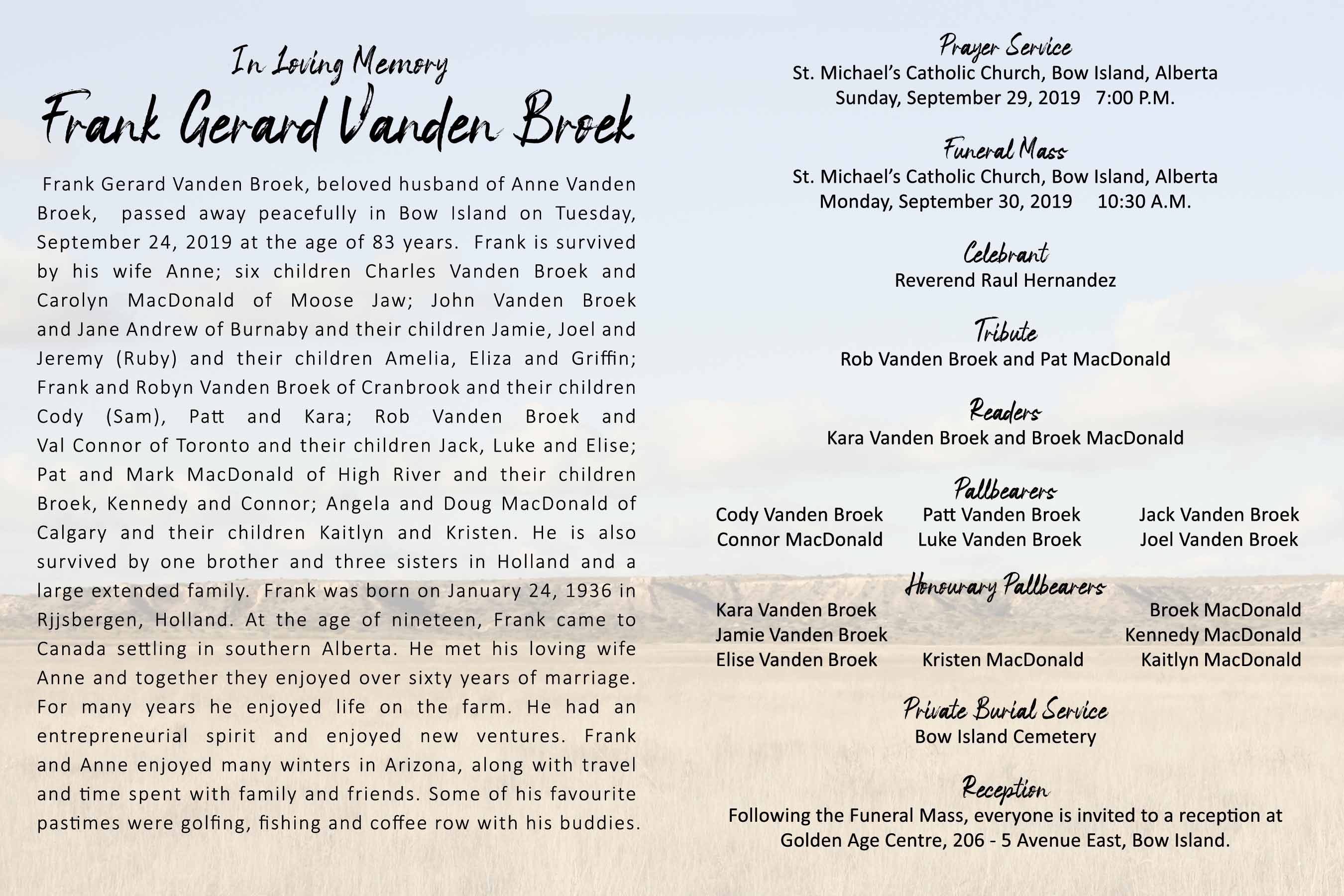 Frank is survived by his wife Anne; six children Charles Vanden Broek and Carolyn MacDonald of Moose Jaw; John Vanden Broek and Jane Andrew of Burnaby and their children Jamie, Joel and Jeremy (Ruby) and their children Amelia, Eliza and Griffin; Frank and Robyn Vanden Broek of Cranbrook and their children Cody (Sam), Patt and Kara; Rob Vanden Broek and Val Connor of Toronto and their children Jack, Luke and Elise; Pat and Mark MacDonald of High River and their children Broek, Kennedy and Connor; Angela and Doug MacDonald of Calgary and their children Kaitlyn and Kristen. He is also survived by one brother and three sisters in Holland and a large extended family.