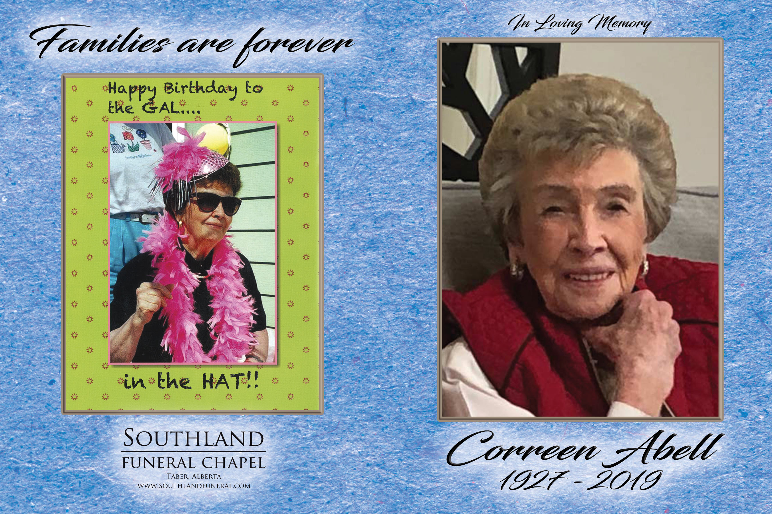 Correen Marie Abell, beloved wife of the late Maurice Abell, passed away in Taber on Friday, October 11, 2019 at the age of 92 years.