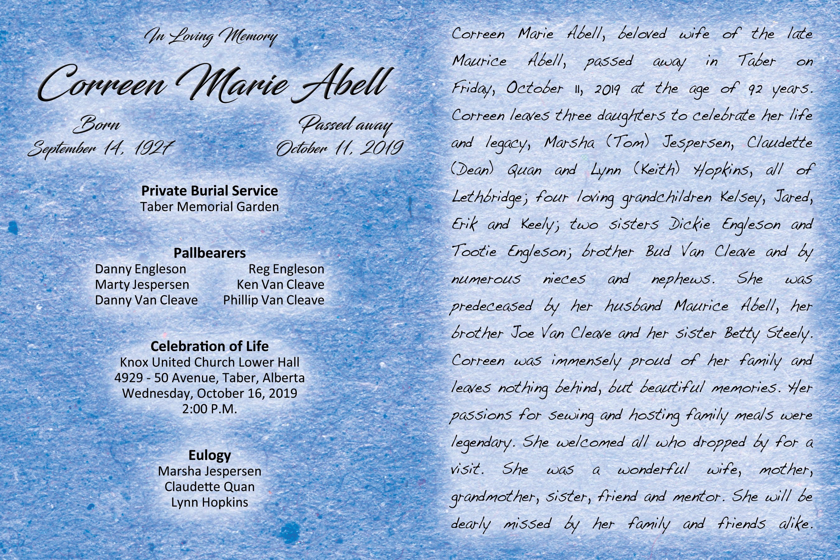 Correen leaves three daughters to celebrate her life and legacy, Marsha (Tom) Jespersen, Claudette (Dean) Quan and Lynn (Keith) Hopkins, all of Lethbridge; four loving grandchildren Kelsey, Jared, Erik and Keely; two sisters Dickie Engleson and Tootie Engleson; brother Bud Van Cleave and by numerous nieces and nephews.