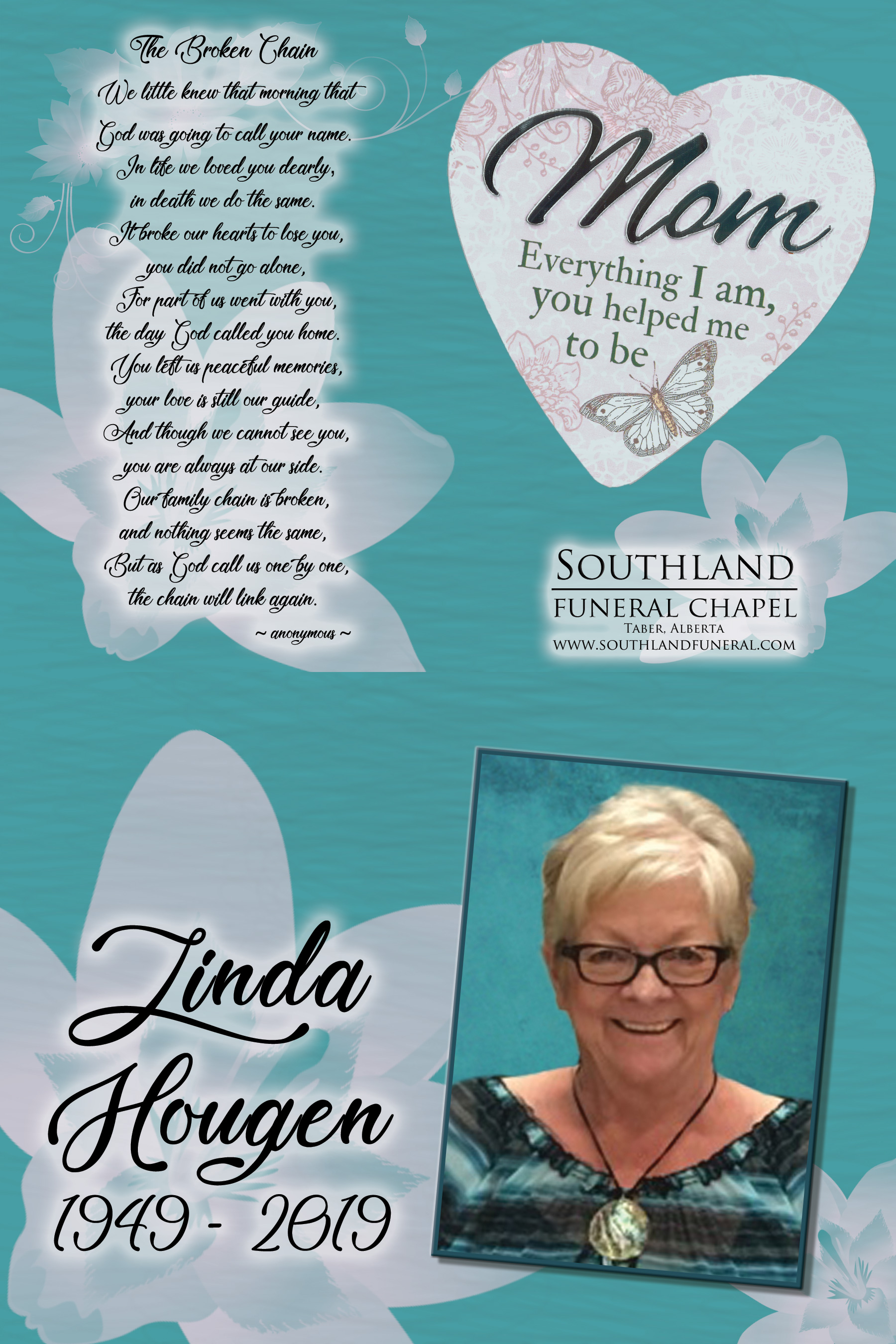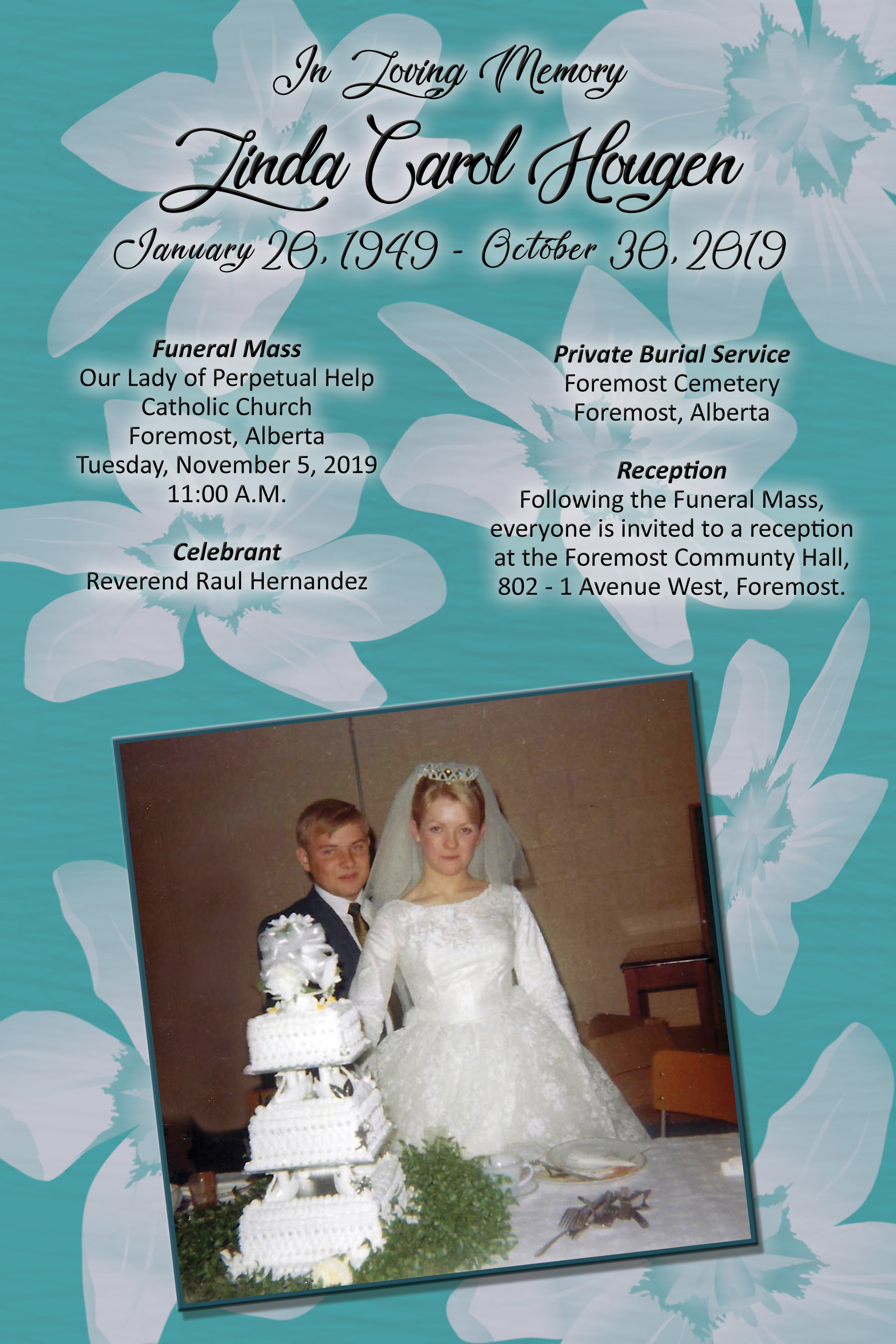 Linda Carol Hougen of Foremost, passed away at the Bow Island Health Centre on Wednesday, October 30, 2019 at the age of 70 years.