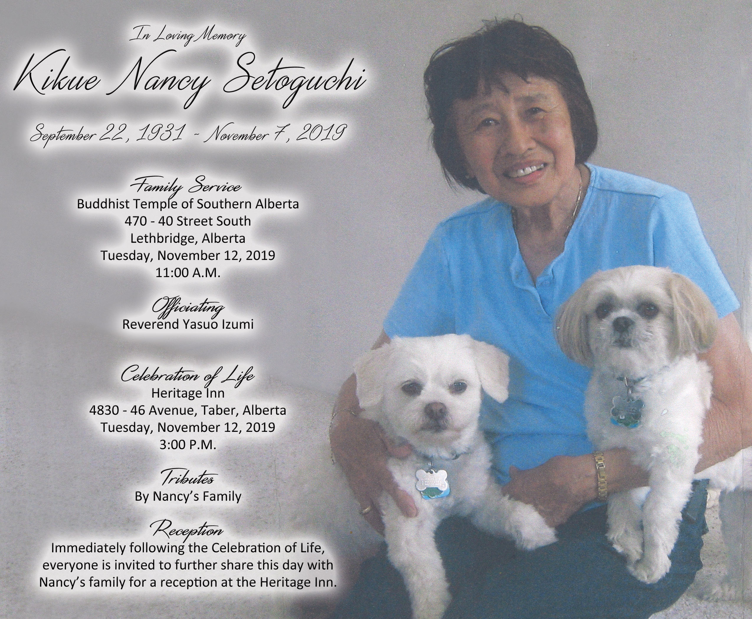 A private service was held at the Buddhist Temple of Southern Alberta, 470 - 40 Street South, Lethbridge on Tuesday, November 12, 2019 at 11:00 A.M.