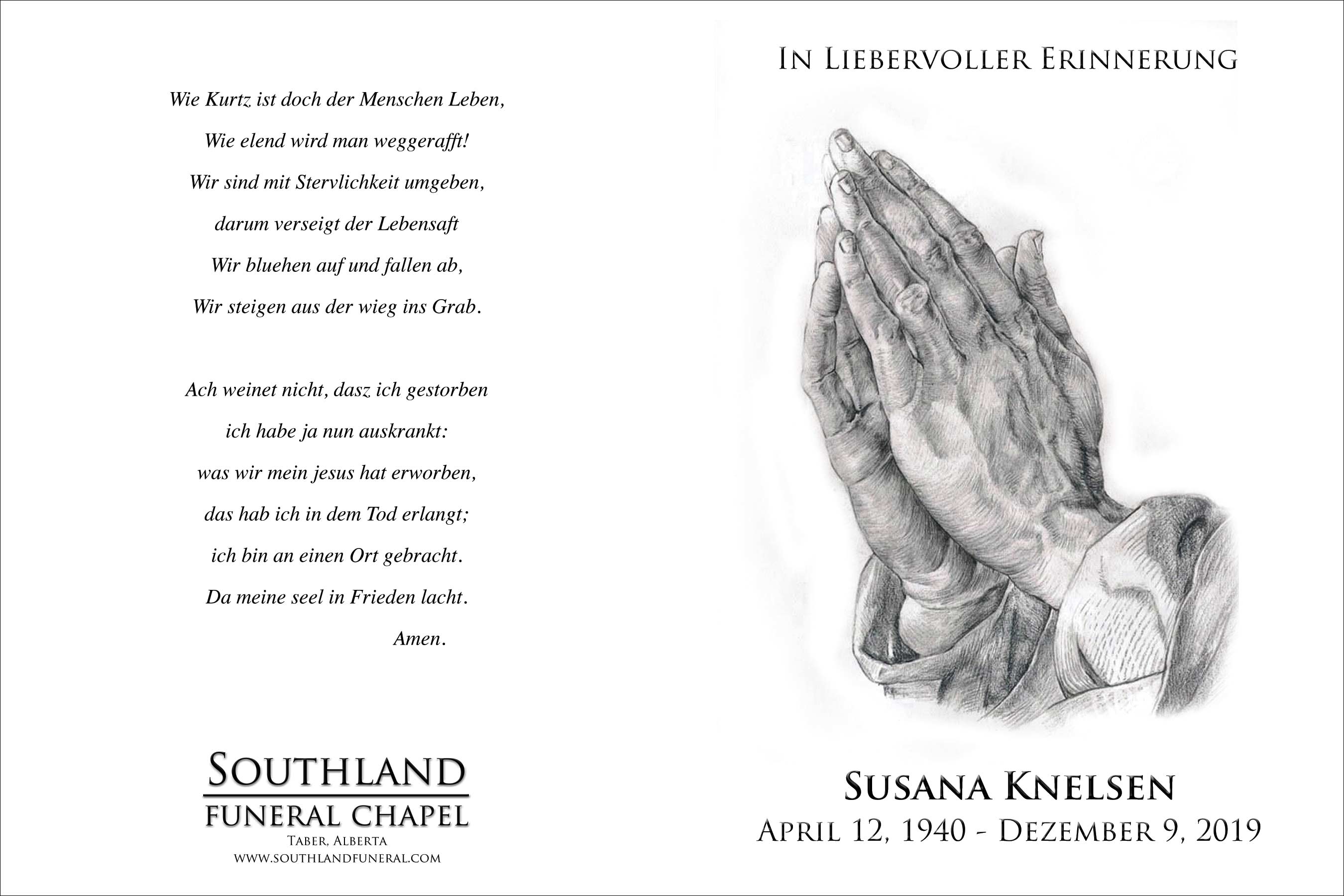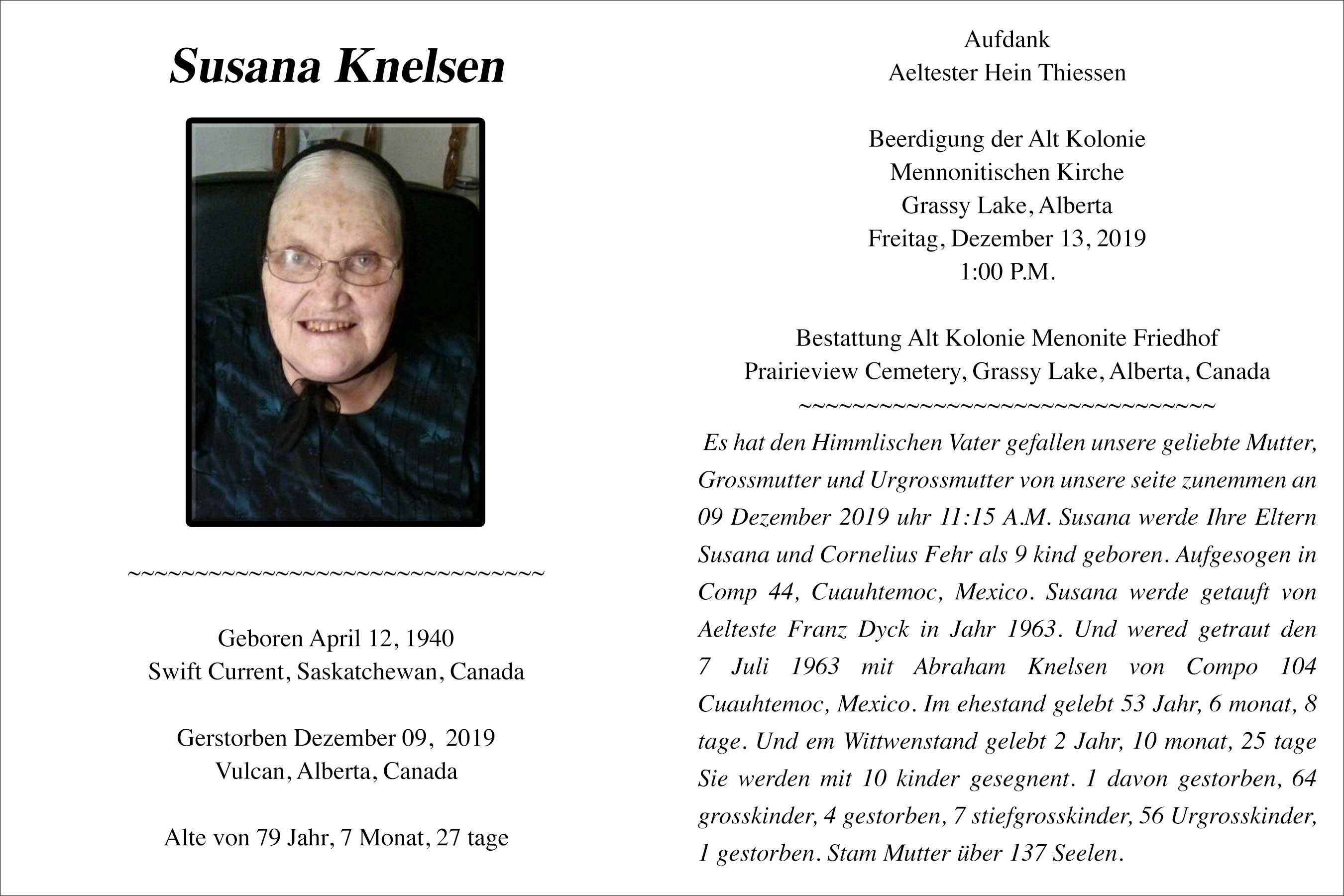 Susana Knelsen, beloved wife of the late Abraham Knelsen, passed away in Vulcan on Monday, December 9, 2019 at the age of 79 years.