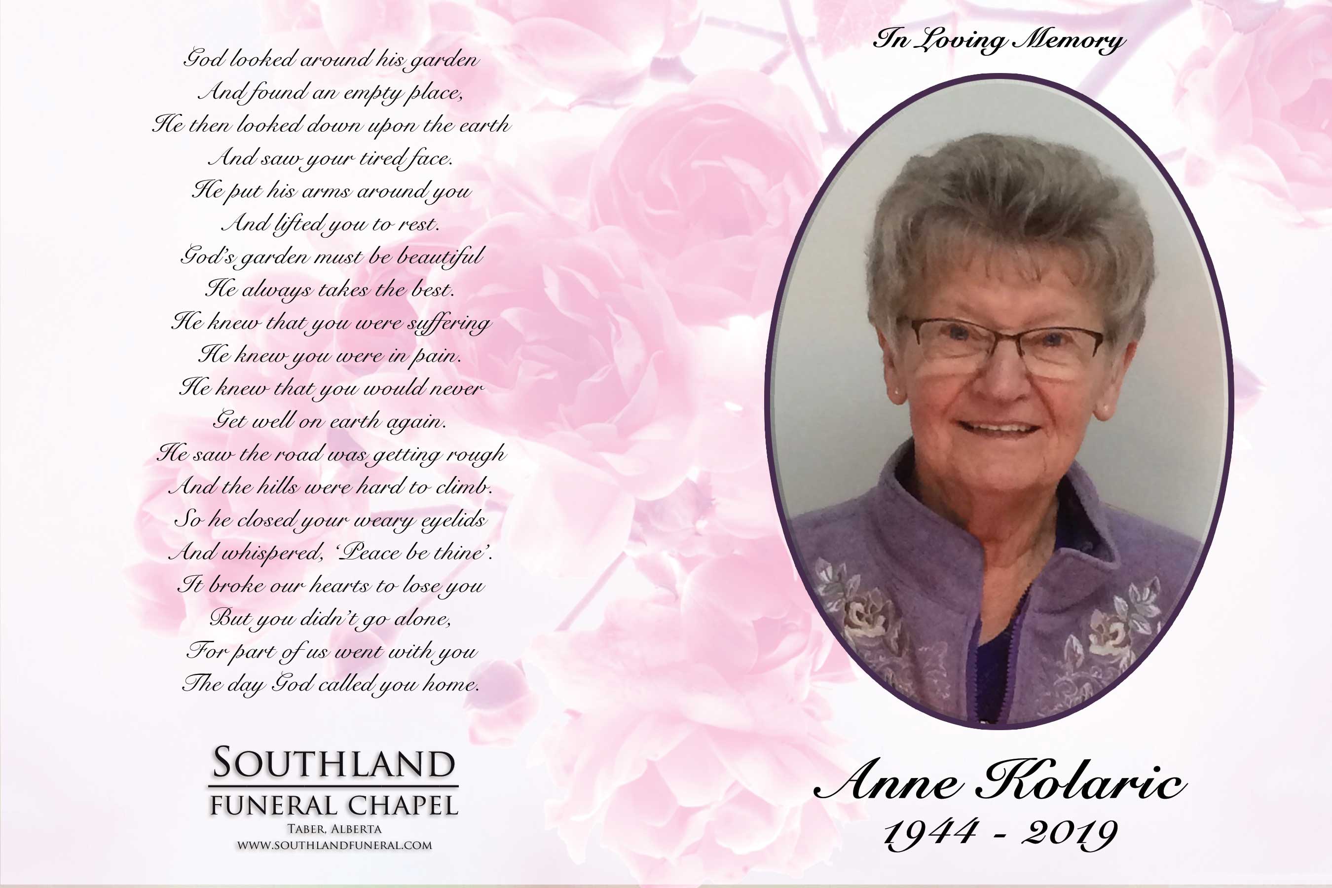 Anne is survived by her husband Mijo “Mike” Kolaric and two children, Lisa (Barrie) Ensign and John Kolaric all of Lethbridge; her grandchildren Megan (Brad) Tomlinson, Taylor Ensign and Charlize Kolaric and her great grandchild Rylie. She is also survived by her brothers Mike (Mary) Gockij and Frank Gockij; sister Stephanie Taillefer and by numerous nieces and nephews.