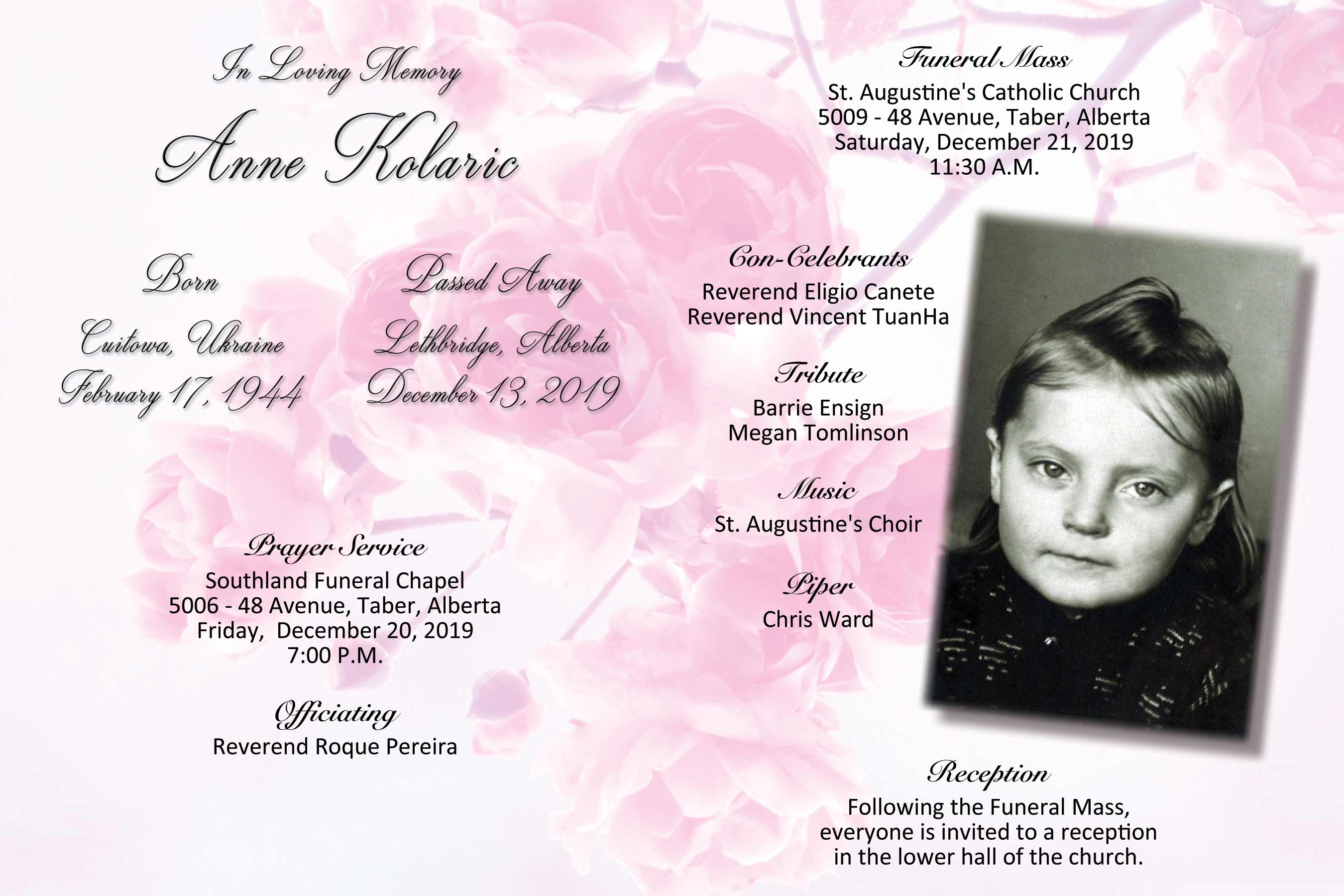 The Funeral Mass was celebrated at St. Augustine's Catholic Church, 5009 - 48 Avenue, Taber on Saturday, December 21, 2019 at 11:30 A.M.