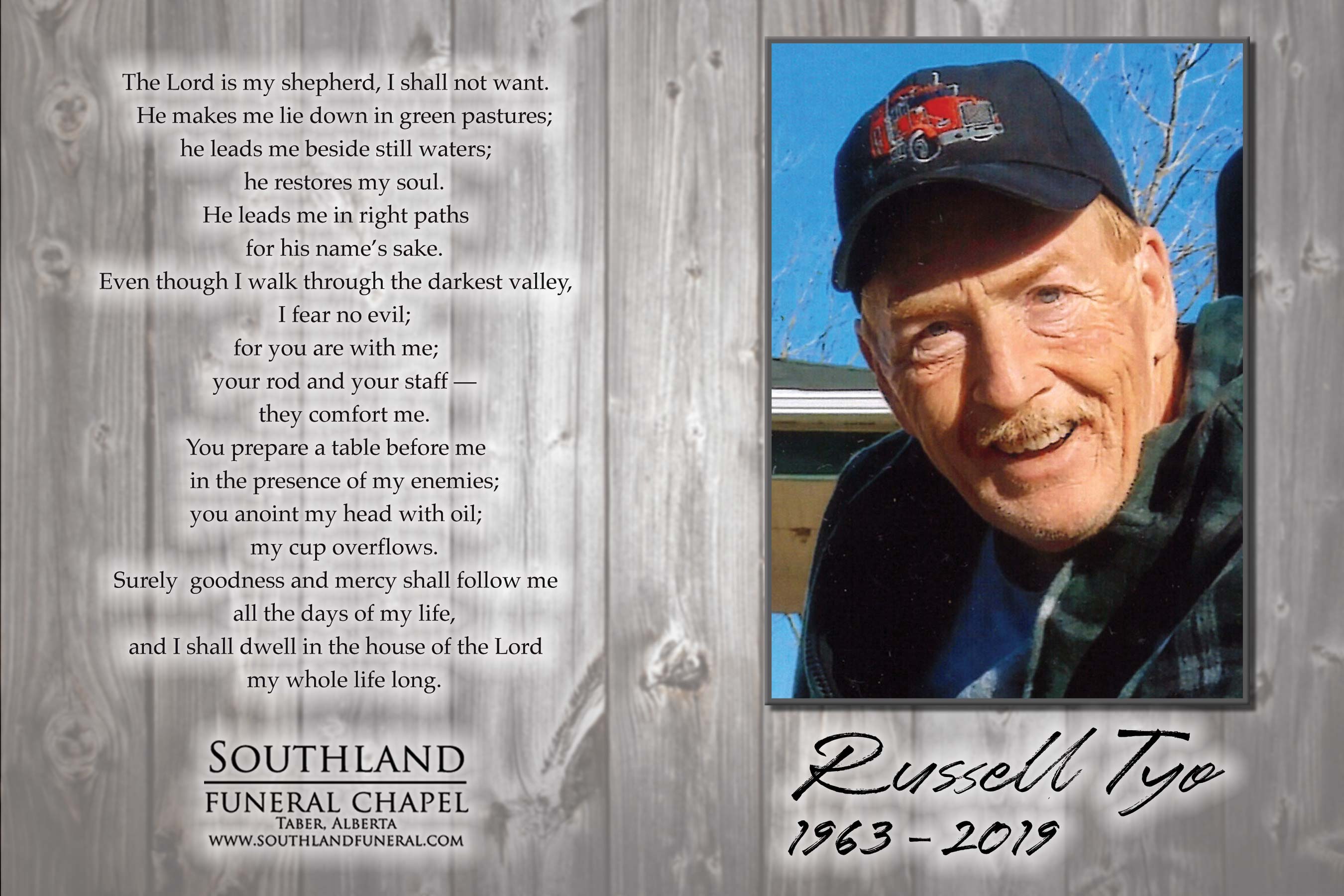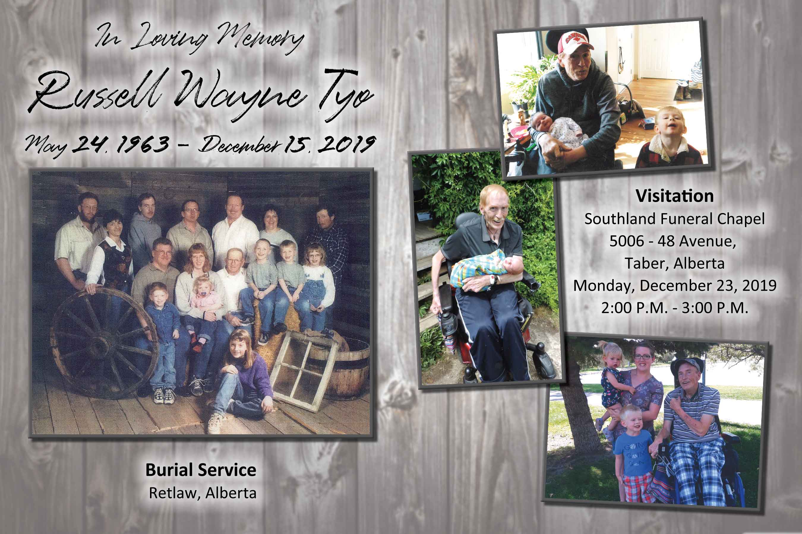 Russell Wayne Tyo, passed away peacefully with family at his side in Calgary on Sunday, December 15, 2019 at the age of 56 years.