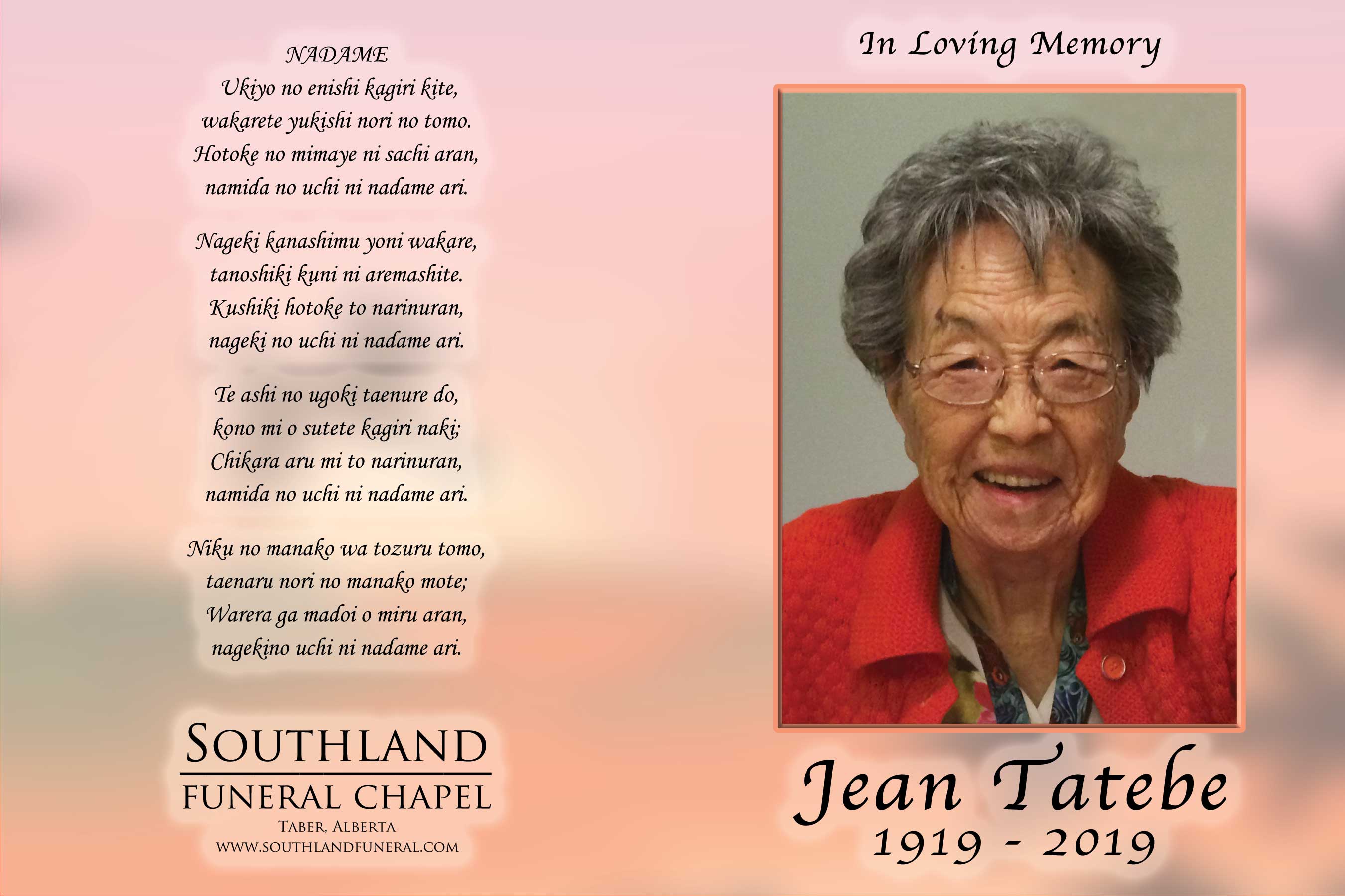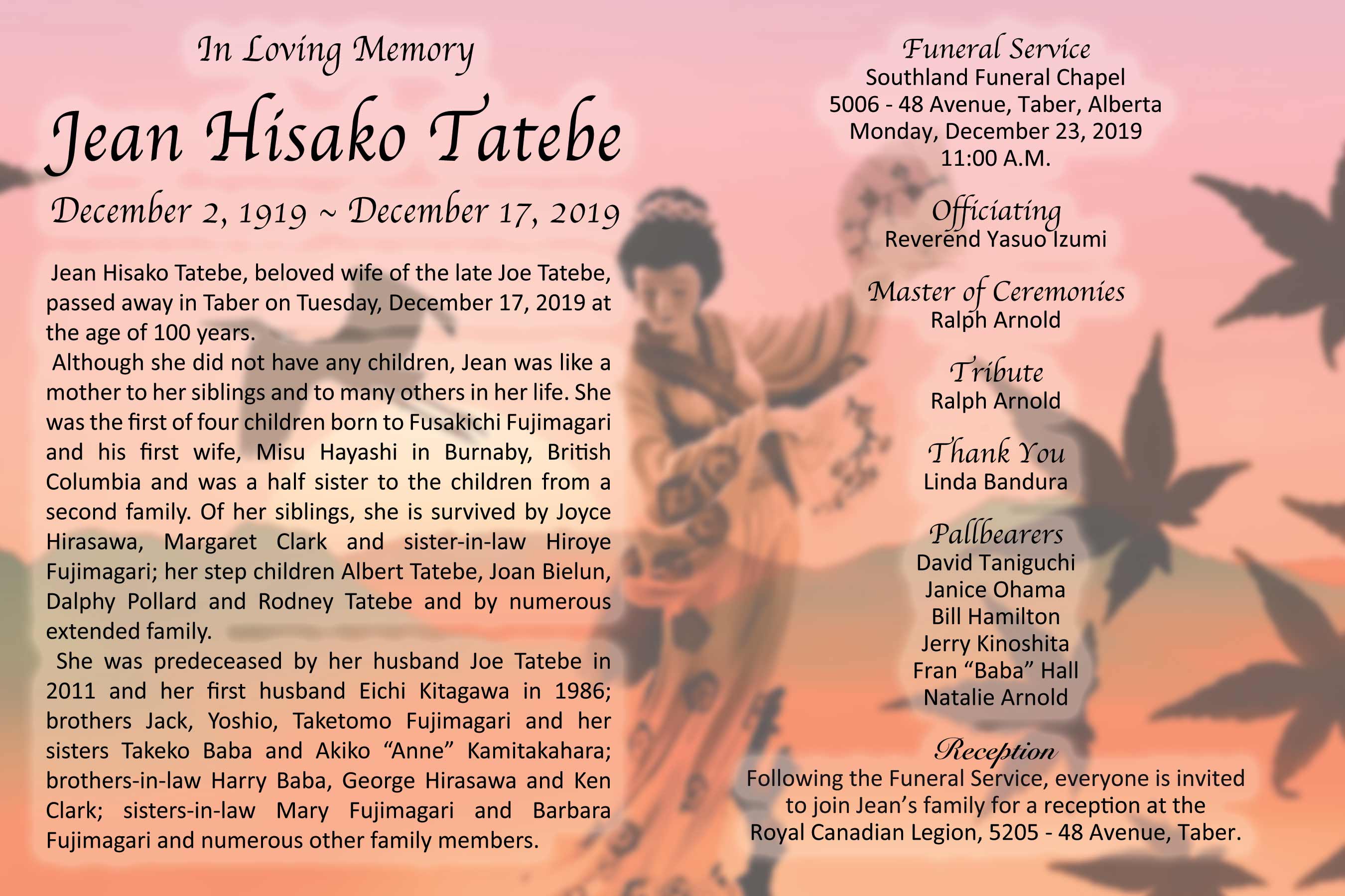Jean Hisako Tatebe, beloved wife of the late Joe Tatebe, passed away in Taber on Tuesday, December 17, 2019 at the age of 100 years.