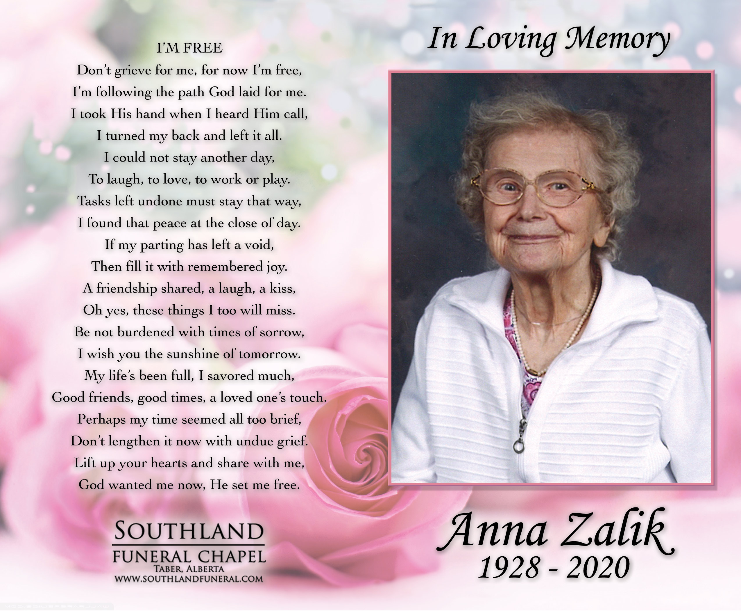Anna Zalik (nee Straub), a longtime resident of Coaldale, passed away at the Coaldale Health Centre on Friday, February 7, 2020 at the age of 91 years.