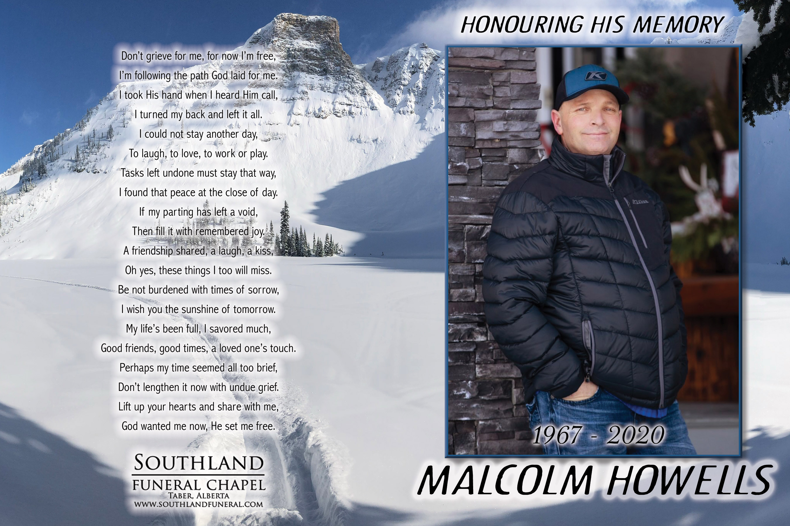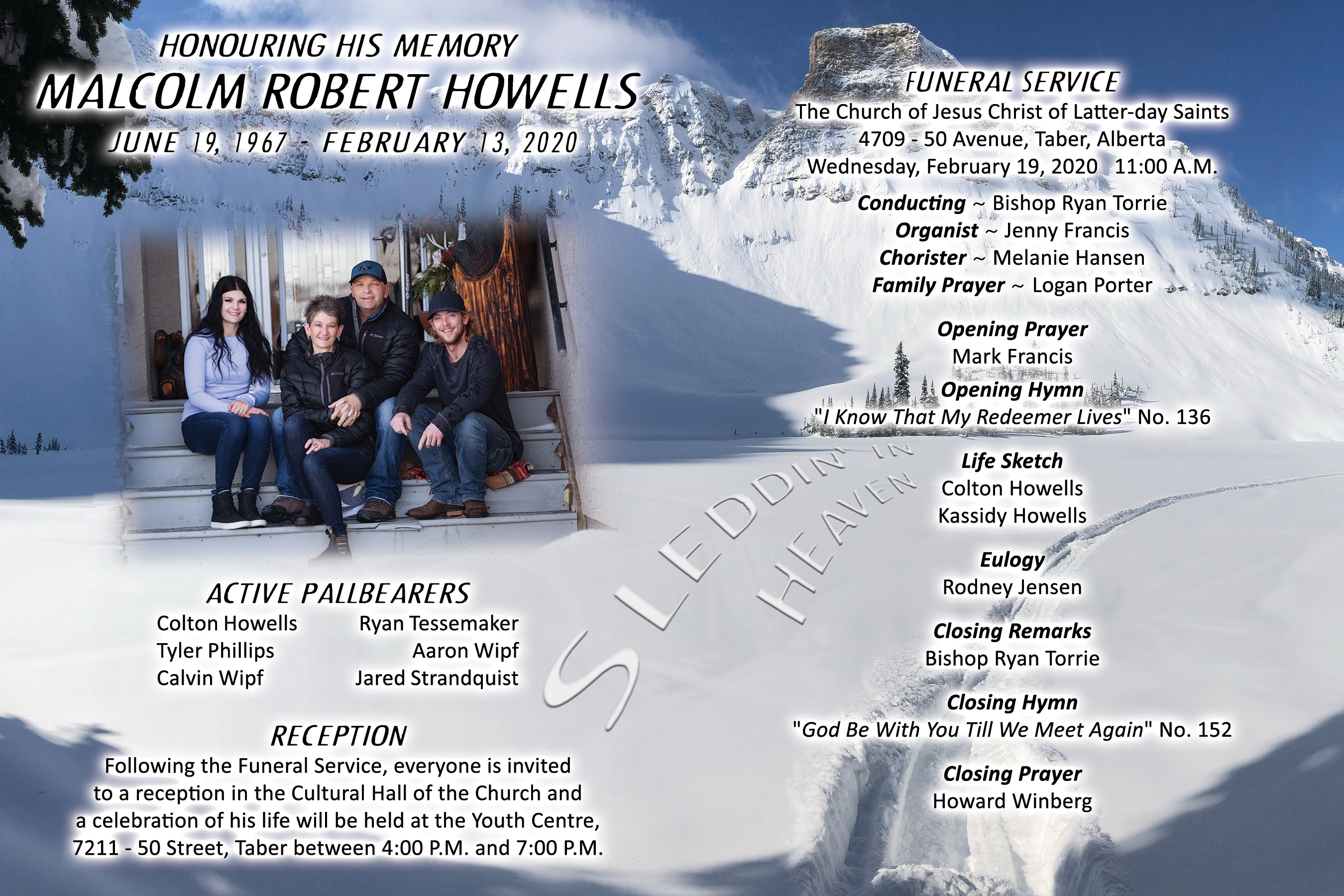 Relatives and friends were invited to meet with Malcolm’s family to celebrate his life at the Youth Centre, 7211 - 50 Street, Taber on Wednesday, February 19, 2020 between 4:00 P.M. and 6:00 P.M.
