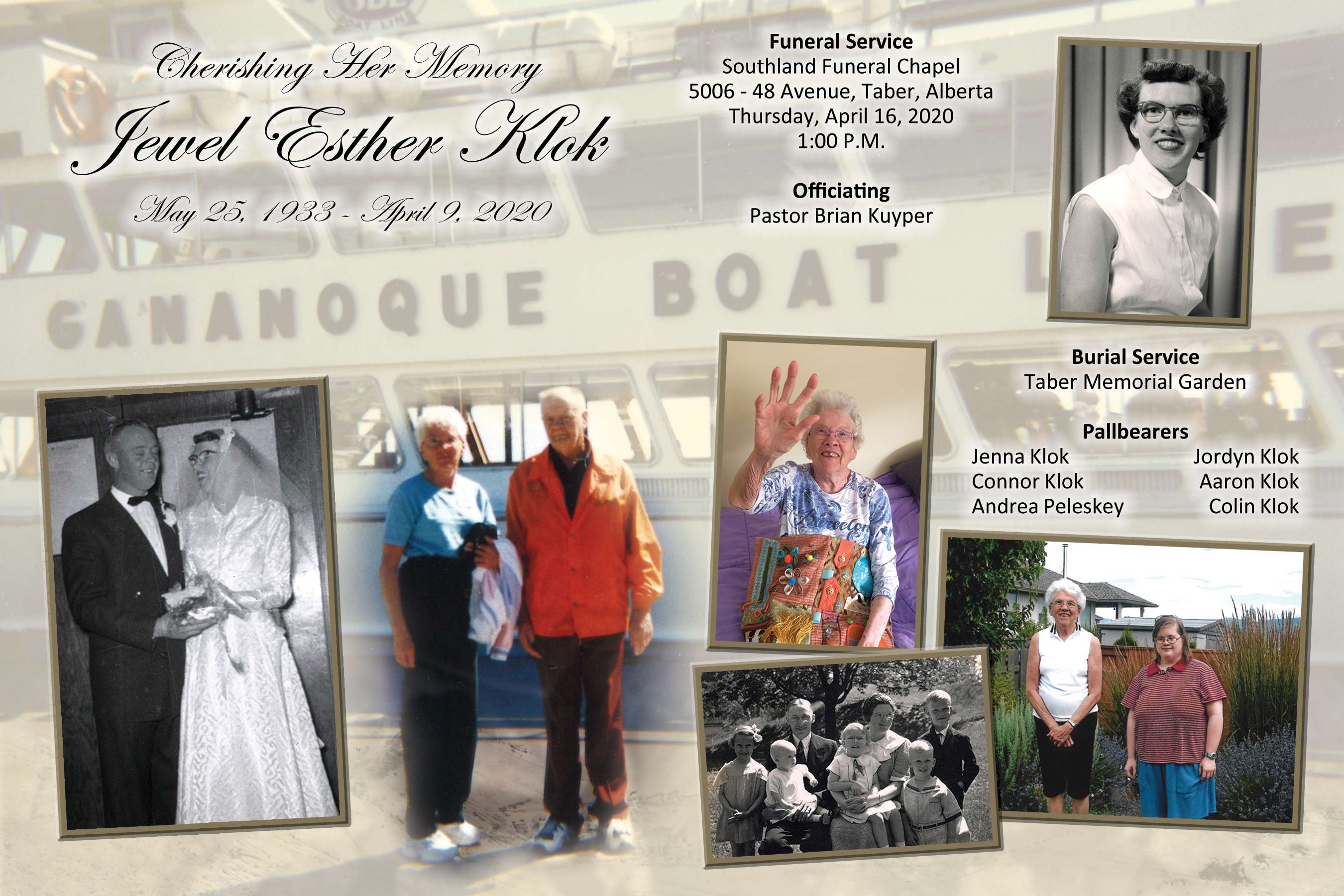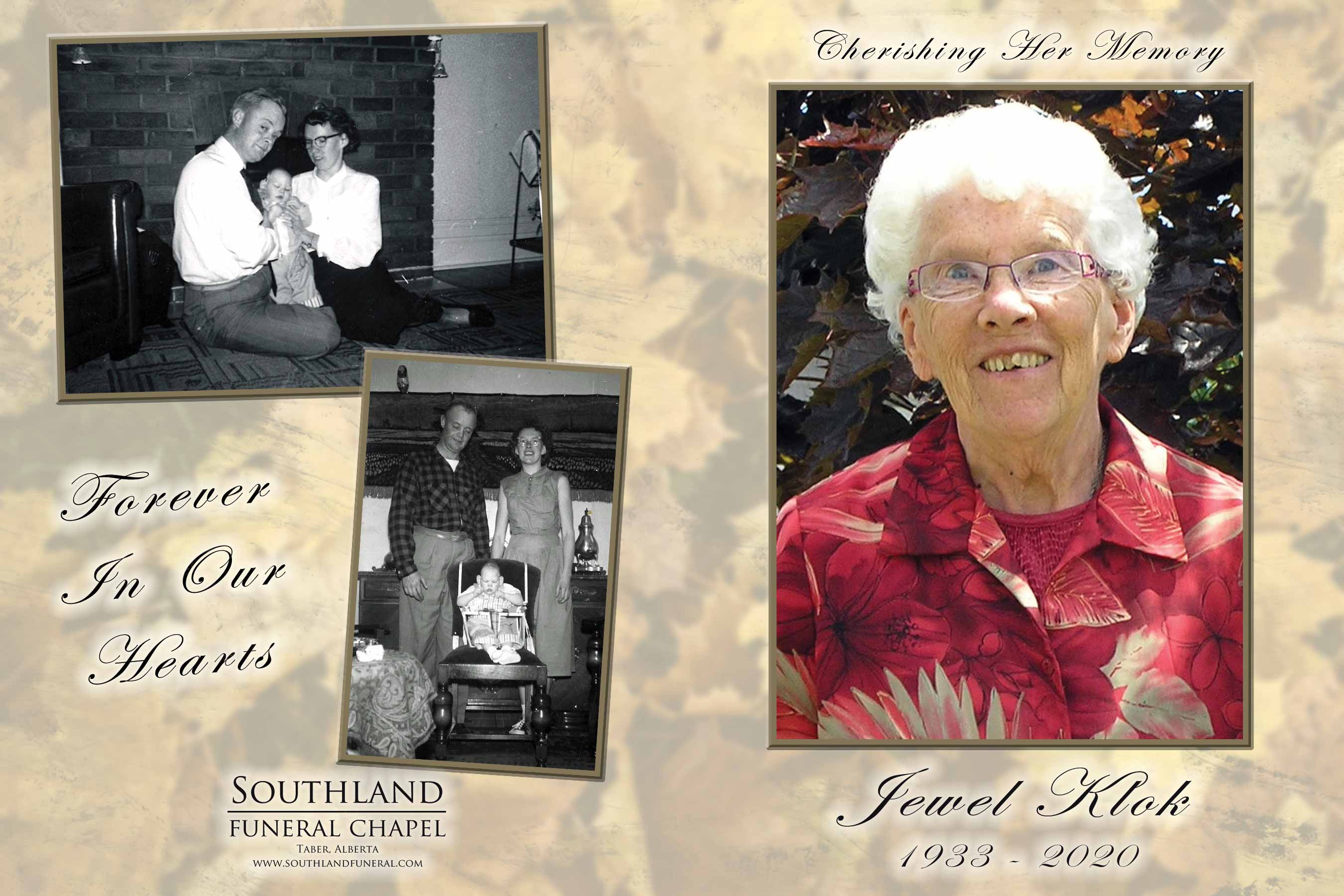 Jewel Esther Klok, beloved wife of the late John Klok, left peacefully to be with her Lord and Saviour on Thursday, April 9, 2020 at the age of 86 years.