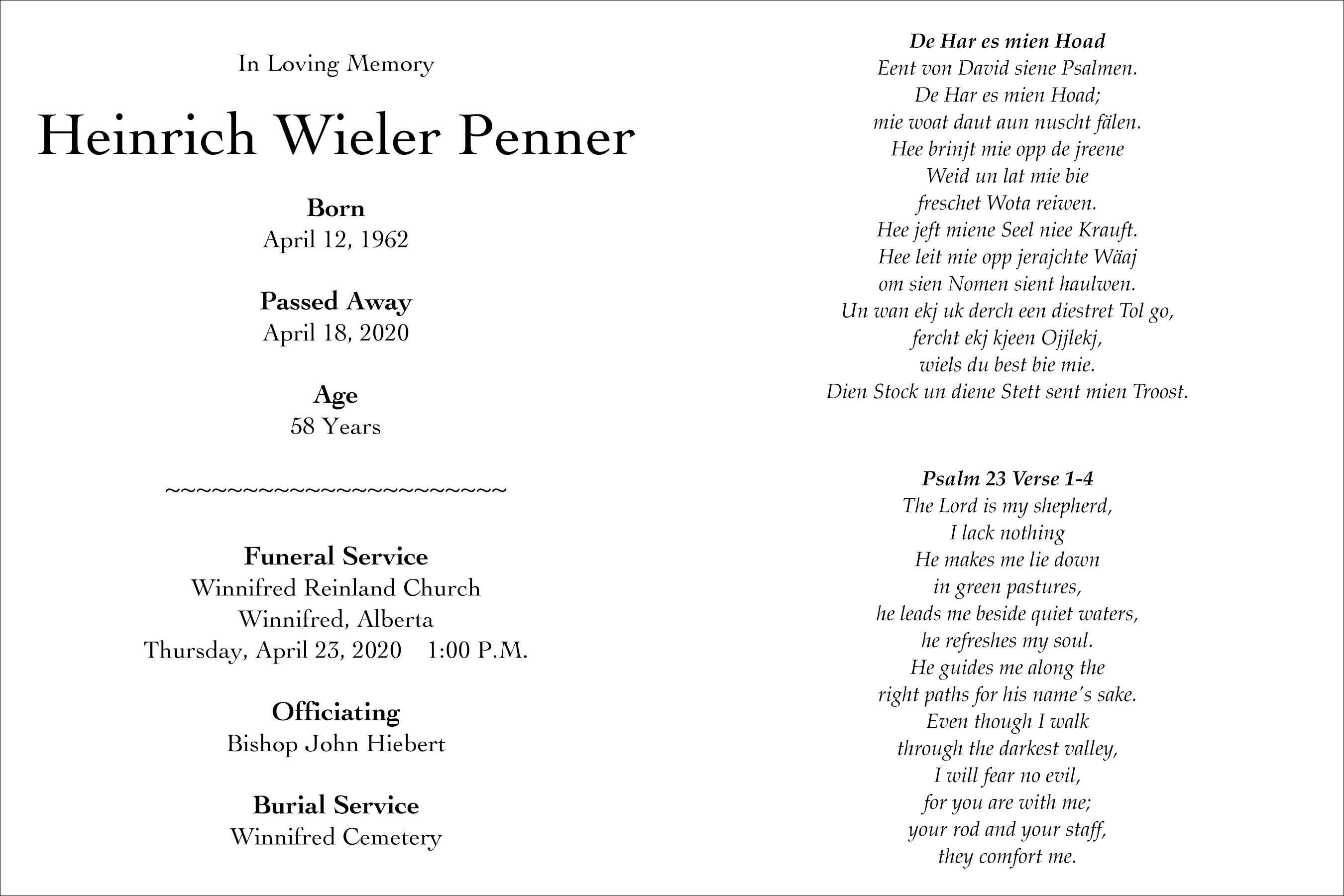 Heinrich Wieler Penner, beloved husband of Helena Penner, passed away in Bow Island on Saturday, April 18, 2020 at the age of 58 years.