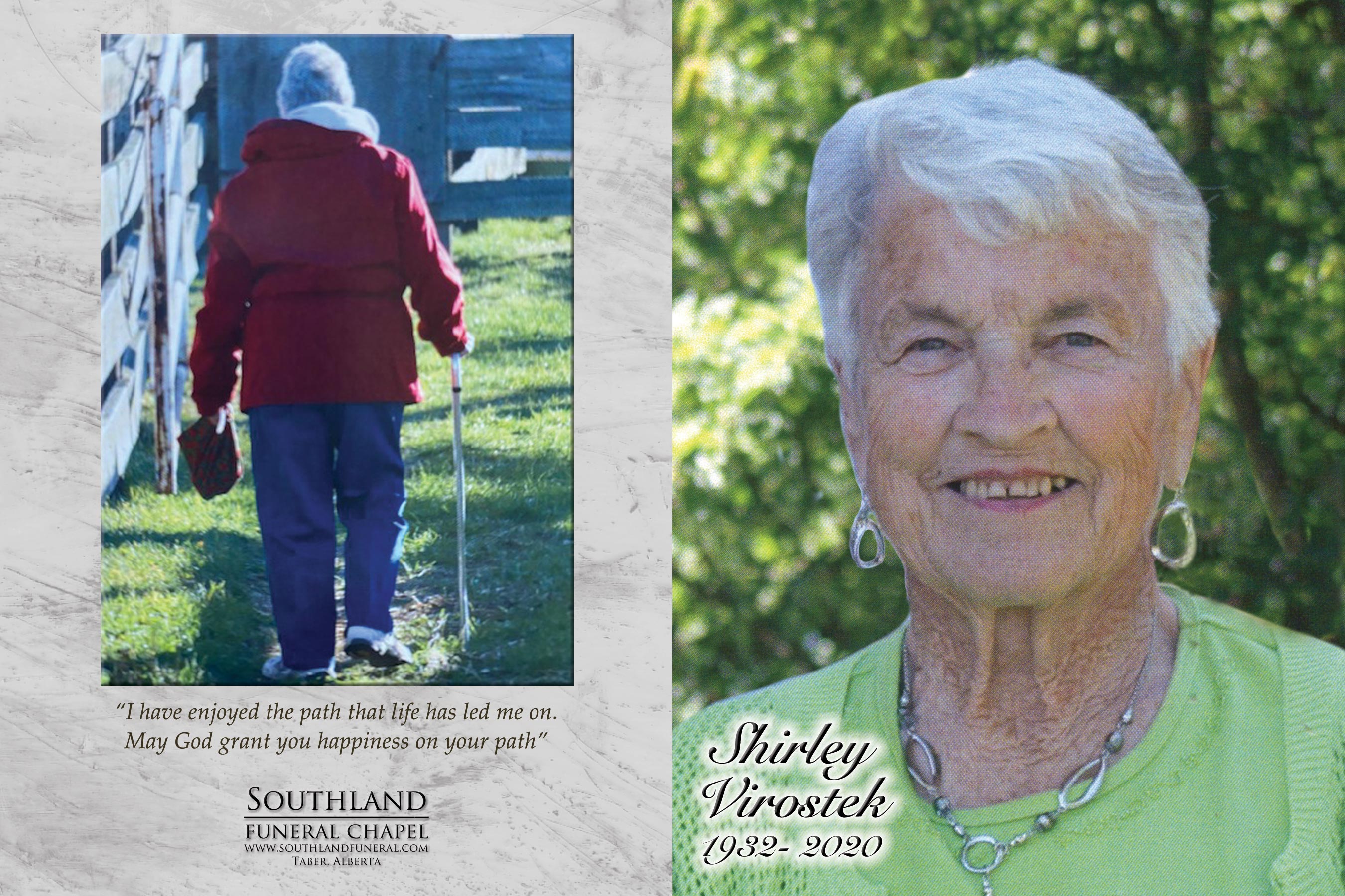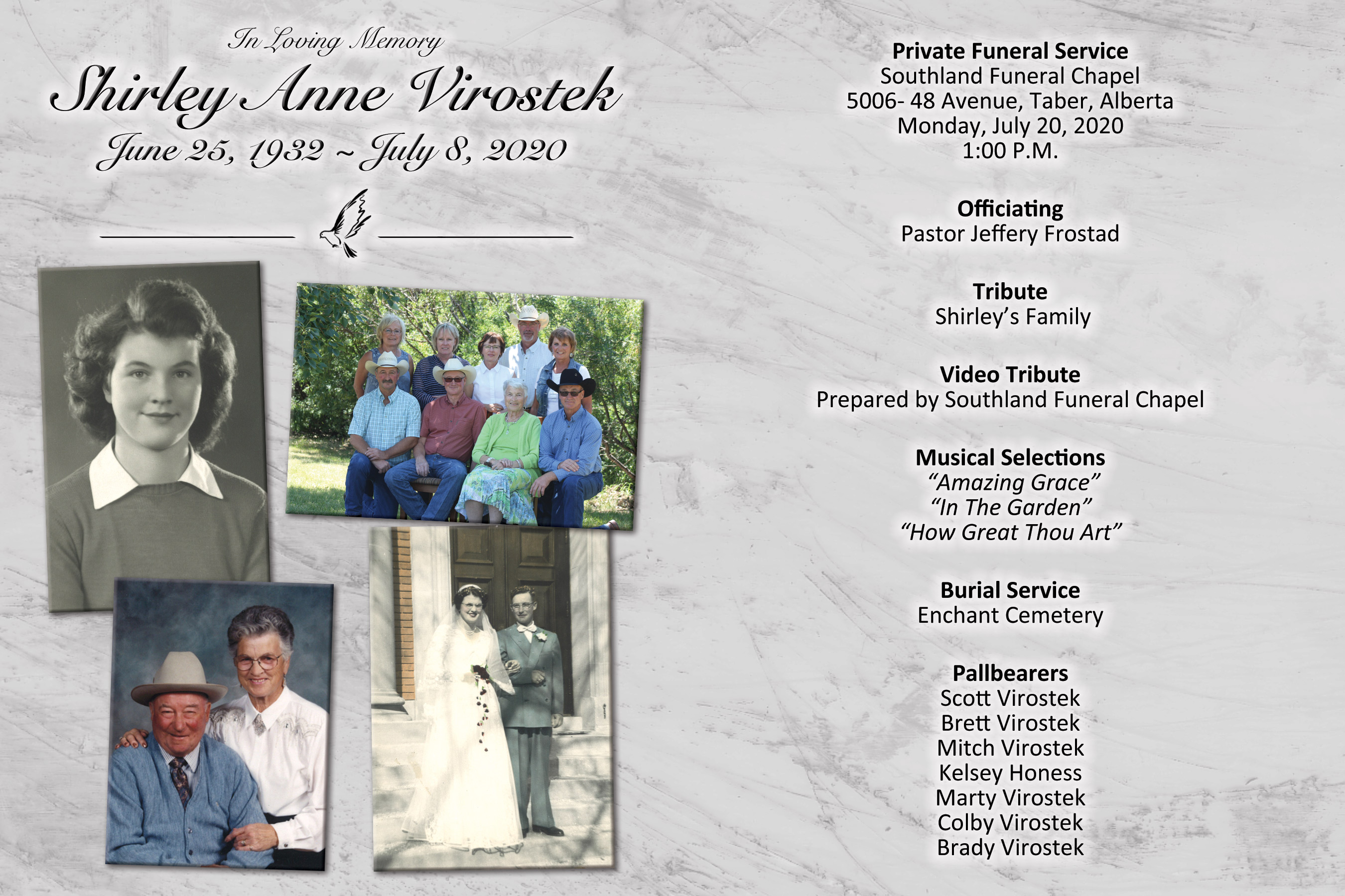 As a result of the restrictions regarding COVID-19, and the government’s recommendations, a private service was held at Southland Funeral Chapel on Monday, July 20, 2020. A private burial followed at the Enchant Cemetery. A public service in celebration of Shirley’s life will be held at a later time when we can all gather together safely.