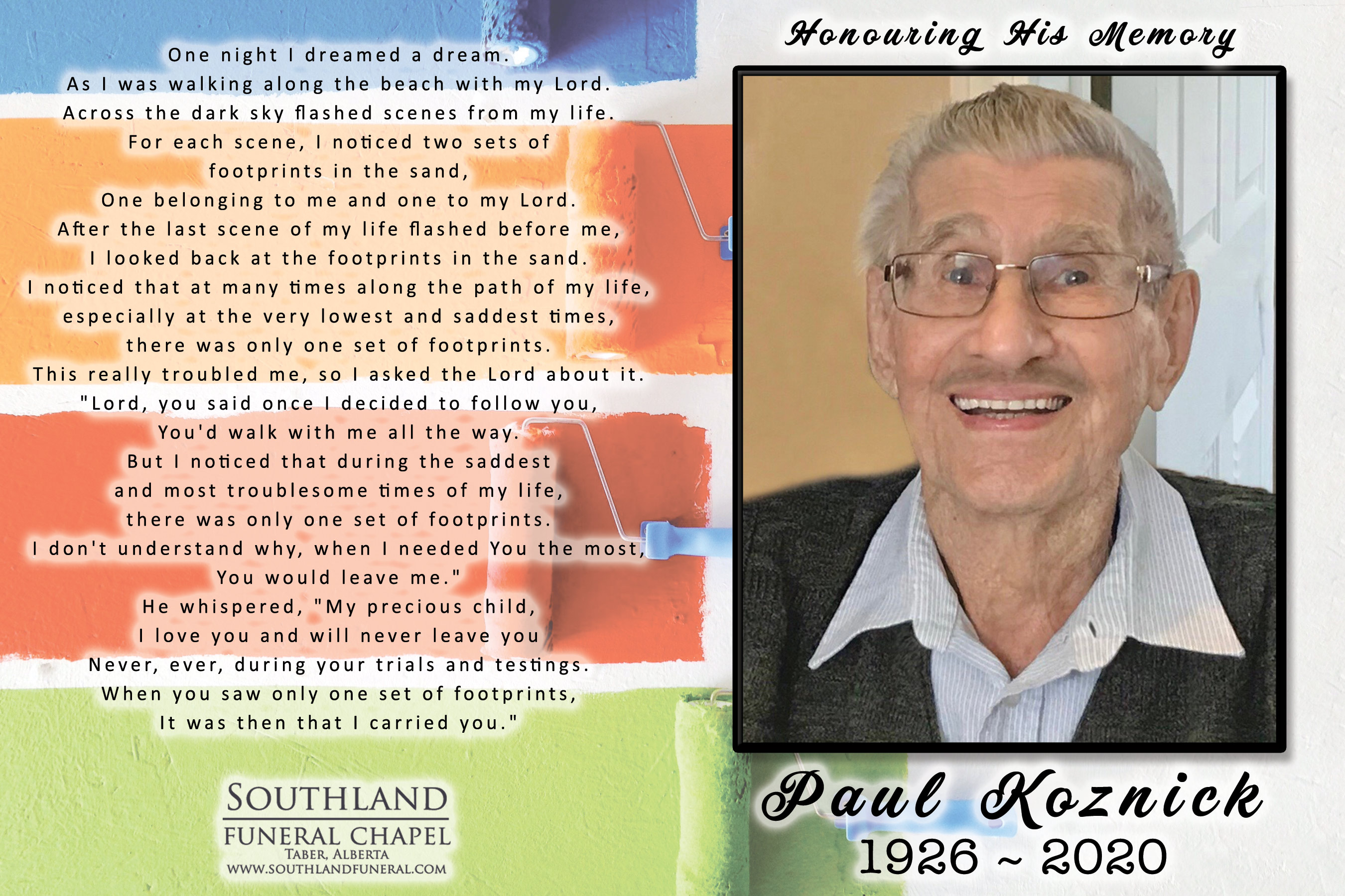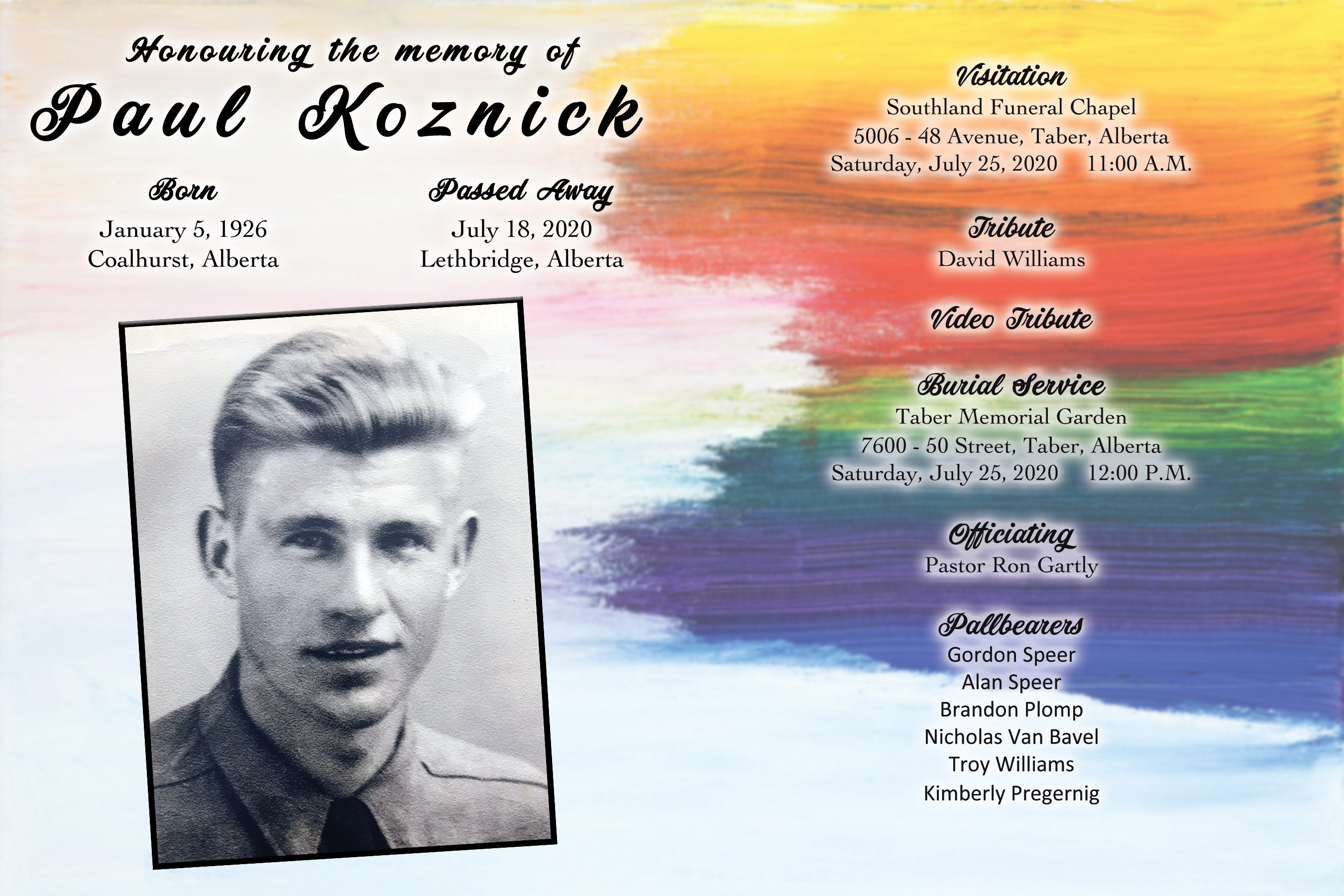 Paul Koznick, beloved husband of the late Margaret Koznick of sixty four years, passed away in Lethbridge on Saturday, July 18, 2020 at the age of 94 years.