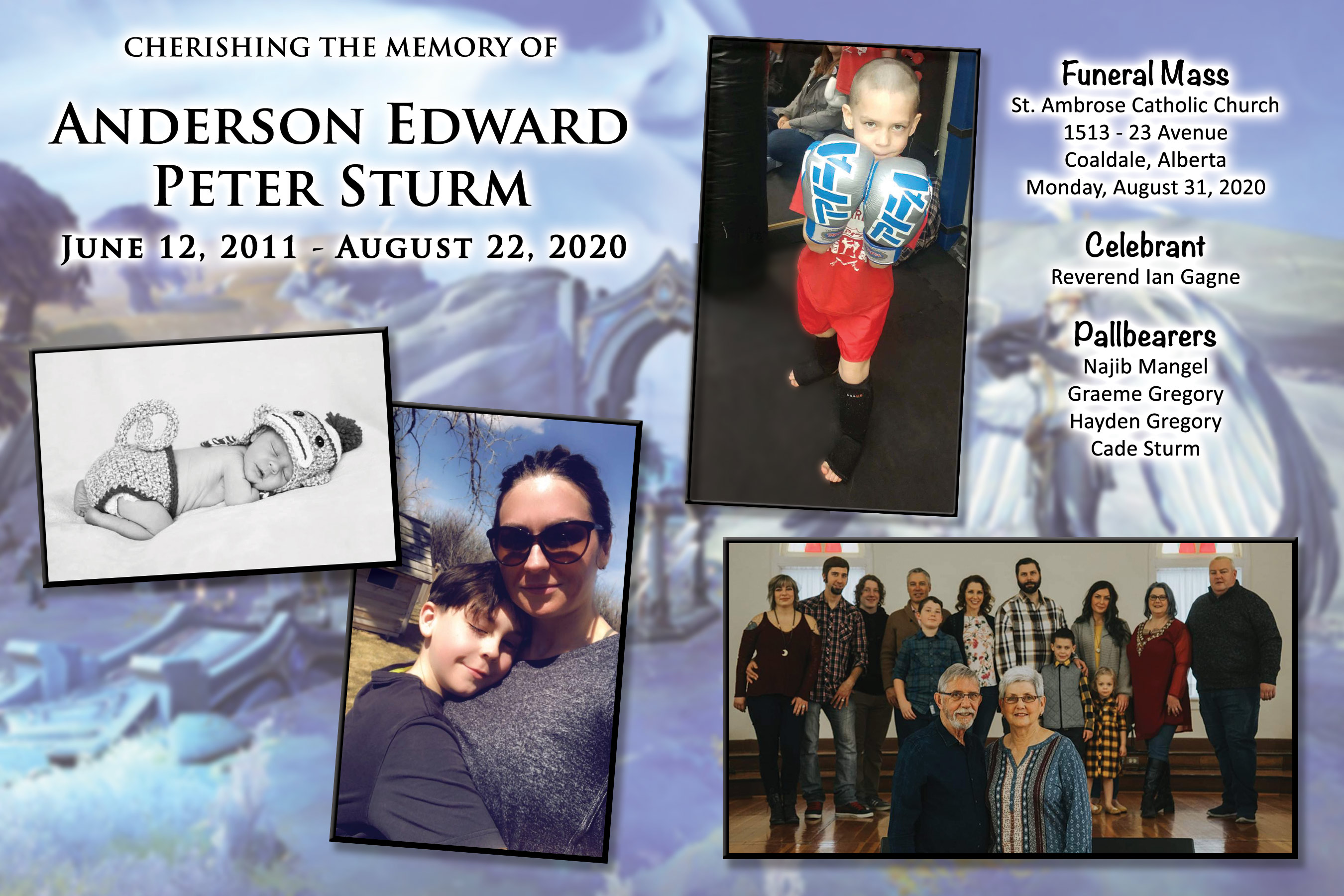 Anderson Edward Peter Sturm, beloved son of Tate and Angela Sturm, and beloved brother of Georgia, passed away in Lethbridge on Saturday, August 22, 2020 at the age of 9 years.