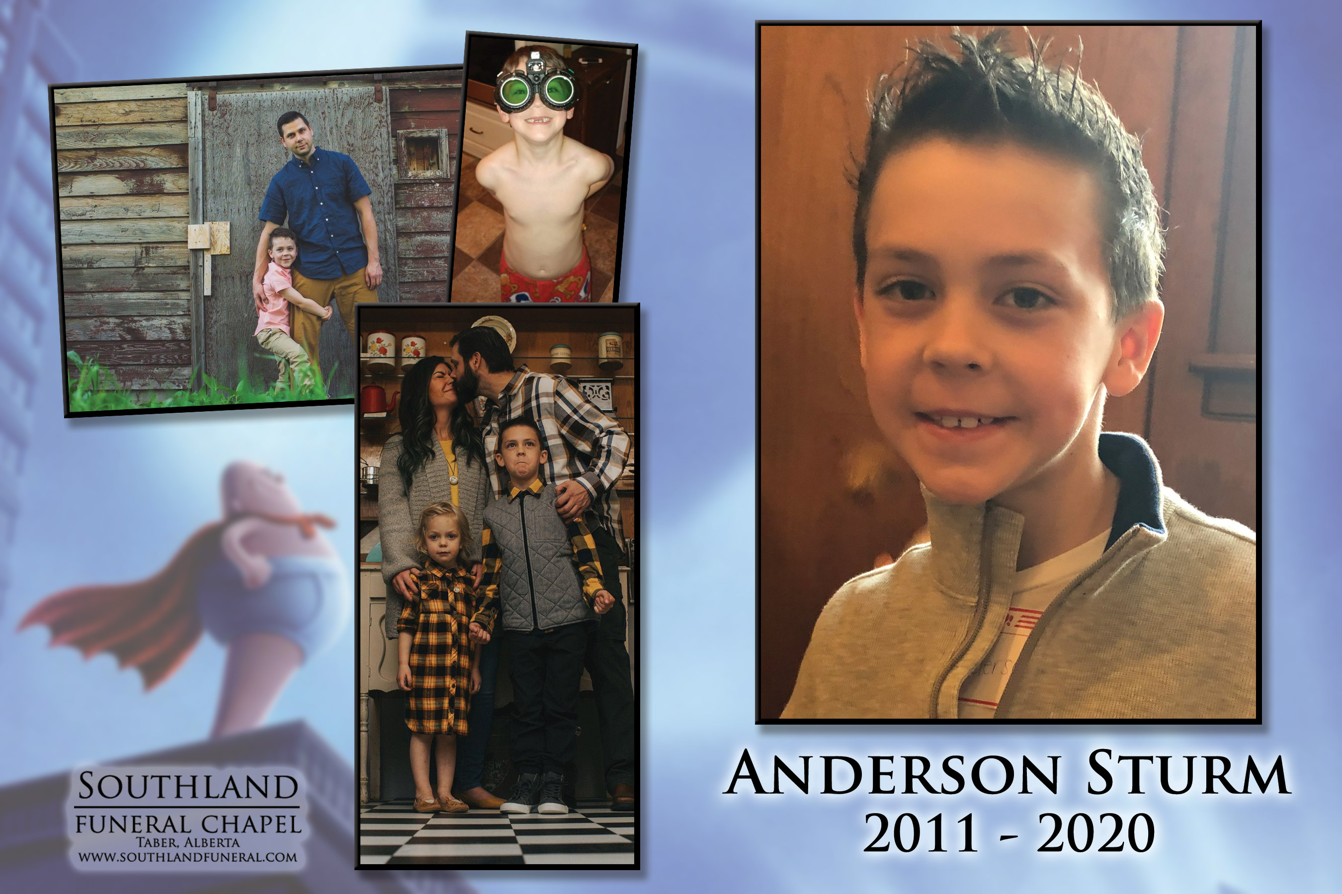 Anderson will be dearly missed by his parents Tate and Angela Sturm and little sister Georgia Sturm; grandparents Bonnie and Dwayne Sturm; aunts Jolie (Gareth) McCleave, Janay (Kevin) Gregory, Stephanie Sturm, Natalia (Larry) Laughlin, Ashley (Cody) Hofman and Brittany Vogel; uncles Cade Sturm, Todd Larson Kris (Elaine) Fischer. He will also be lovingly remembered by his cousins Hayden, Graeme, Kelly, Rodney, Lane and Brooklyn who were his best friends and they will miss his imagination, laughter and excitement for what was around the next corner.