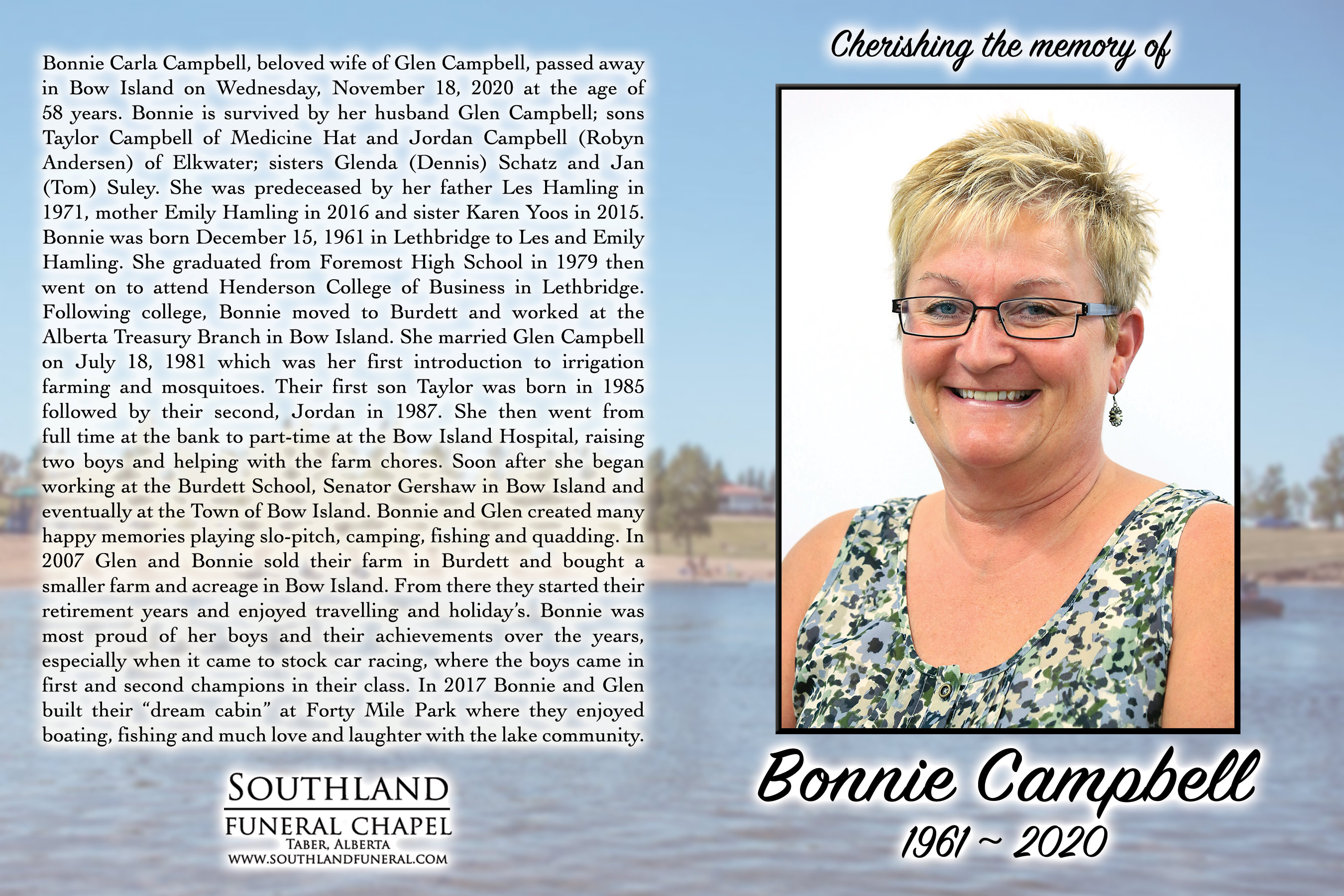 Bonnie was born December 15, 1961 in Lethbridge to Les and Emily Hamling. She graduated from Foremost High School in 1979 then went on to attend Henderson College of Business in Lethbridge. Following college, Bonnie moved to Burdett and worked at the Alberta Treasury Branch in Bow Island. She married Glen Campbell on July 18, 1981 which was her first introduction to irrigation farming and mosquitoes. Their first son Taylor was born in 1985 followed by their second, Jordan in 1987. She then went from fulltime at the bank to part-time at the Bow Island Hospital, raising two boys and helping with the farm chores. Soon after she began working at the Burdett School, Senator Gershaw in Bow Island and eventually at the Town of Bow Island. Bonnie and Glen created many happy memories playing slopitch, camping, fishing and quadding. In 2007 Glen and Bonnie sold their farm in Burdett and bought a smaller farm and acreage in Bow Island. From there they started their retirement years and enjoyed travelling and holiday’s. Bonnie was most proud of her boys and their achievements over the years, especially when it came to stock car racing, where the boys came in first and second champions in their class. In 2017 Bonnie and Glen built their “dream cabin” at Forty Mile Park where they enjoyed boating, fishing and much love and laughter with the lake community.