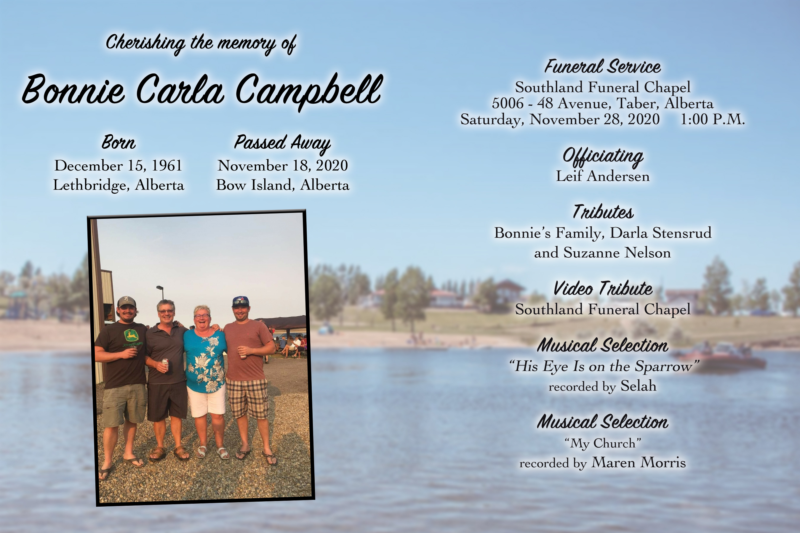 Bonnie is survived by her husband Glen Campbell; sons Taylor Campbell of Medicine Hat and Jordan Campbell (Robyn Andersen) of Elkwater; sisters Glenda (Dennis) Schatz and Jan (Tom) Suley.