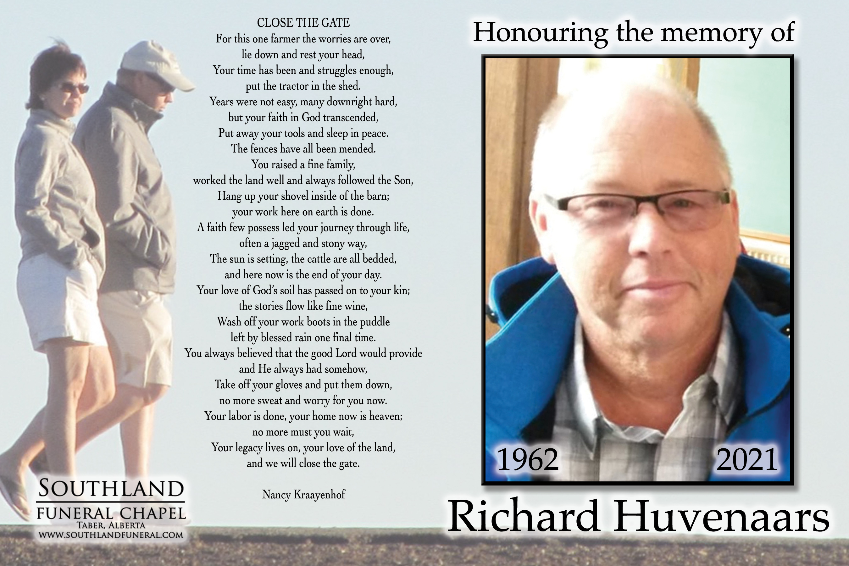 Richard John Huvenaars, beloved husband of Linda Huvenaars, passed away in Lethbridge on Sunday, March 14, 2021 at the age of 58 years.