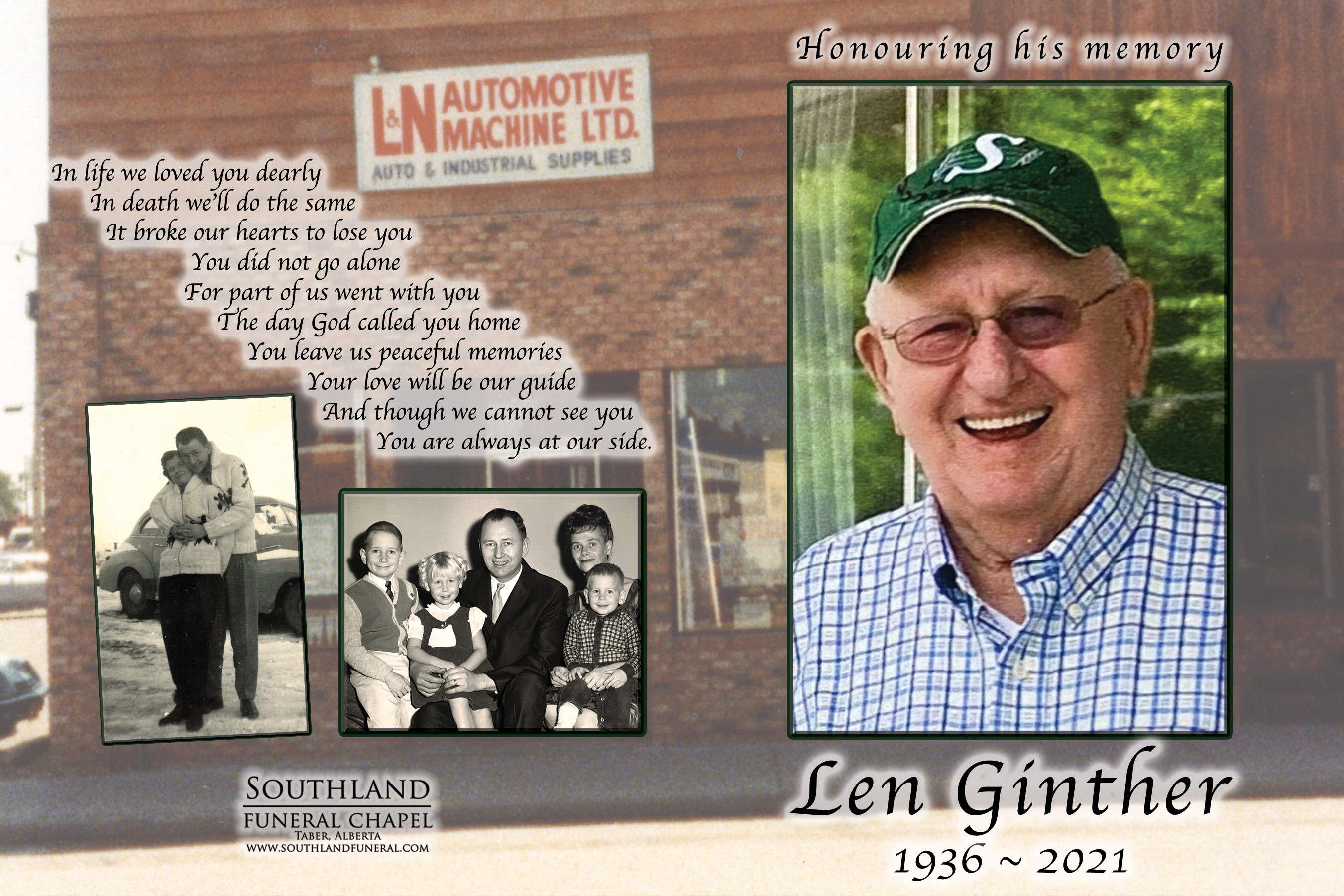 Len is survived by his children Jody (Mary) Ginther of Taber, Leni (Reed) Meachin of Coaldale and Todd (Rose) Ginther of Taber as well as his grandchildren Shane (Chloe), Brendan (Kaylin), Caitlin (Brock), Tamara (Joel), Emily and Allyson. He is also survived by his sister Joyce (Peter) Simard; sister-in-law and brothers-in-law Donna Ginther, Ted (Dolly) Stokes, Eunice Seidler, Butch (Linda) Stokes, Laurie-Ann Miller as well as numerous nieces and nephews.