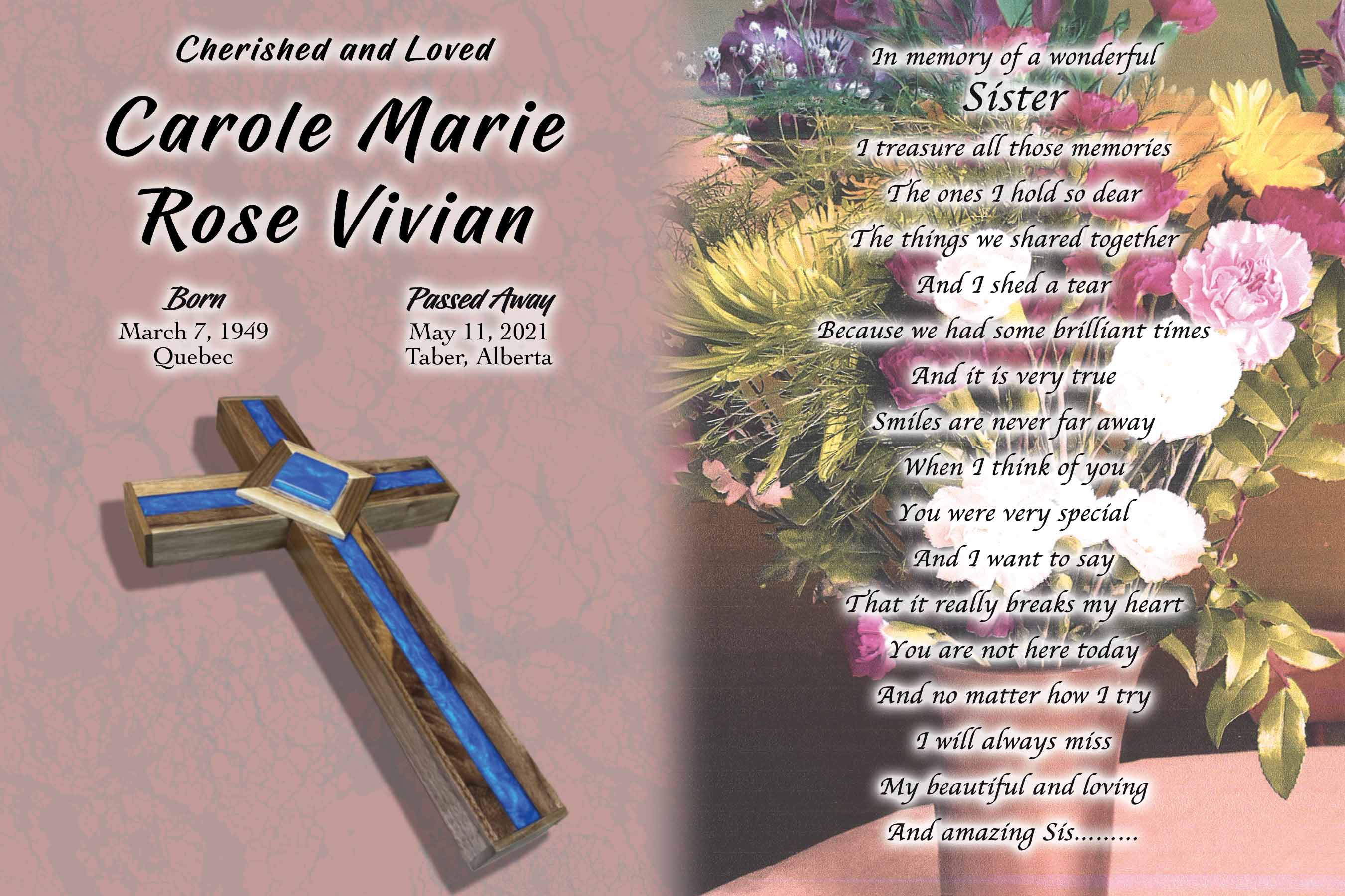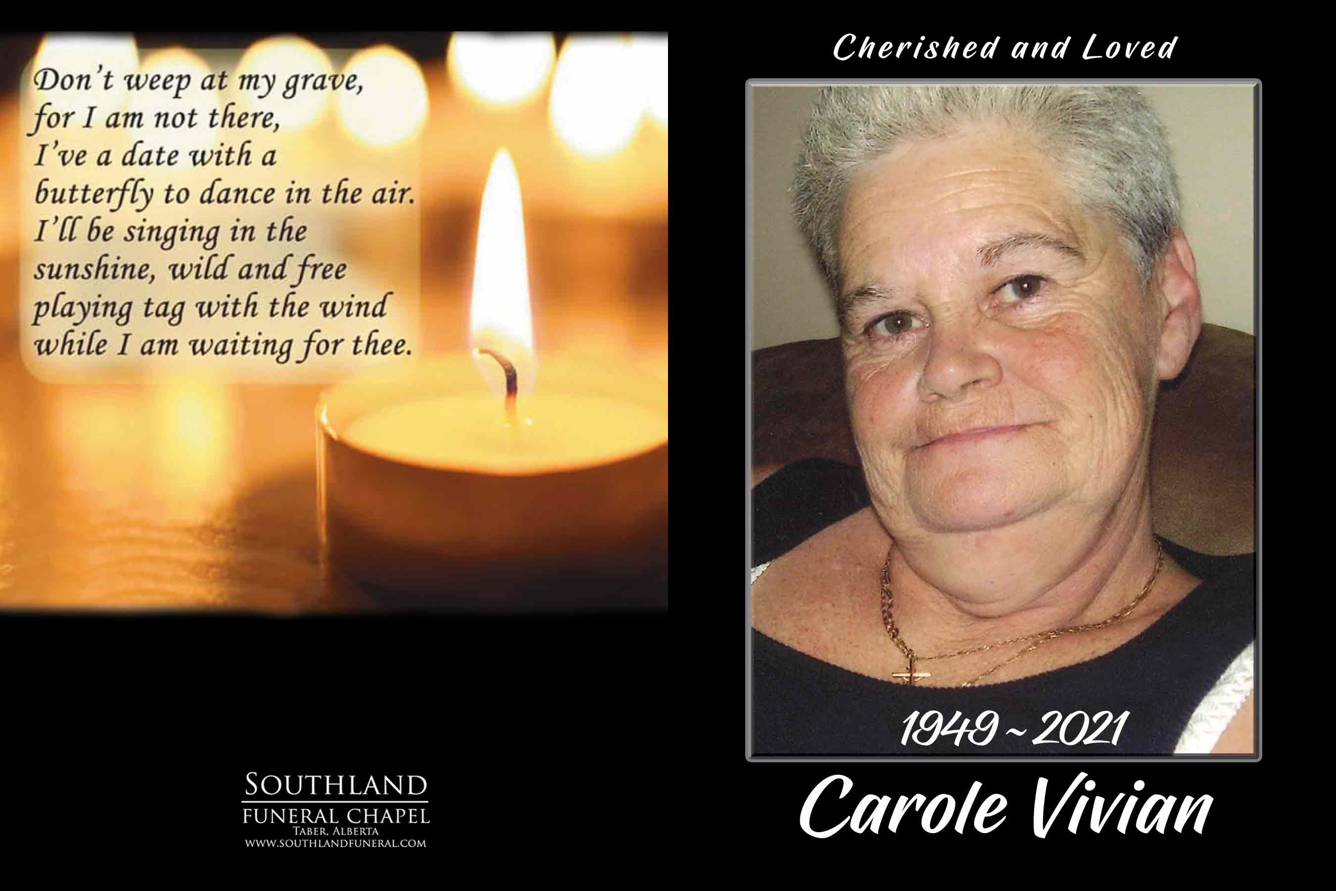 Carole Marie Rose Vivian, passed away in Taber on Tuesday, May 11, 2021 at the age of 72 years.