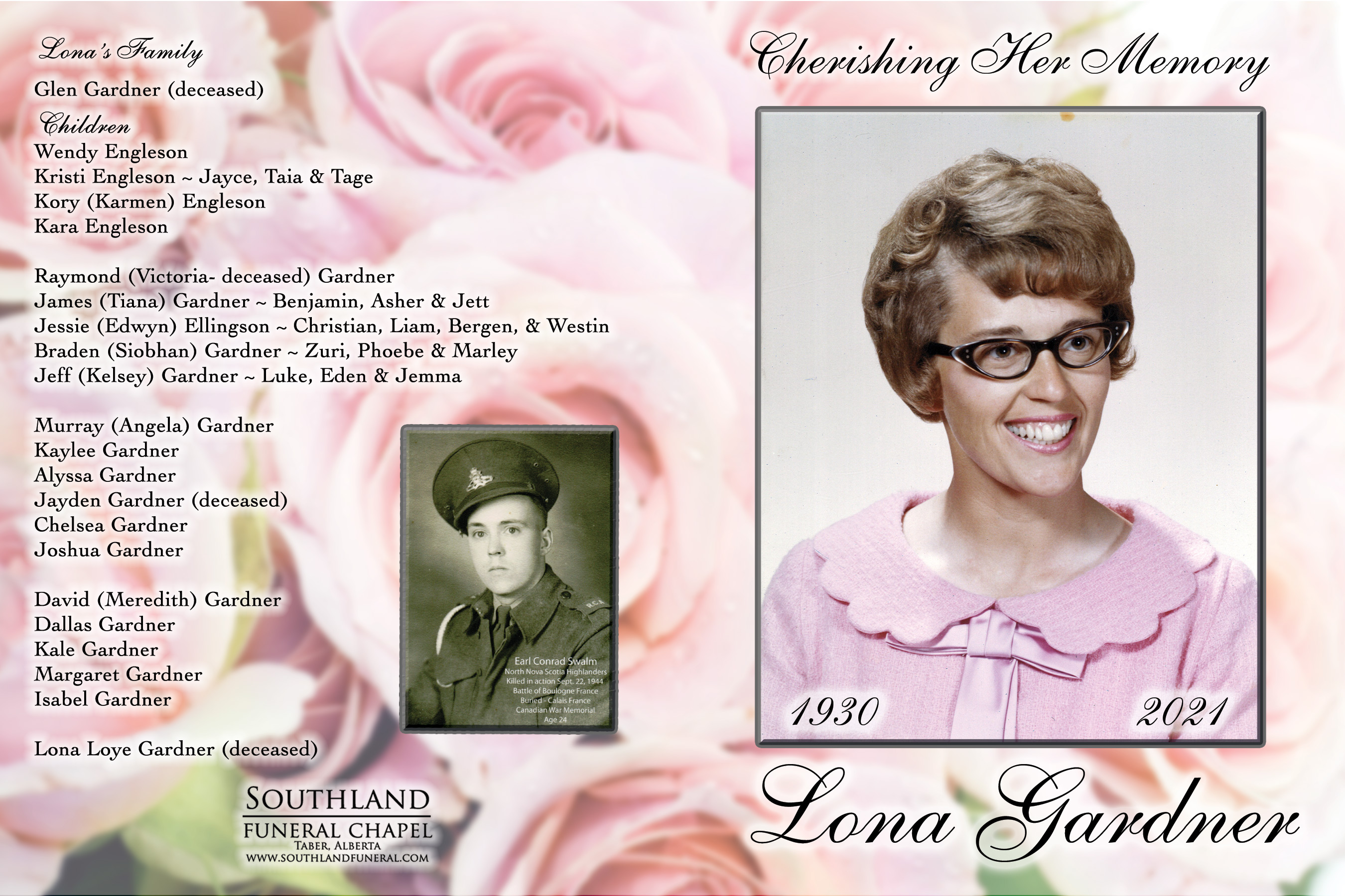 Lona is survived by her children Wendy Engleson of Taber and her family Kristi Engleson, Kory (Karmen) Engleson and Kara Engleson; Raymond (the late Victoria) Gardner of Taber and their family James (Tiana) Gardner, Jessie (Edwyn) Ellingson, Braden (Siobhan) Gardner and Jeff (Kelsey) Gardner; Murray (Angela) Gardner of Taber and their family Kaylee, Alyssa, Chelsea and Joshua Gardner; David (Meredith) Gardner of Paris, Ontario and his children Dallas and Kale Gardner and their children Margaret and Isabel Gardner; as well as sixteen great grandchildren. She is also survived by her sister Vera Schmidt and by her nieces and nephews.