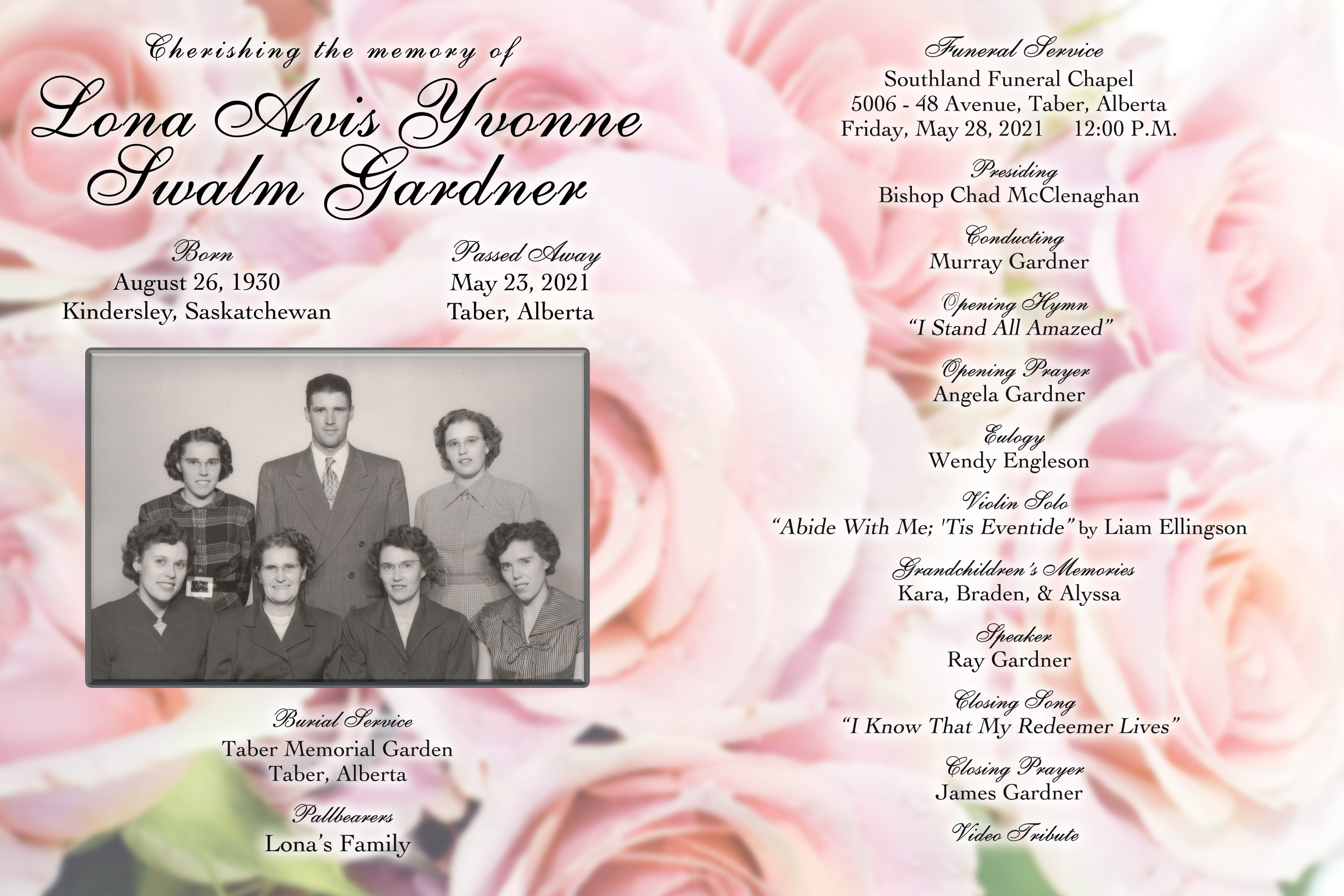 Lona Avis Yvonne Gardner (nee Swalm), wife of the late Glen Gardner, passed away in Taber on Sunday, May 23, 2021 at the age of 90 years.