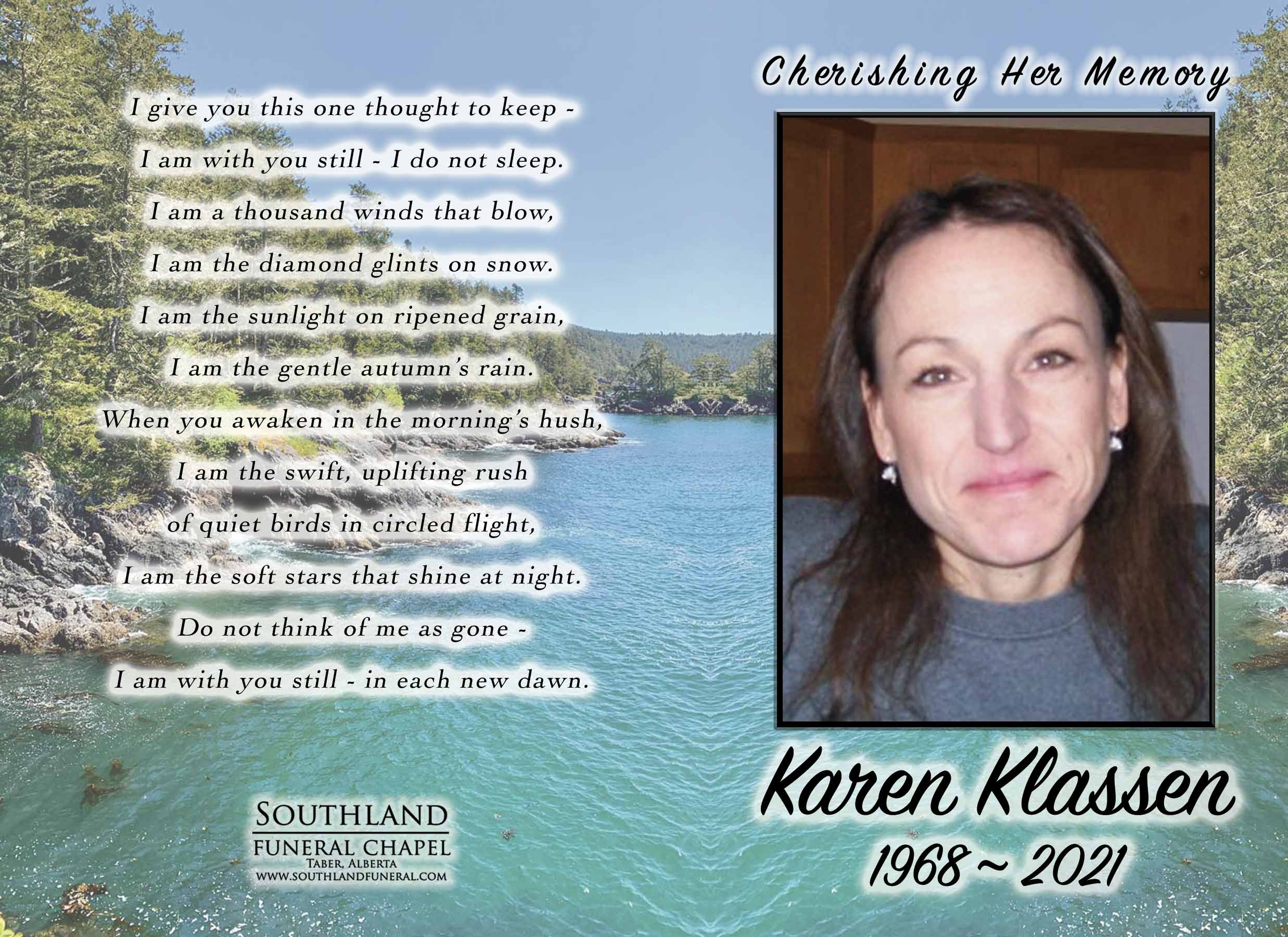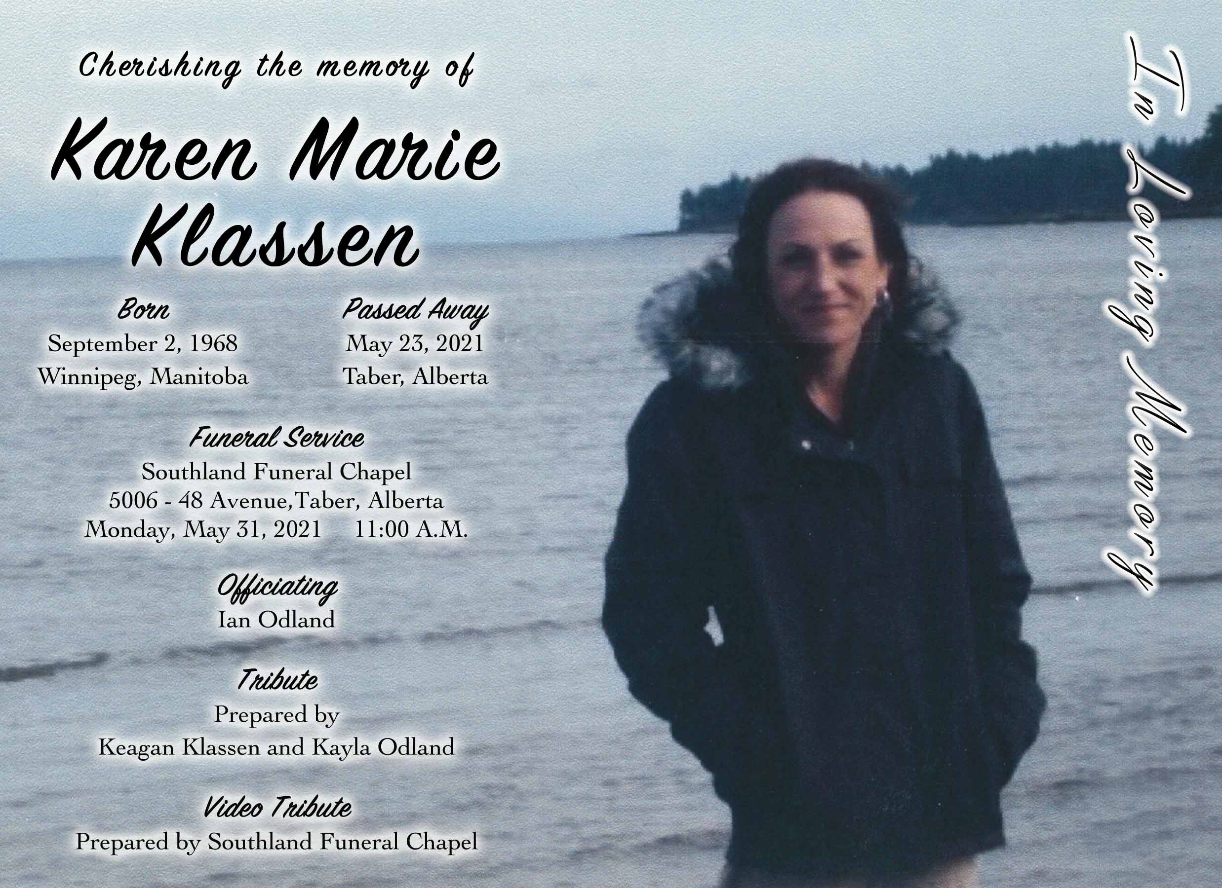 Karen Marie Klassen, passed away in Taber on Sunday, May 23, 2021 at the age of 52 years.