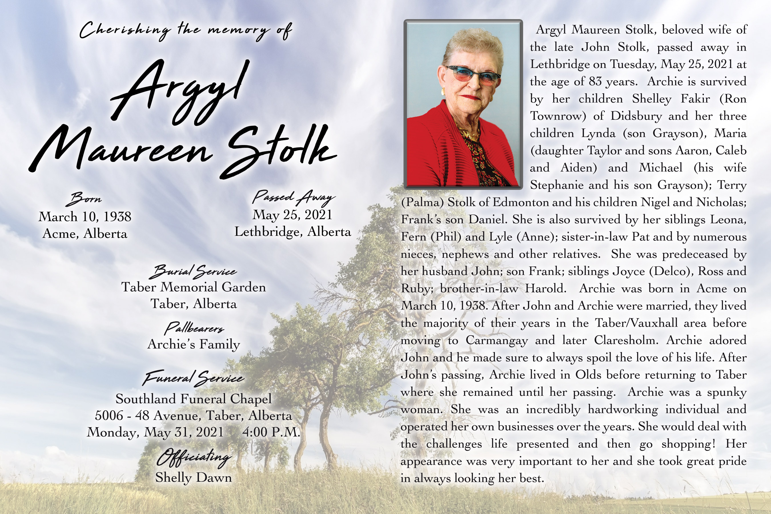 As a result of the restrictions regarding COVID-19 and the government recommendations, a private funeral service was held at Southland Funeral Chapel, Taber on Monday, May 31, 2021 at 4:00 P.M. with Shelly Bassett officiating.
