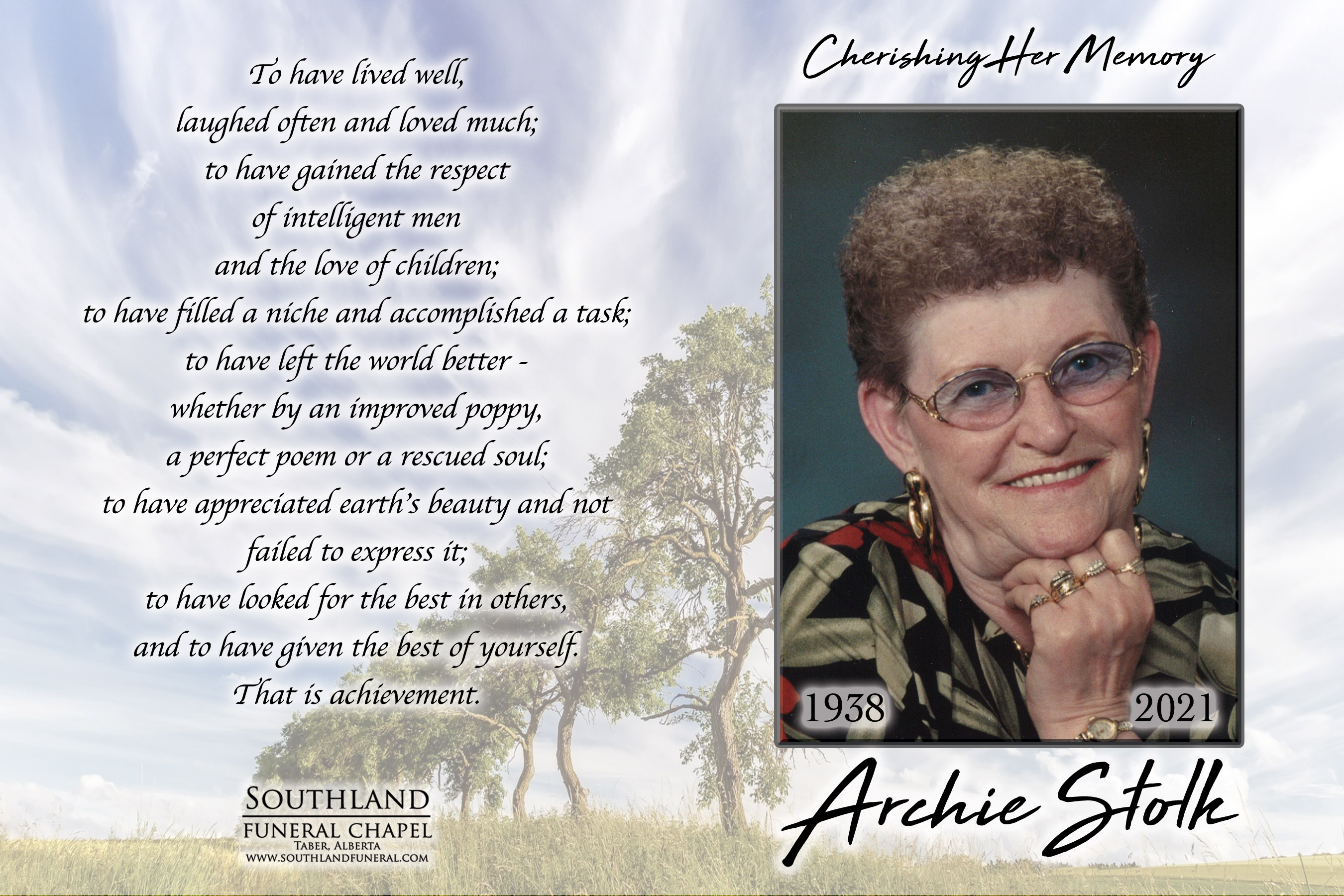 If friends so desire, memorial tributes in Archie’s name may be made directly to the Alzheimer’s Society, 40, 1202 - 2 Avenue South, Lethbridge, Alberta T1J 0E3 www.alzheimer.ca.