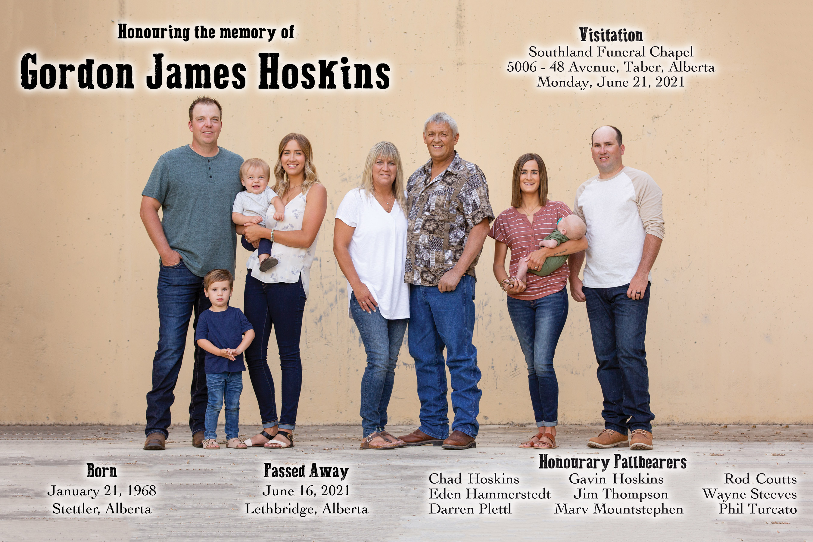 A public visitation was held at Southland Funeral Chapel, 5006 - 48 Avenue, Taber on Monday, June 21, 2021 between 6:00 P.M. and 8:00 P.M.