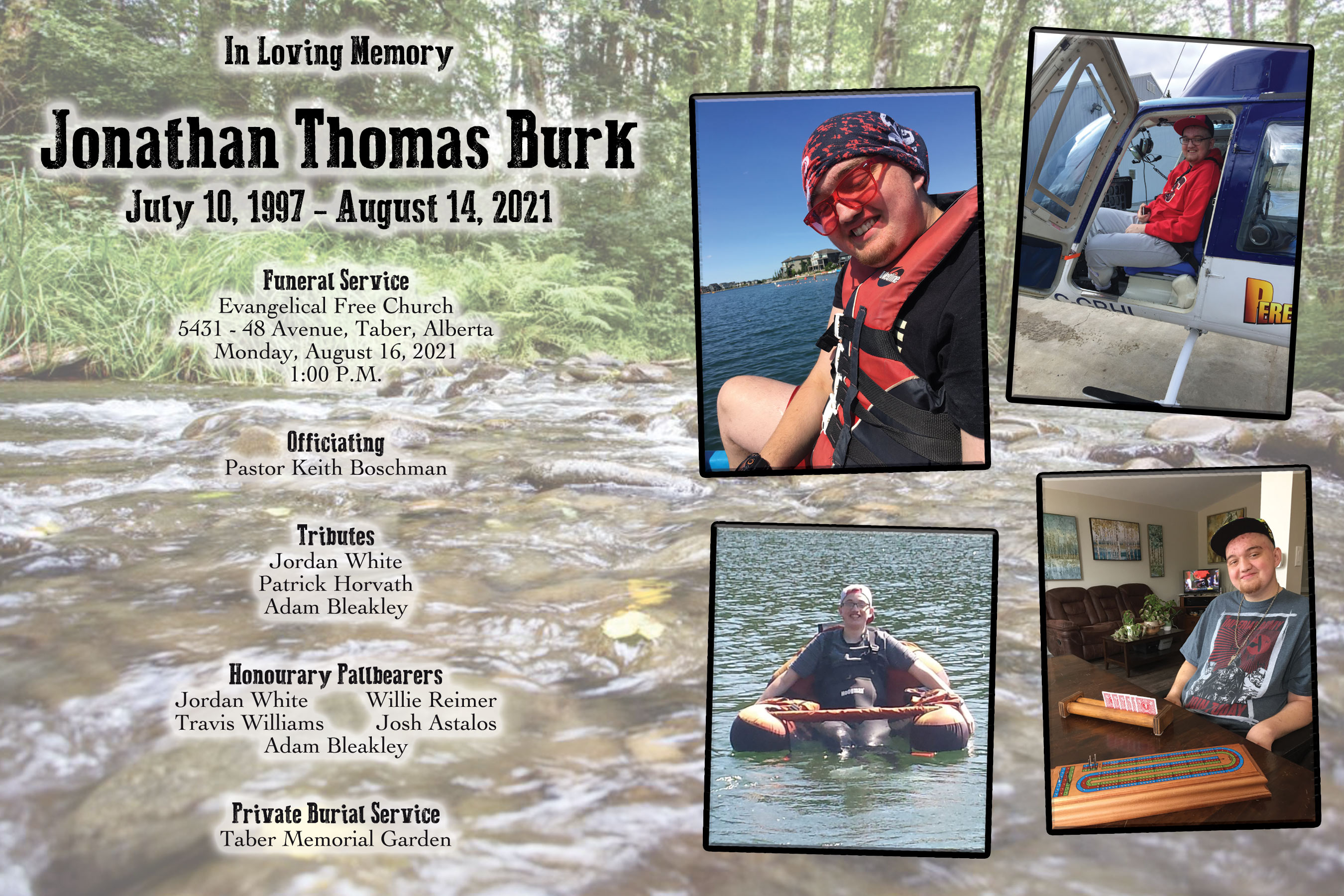 Jonathan Thomas Burk passed away in Taber on Saturday, August 14, 2021 at the age of 24 years.