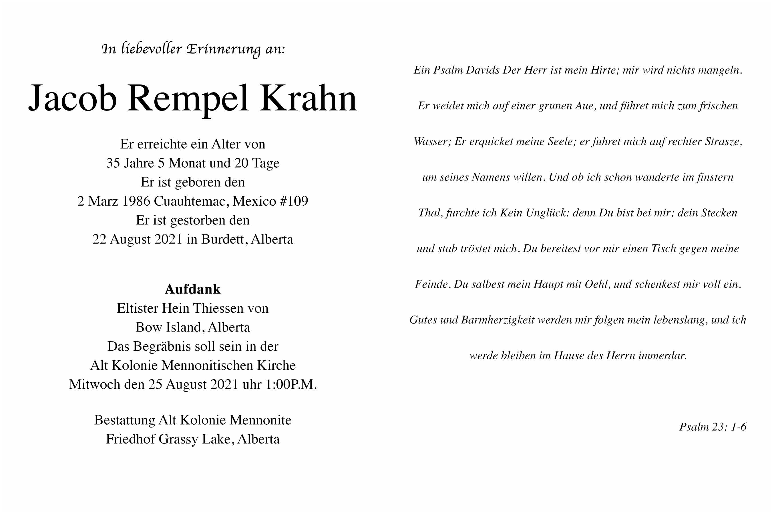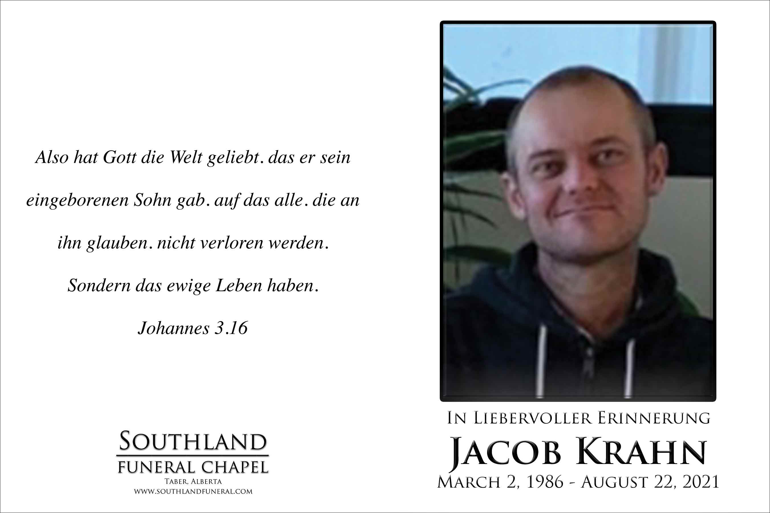 Jacob Rempel Krahn, beloved husband of Sara Krahn, passed away in Burdett on Sunday, August 22, 2021 at the age of 35 years.