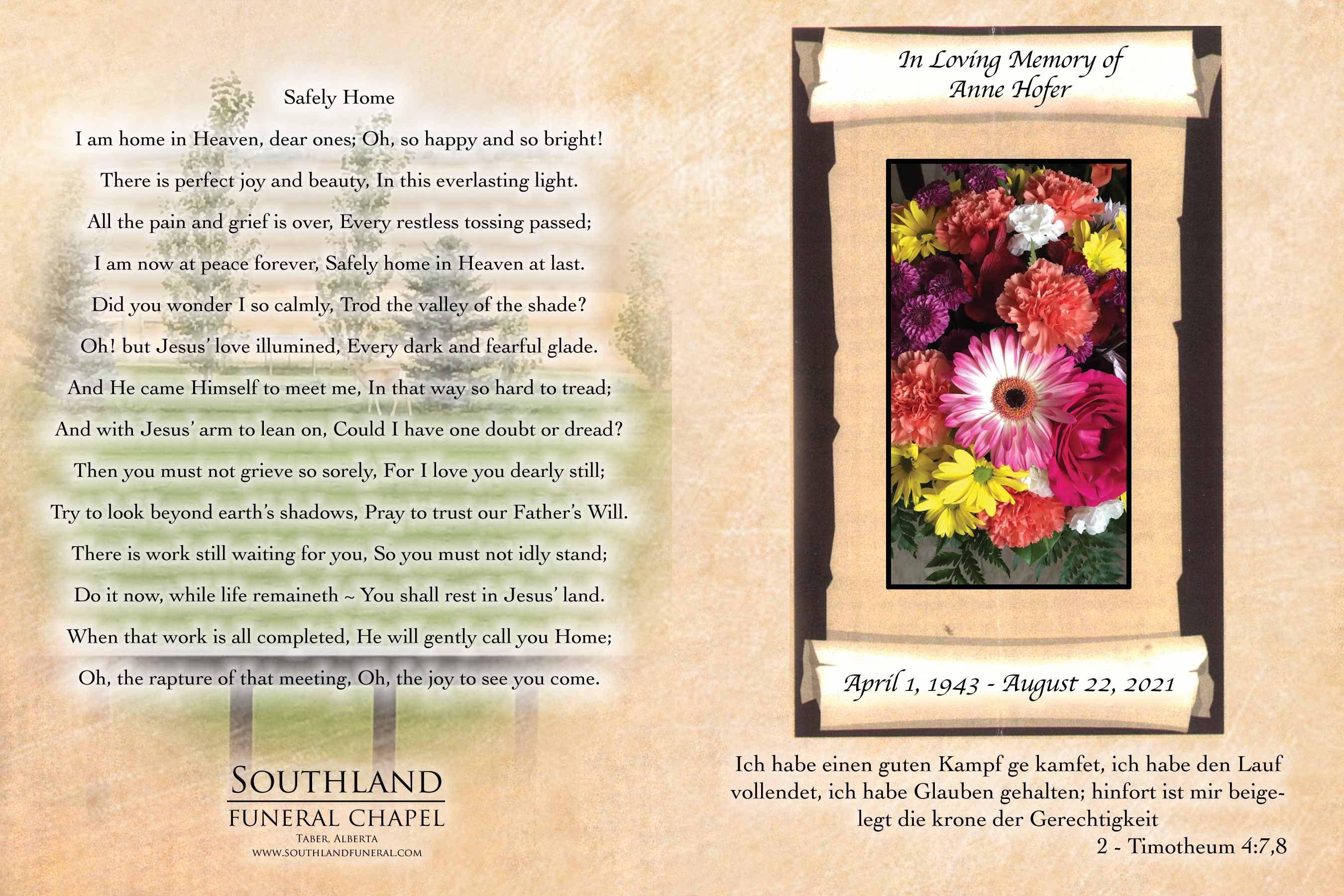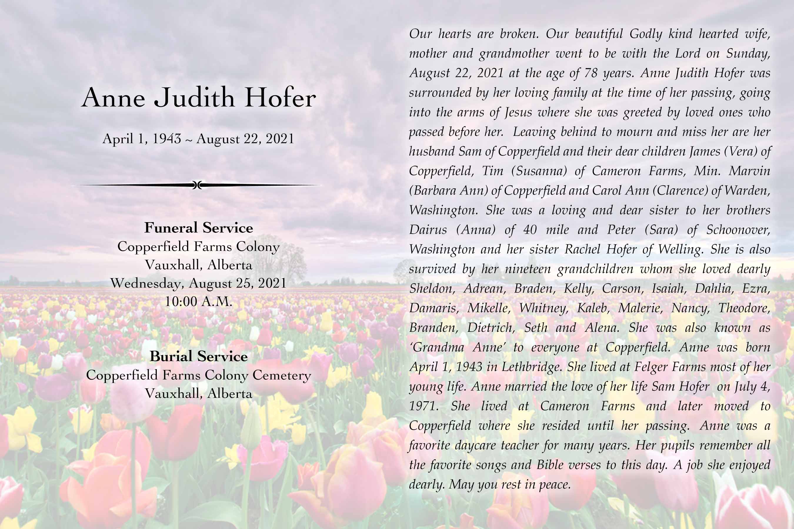 Our hearts are broken. Our beautiful Godly kind hearted wife, mother and grandmother went to be with the Lord on Sunday, August 22, 2021 at the age of 78 years. Anne Judith Hofer was surrounded by her loving family at the time of her passing, going into the arms of Jesus where she was greeted by loved ones who passed before her.