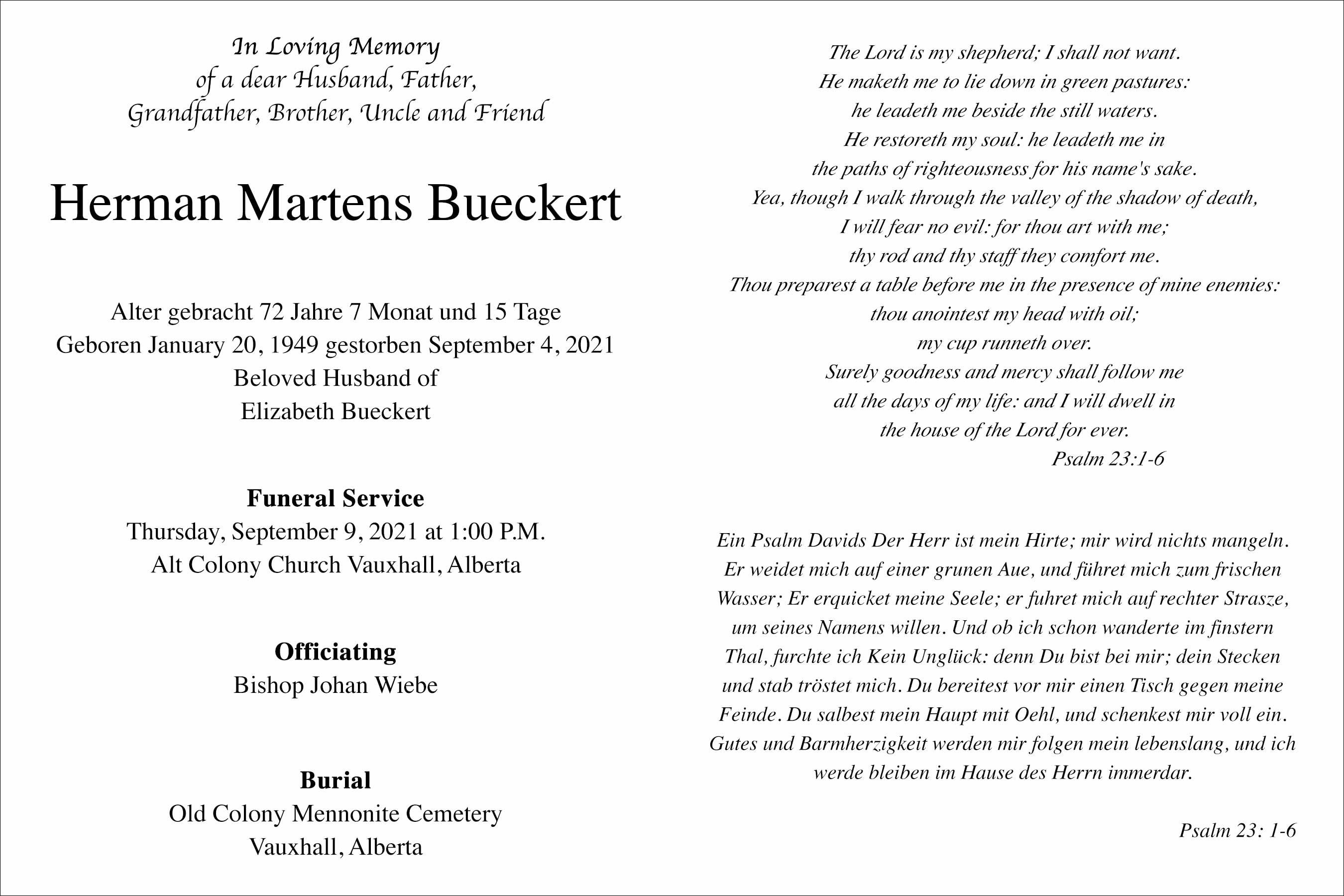 Herman Martens Bueckert, beloved husband of Elizabeth Bueckert, passed away in Medicine Hat on Saturday, September 4, 2021 at the age of 72 years.