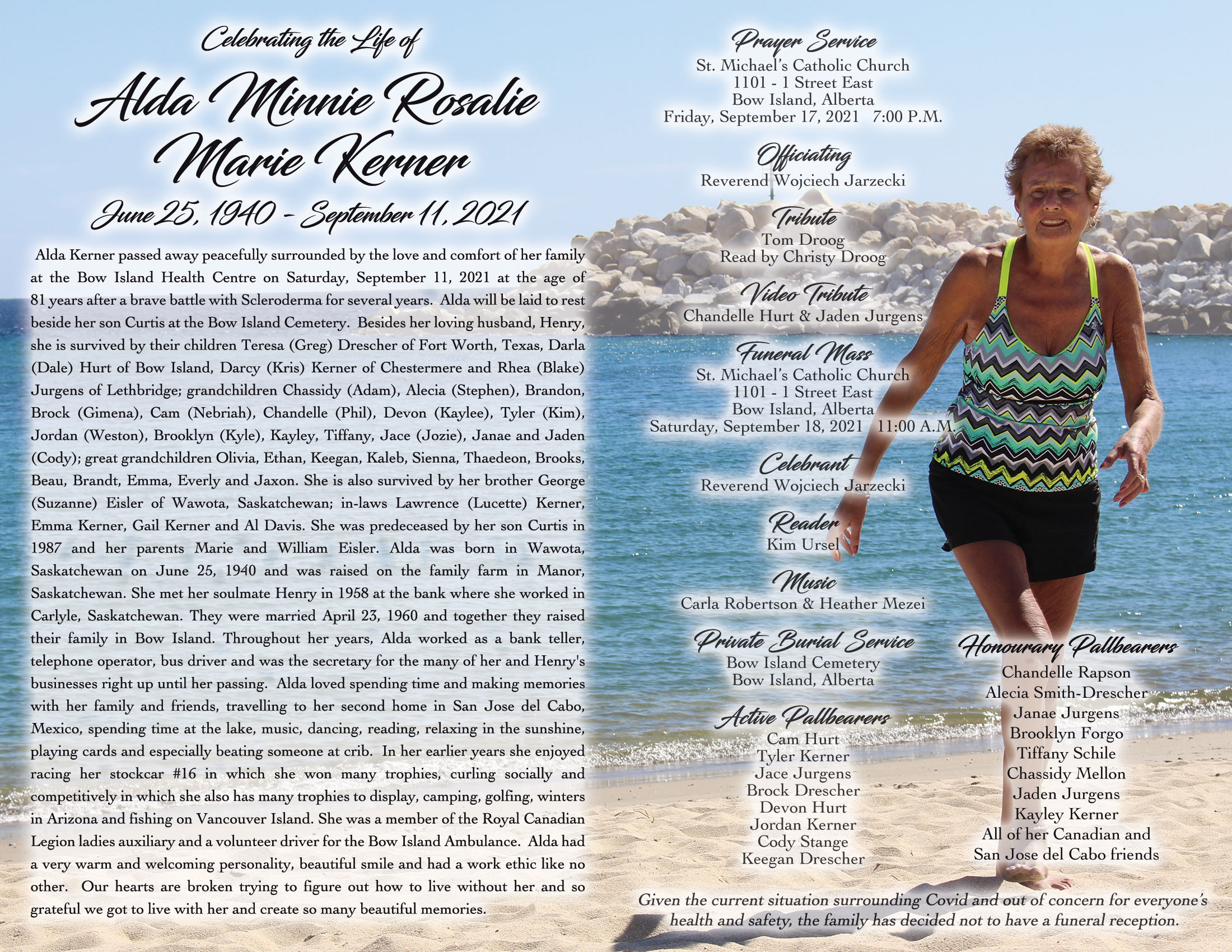 Alda Kerner passed away peacefully surrounded by the love and comfort of her family at the Bow Island Health Centre on Saturday, September 11, 2021 at the age of 81 years after a brave battle with Scleroderma for several years.