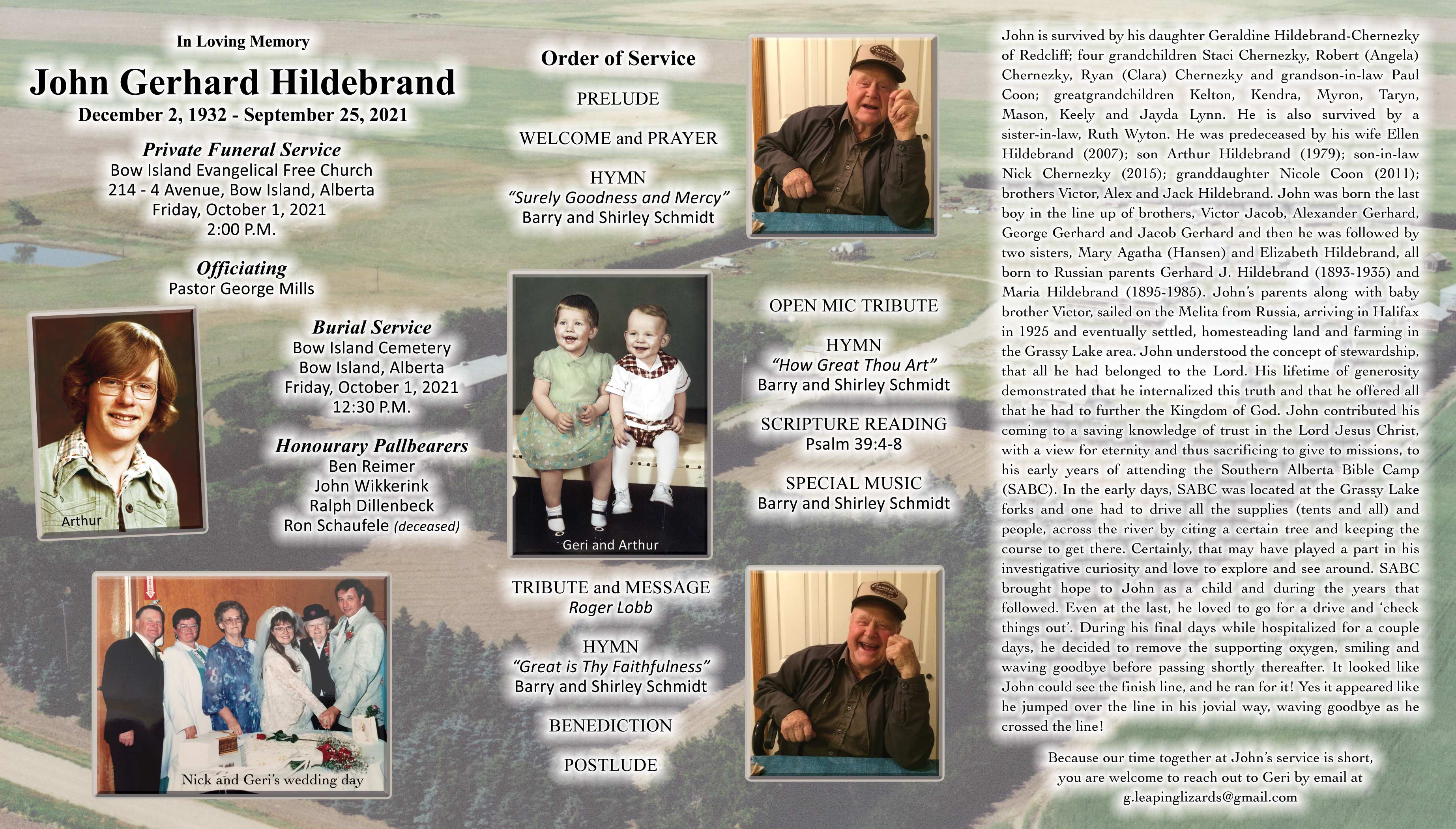 John Gerhard Hildebrand, beloved husband of the late Ellen Hildebrand (nee Wiens), passed away in Medicine Hat on Saturday, September 25, 2021 at the age of 88 years.