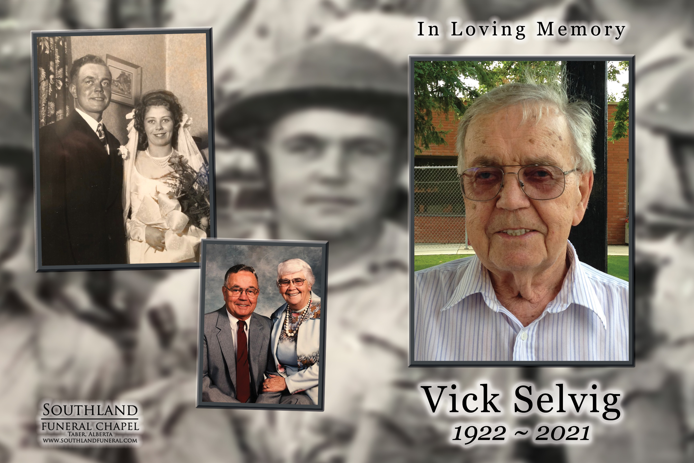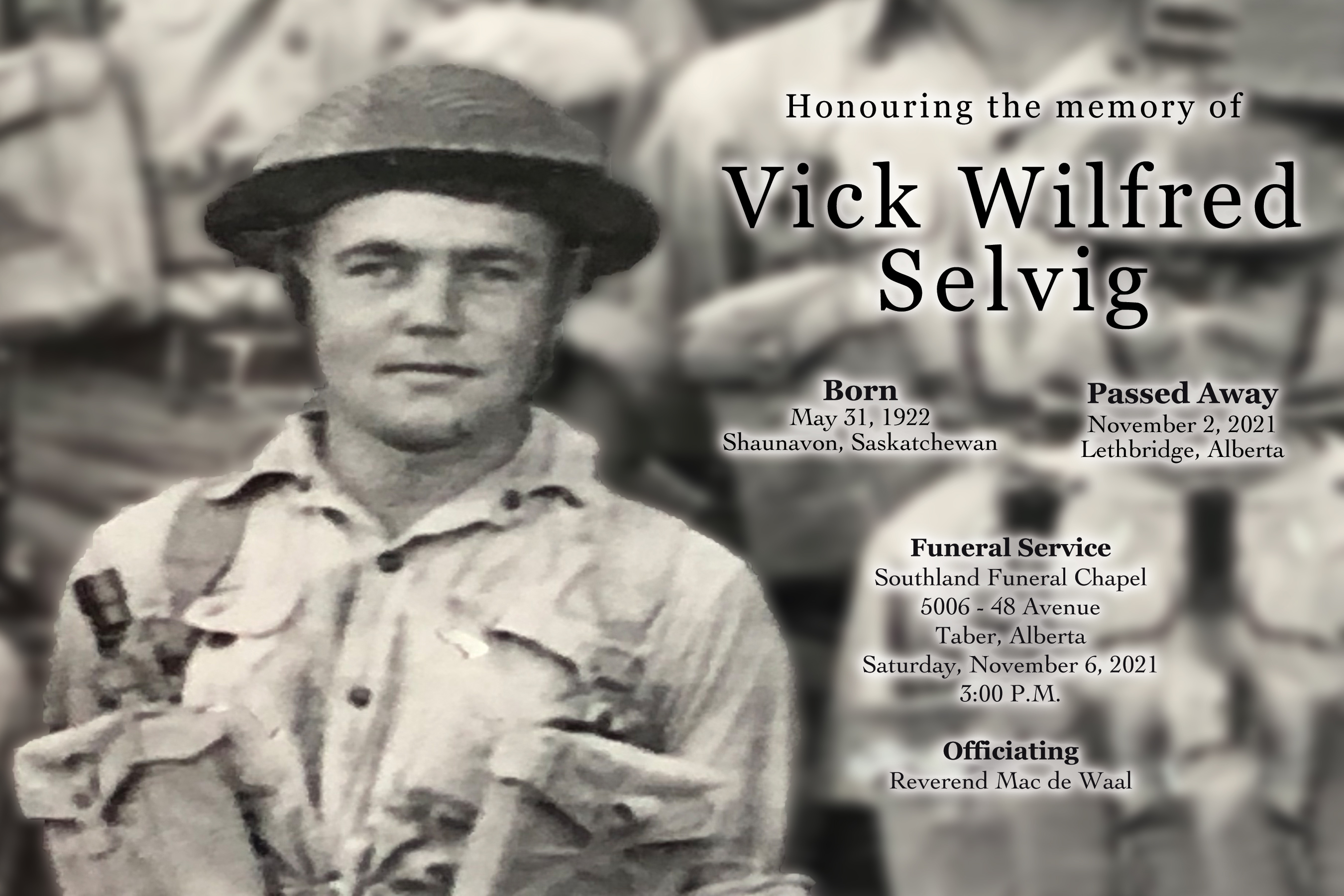 With great sadness, Vick Wilfred Selvig, beloved husband of the late Frances Selvig (nee Skoye), passed away in Lethbridge on Tuesday, November 2, 2021 at the age of 99 years.