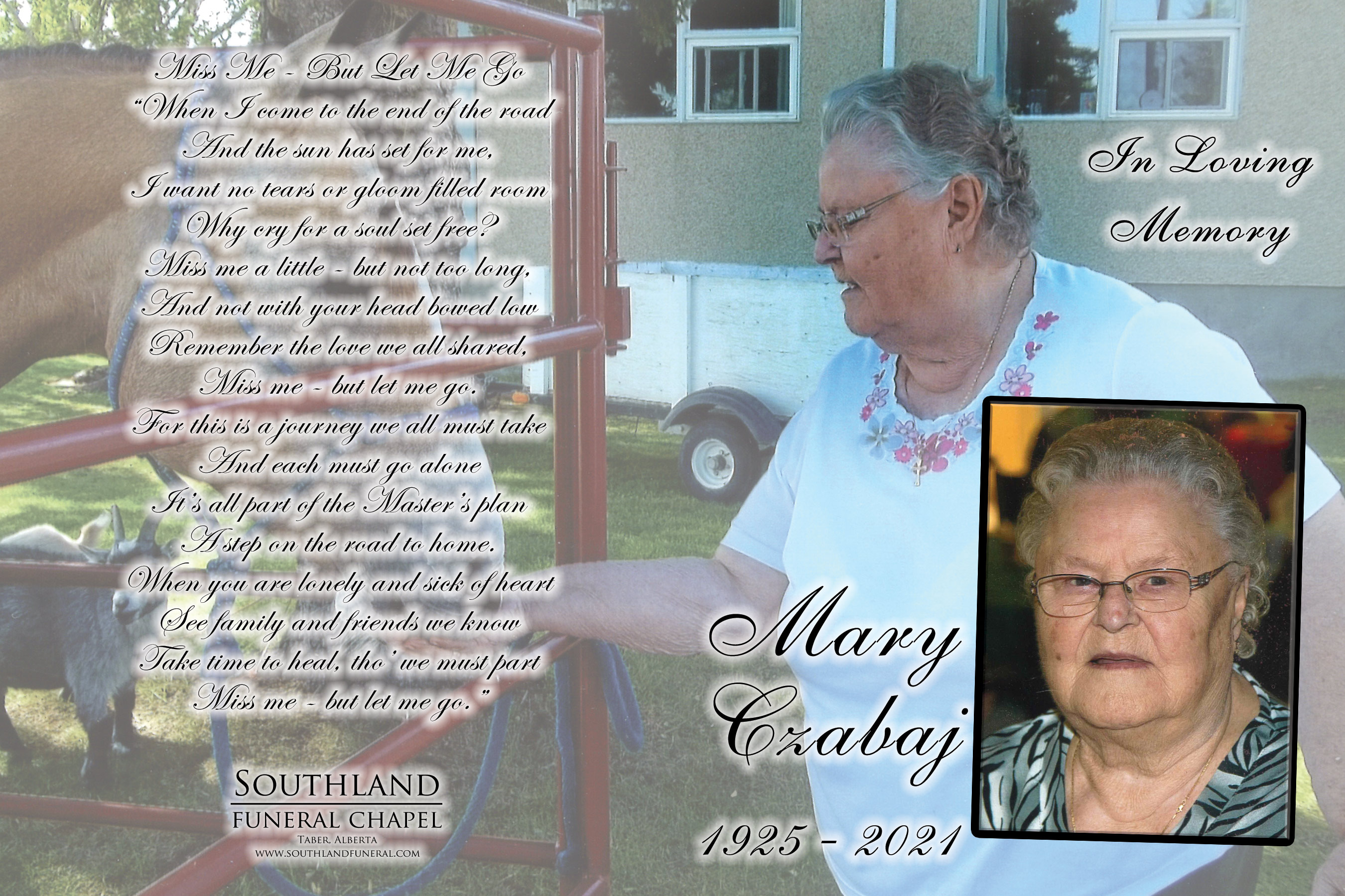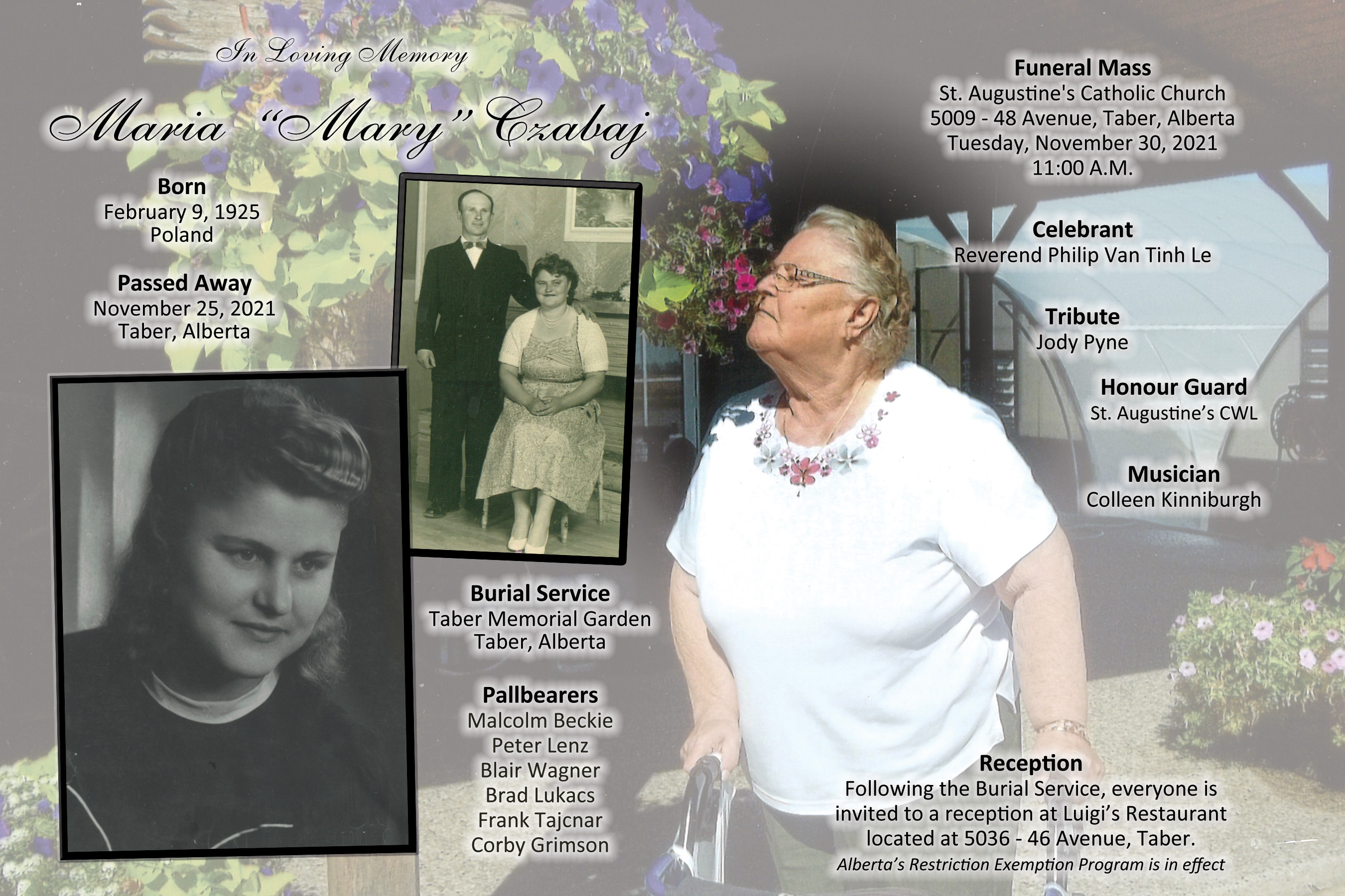 Maria Czabaj, beloved wife of the late Leon Czabaj, passed away in Coaldale on Thursday, November 25, 2021 at the age of 96 years.