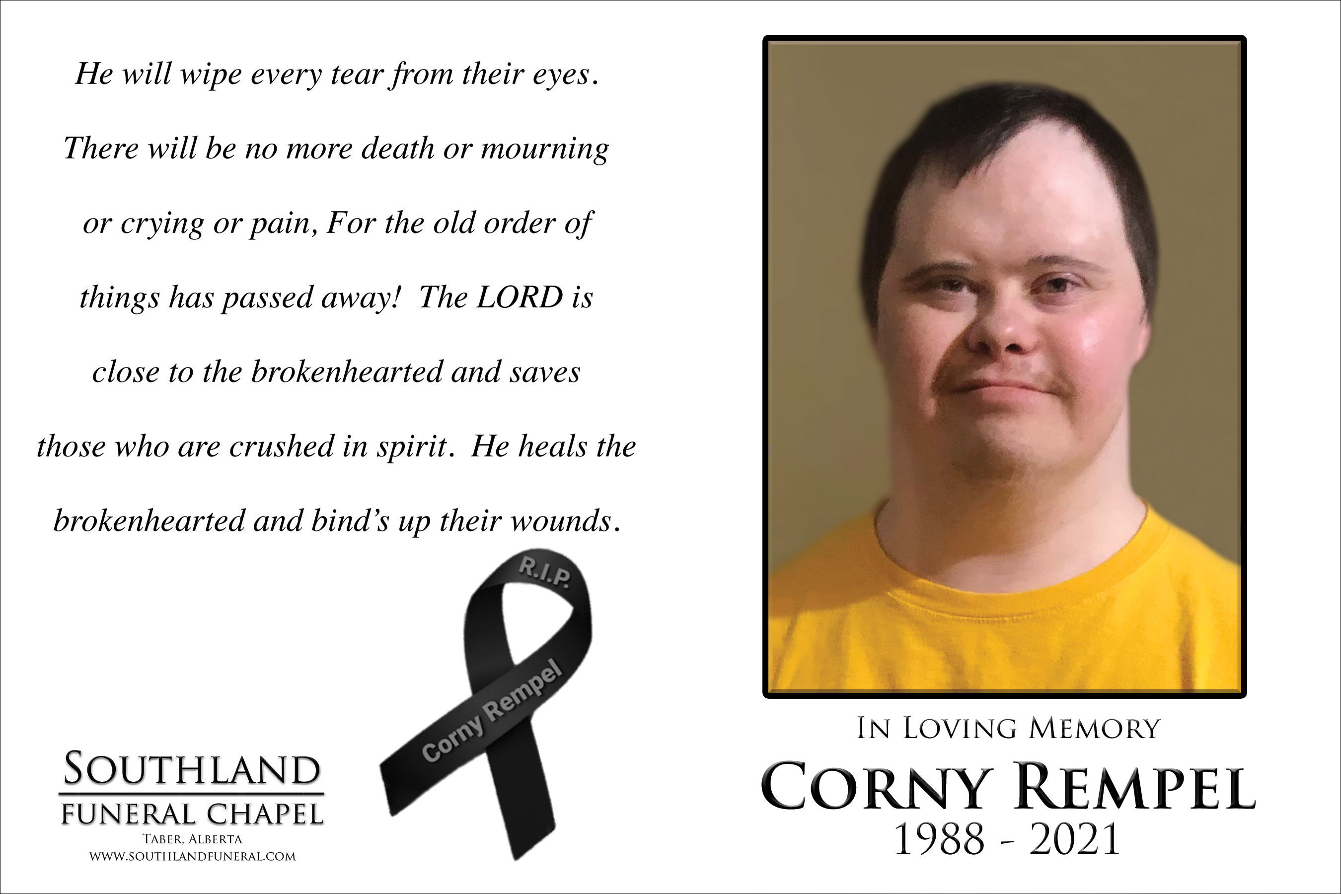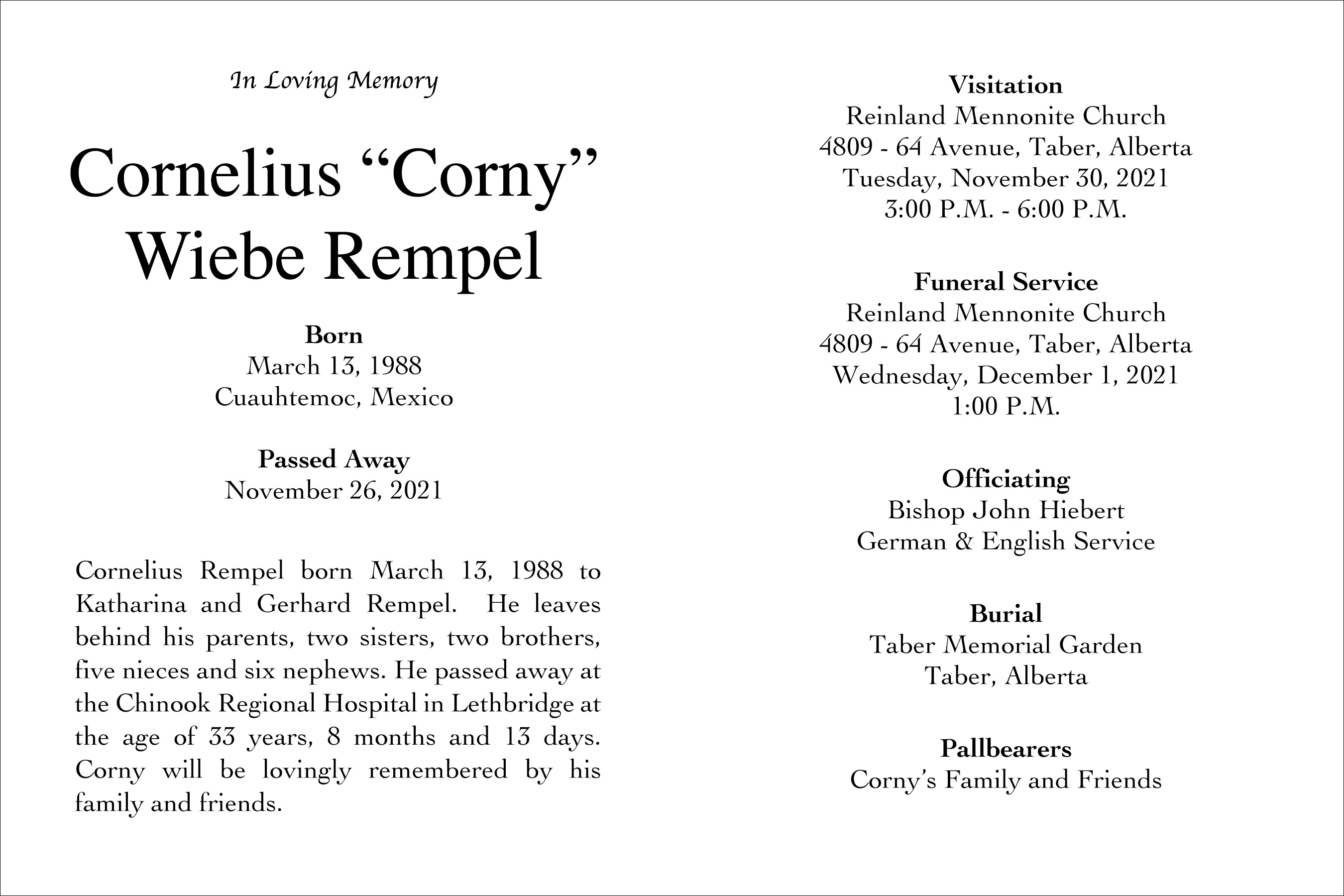 Cornelius Wiebe Rempel, passed away in Lethbridge on Friday, November 26, 2021 at the age of 33 years.