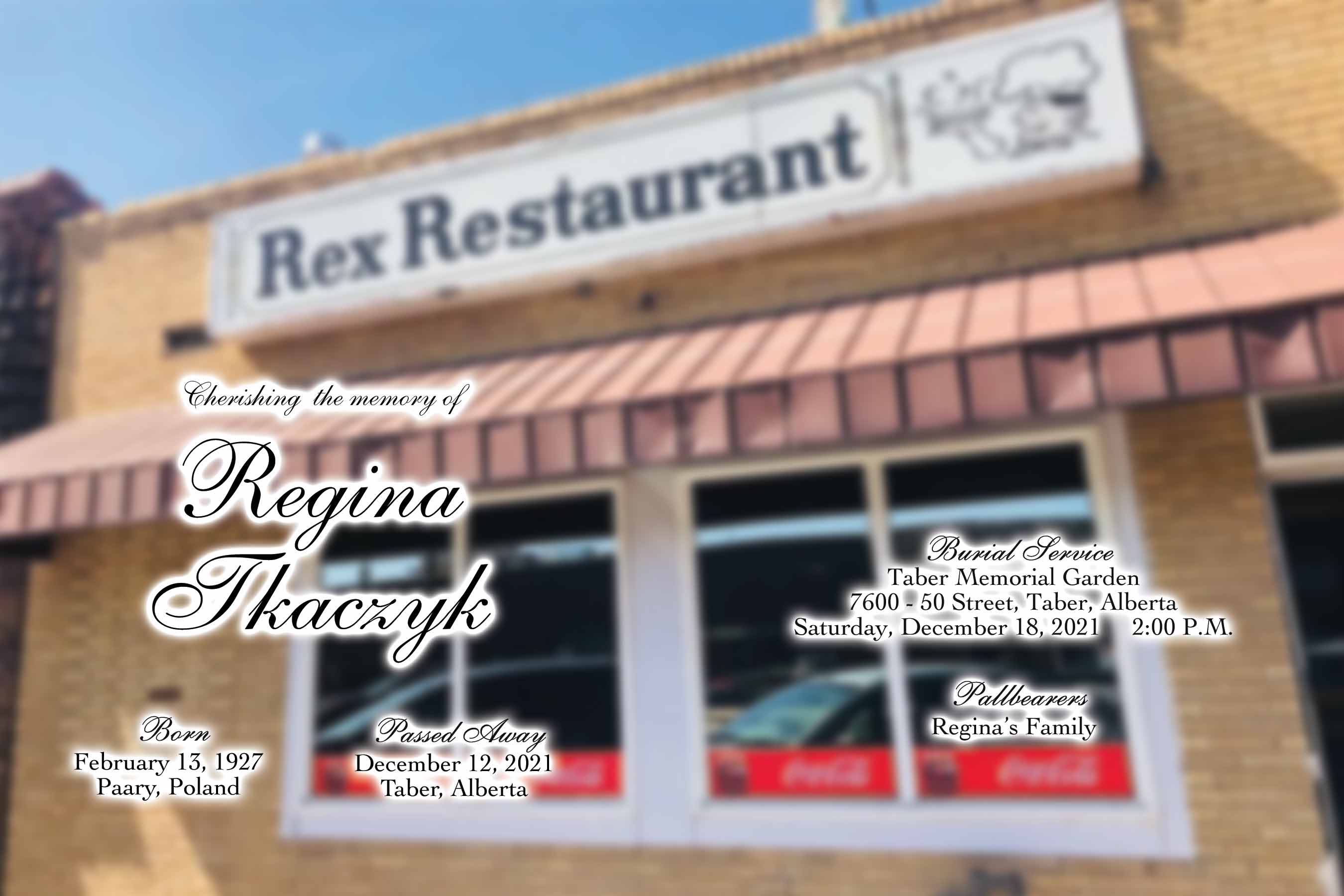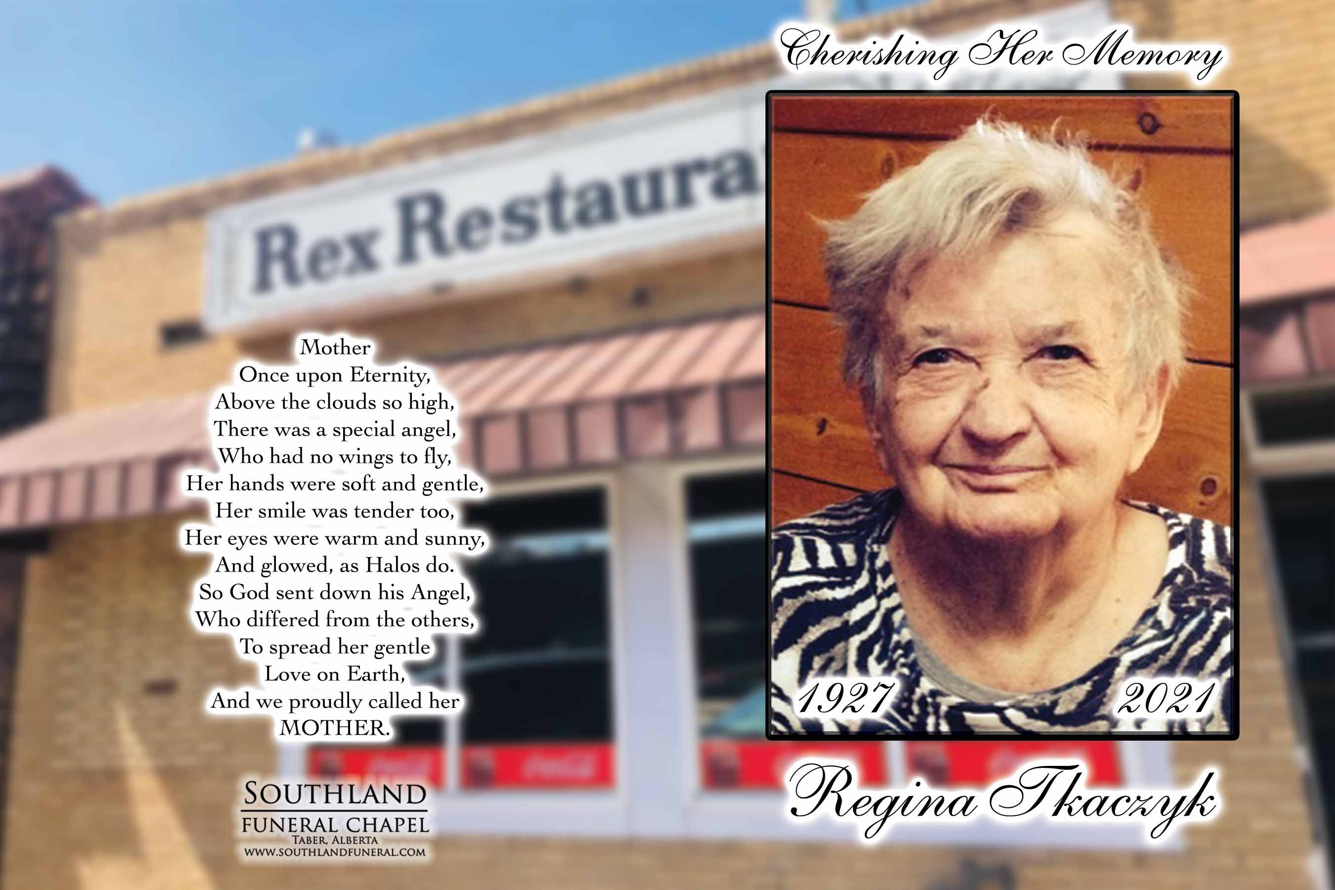 Regina Tkaczyk, beloved wife of the late Daniel Tkaczyk, passed away in Taber on Sunday, December 12, 2021 at the age of 94 years.