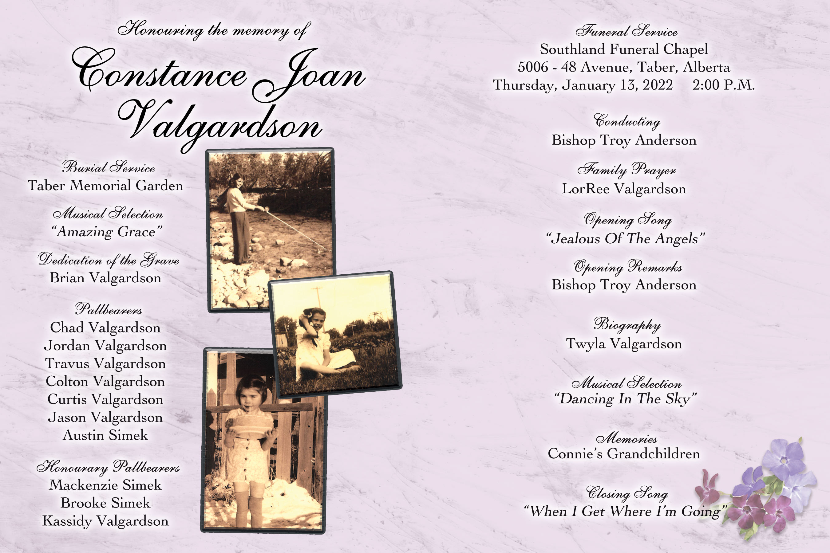 Connie loved musicals and if the chance came, she would go. She was a shopper, always looking for a good deal and would brag about every one she got. Later, when she and Ronald needed extra help, she was always very grateful for the wonderful care they received from Lethbridge Family Services, Taber Community Care and the Taber Health Centre. Mom will be remembered for her honesty, wit and amazing memory.