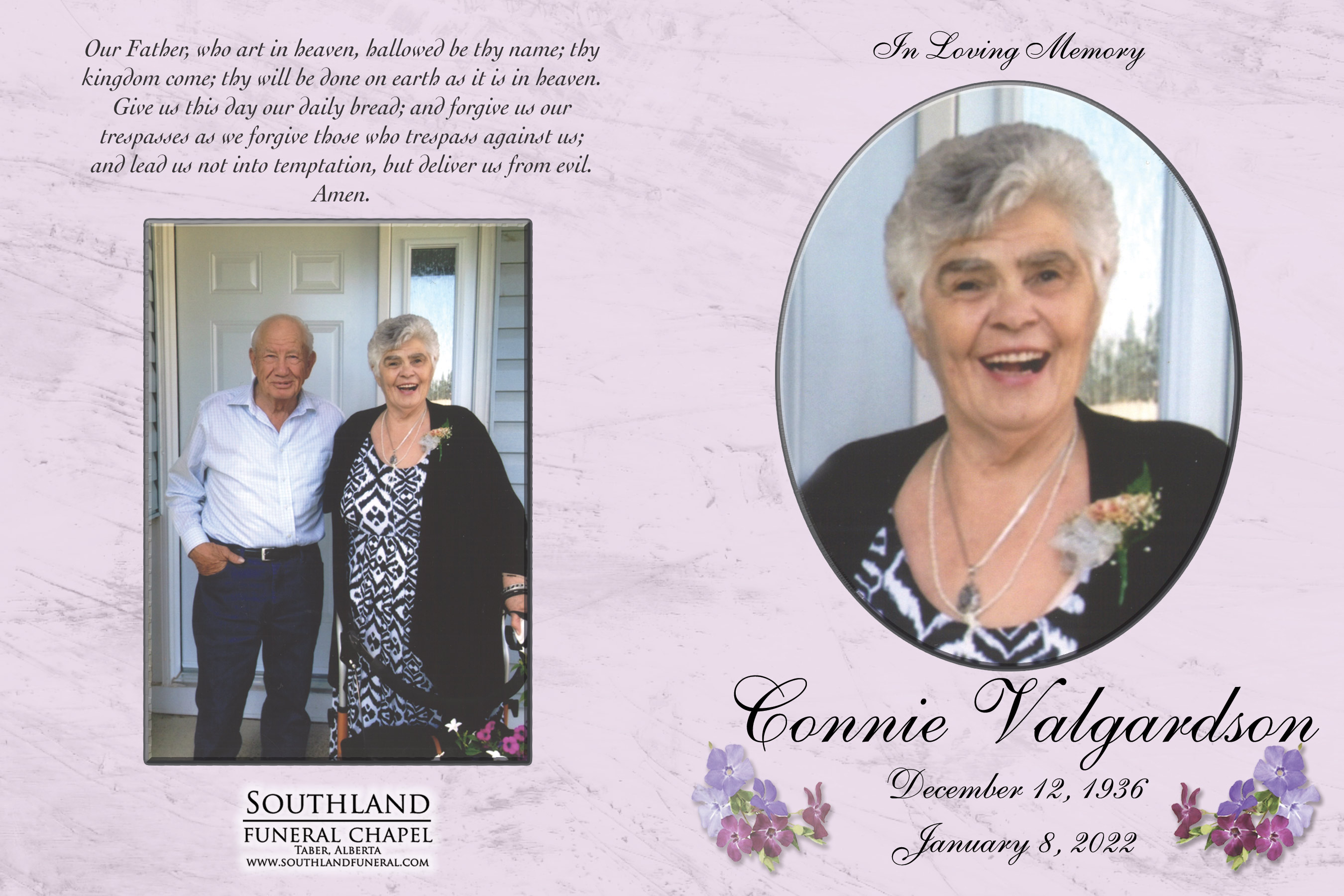 Constance Joan Valgardson (née Bassett), beloved wife of the late Ronald Valgardson, passed away in Taber on Saturday, January 8, 2022 at the age of 85 years.