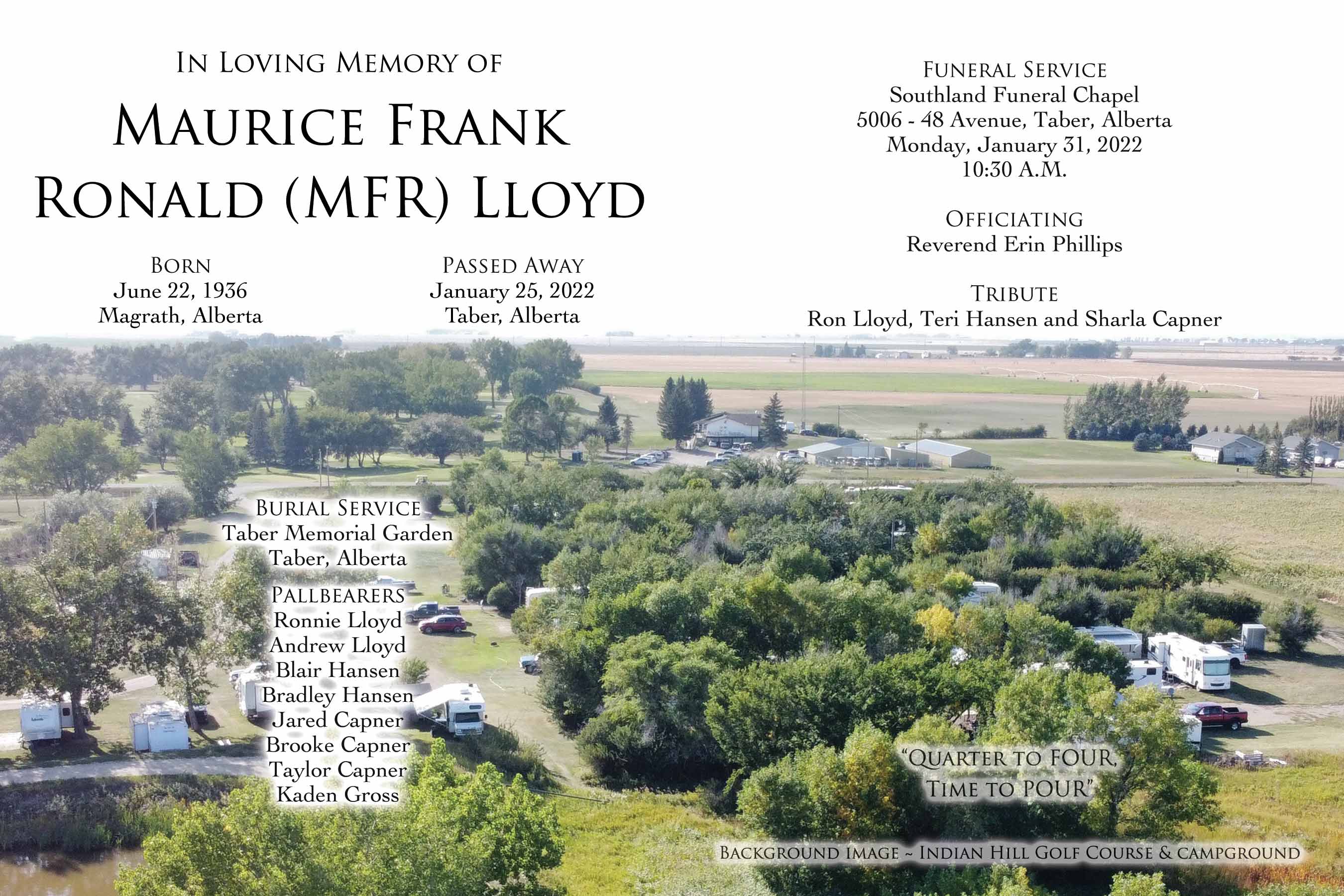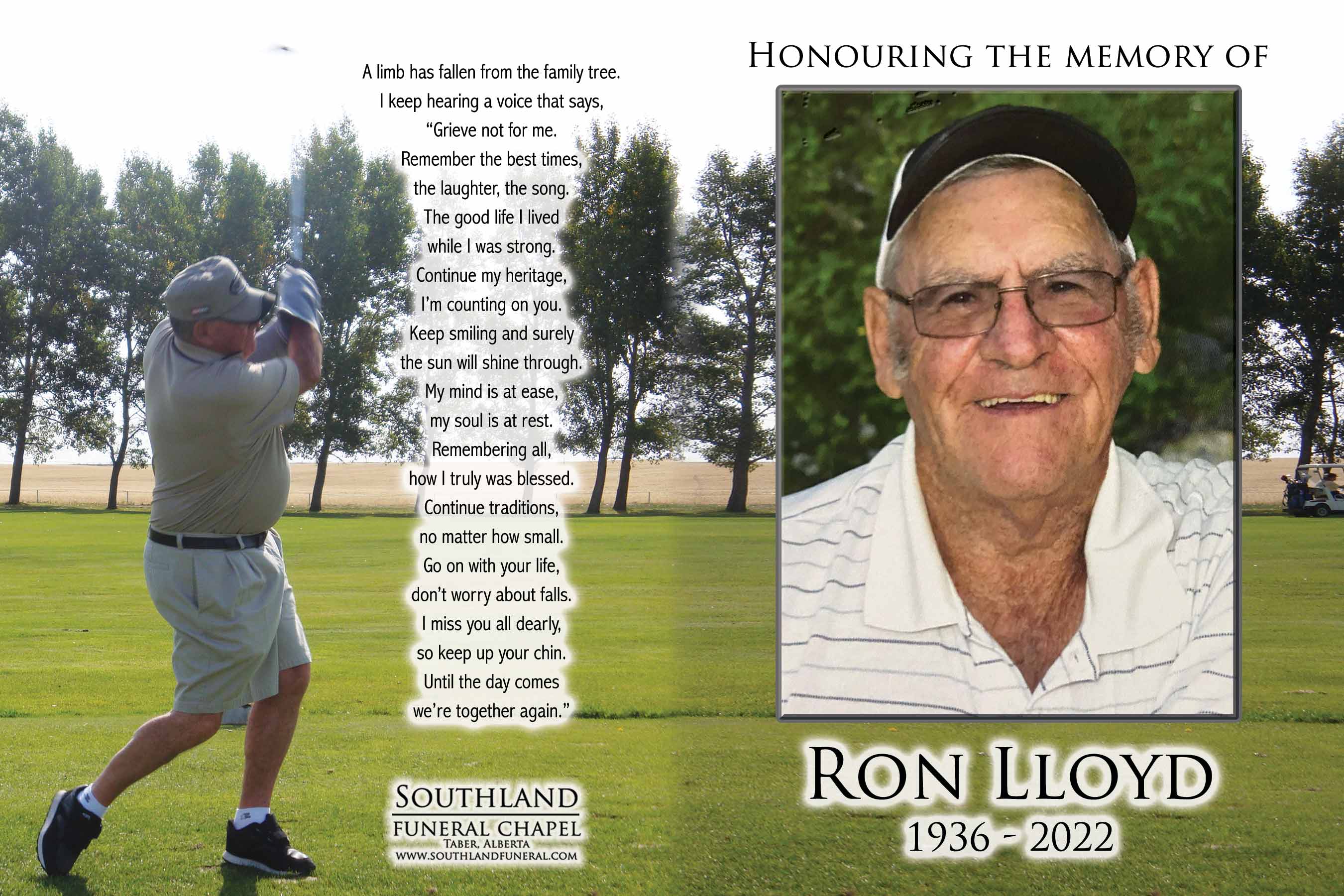 Ron was born in Magrath on June 22, 1936, the oldest of three children born to Maurice and Ethel Lloyd. He spent most of his life in Taber. Ron was predeceased by his lovely wife and best friend of forty eight years, Lorna Lloyd (née Turnbull). Together they raised three children Ron Lloyd (Louise), Teri Hansen (Darwyn) and Sharla Capner. Ron worked many years for the Taber Irrigation District, retiring in 2001. He enjoyed curling, camping, happy hour, golfing and spending time in Arizona or Indian Hills depending on the season. Through these activities he met and made many wonderful friends.