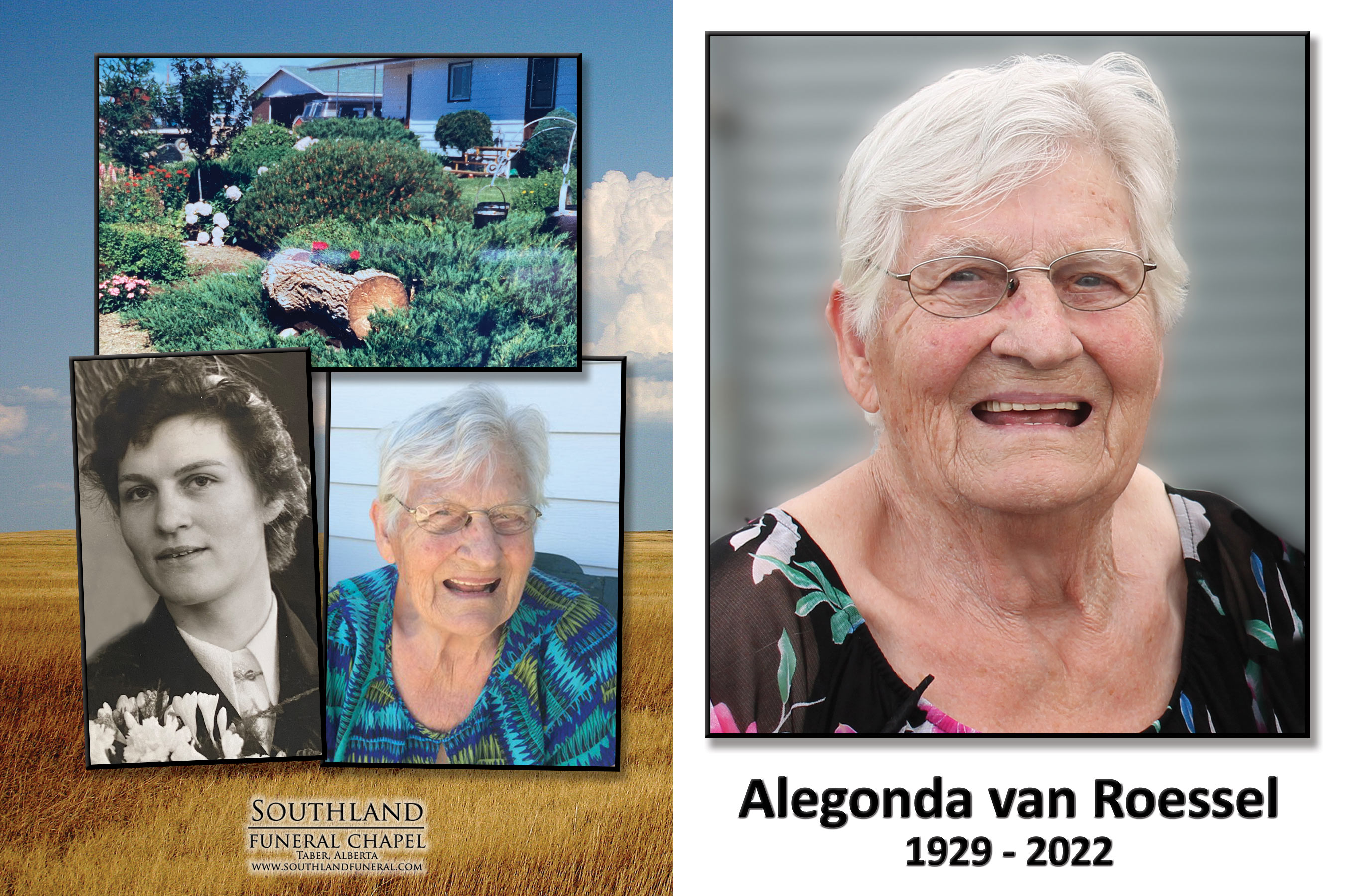 Alegonda was born to parents Johannes and Catharina Vissers-van Loon on December 18, 1929, in Drunen, the Netherlands. She grew up on a mixed farm with her many siblings. In her teenage years, she worked as a seamstress and went to neighbours’ homes to help with new mothers, aging mothers and general house help. During those years, she met Jack van Roessel, married in 1954 and purchased a one-way honeymoon ticket to Canada. After working on a few farms in Southern Alberta, they managed to save enough money to purchase the current family farm, north of Bow Island. Although taking English lessons in the Netherlands before emigrating, her most significant English lessons came from dialogue with a four-year-old boy in Warner.