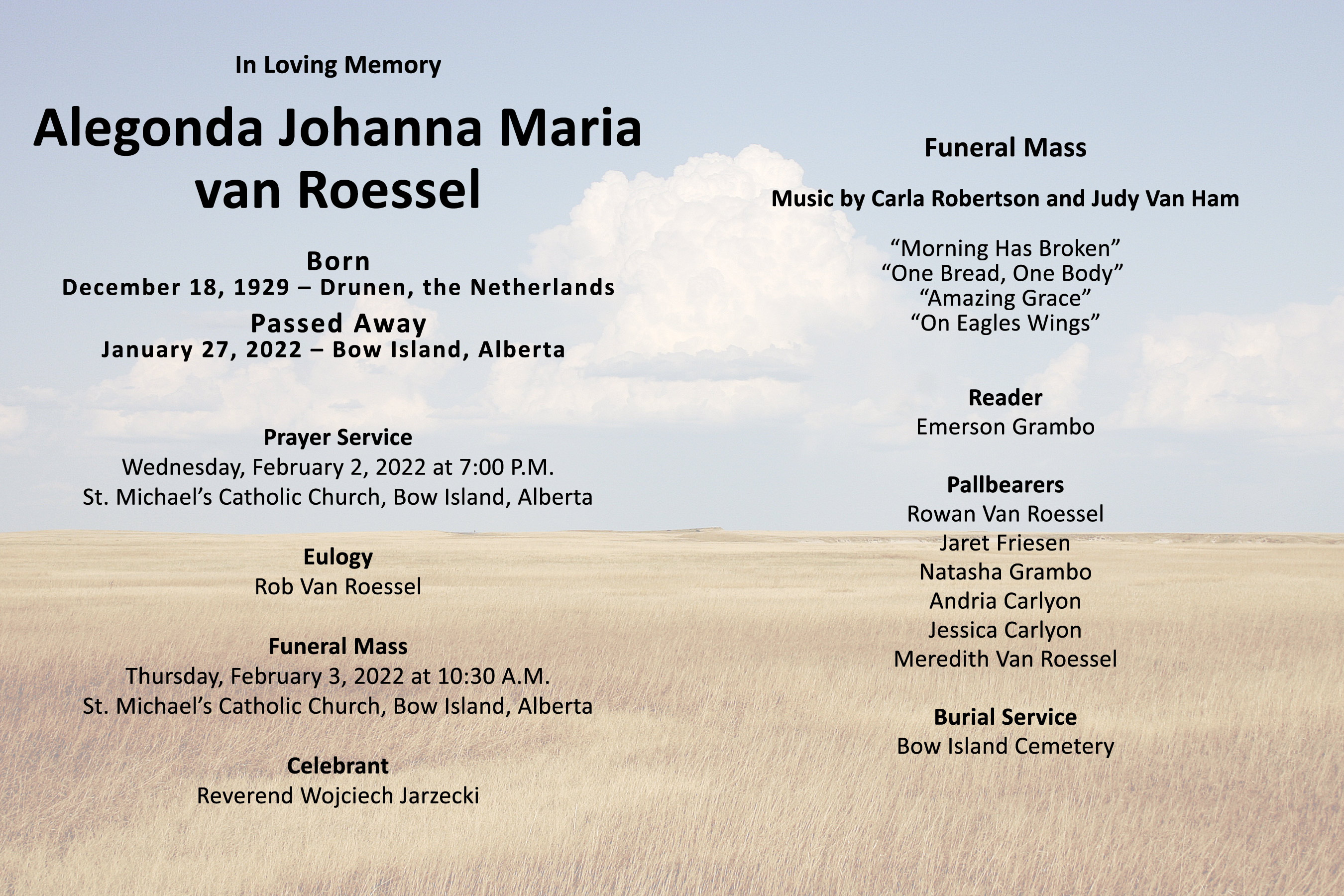 The Funeral Mass was celebrated at St. Michael's Catholic Church, Bow Island on Thursday, February 3, 2022 at 10:30 A.M. Burial followed at the Bow Island Cemetery.