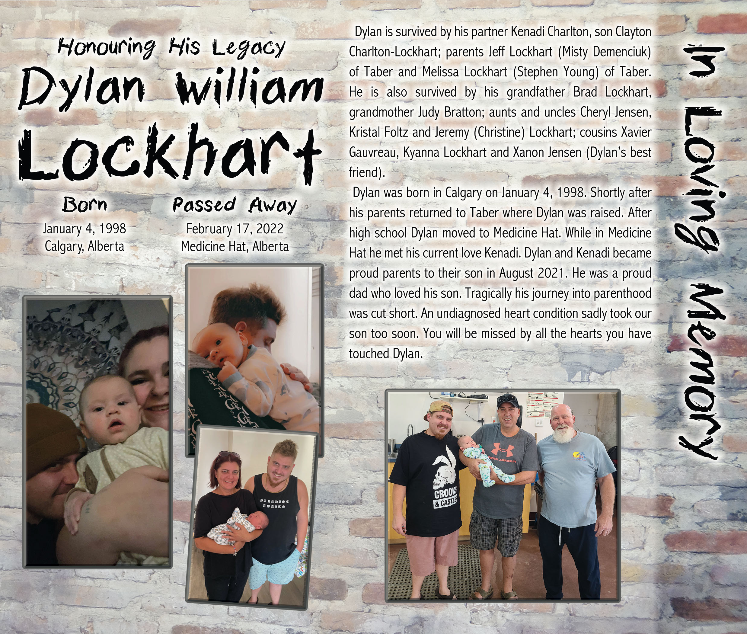Dylan is survived by his partner Kenadi Charlton, son Clayton Charlton-Lockhart; parents Jeff Lockhart (Misty Demenciuk) of Taber and Melissa Lockhart (Stephen Young) of Taber. He is also survived by his grandfather Brad Lockhart, grandmother Judy Bratton; aunts and uncles Cheryl Jensen, Kristal Foltz and Jeremy (Christine) Lockhart; cousins Xavier Gauvreau, Kyanna Lockhart and Xanon Jensen (Dylan’s best friend).