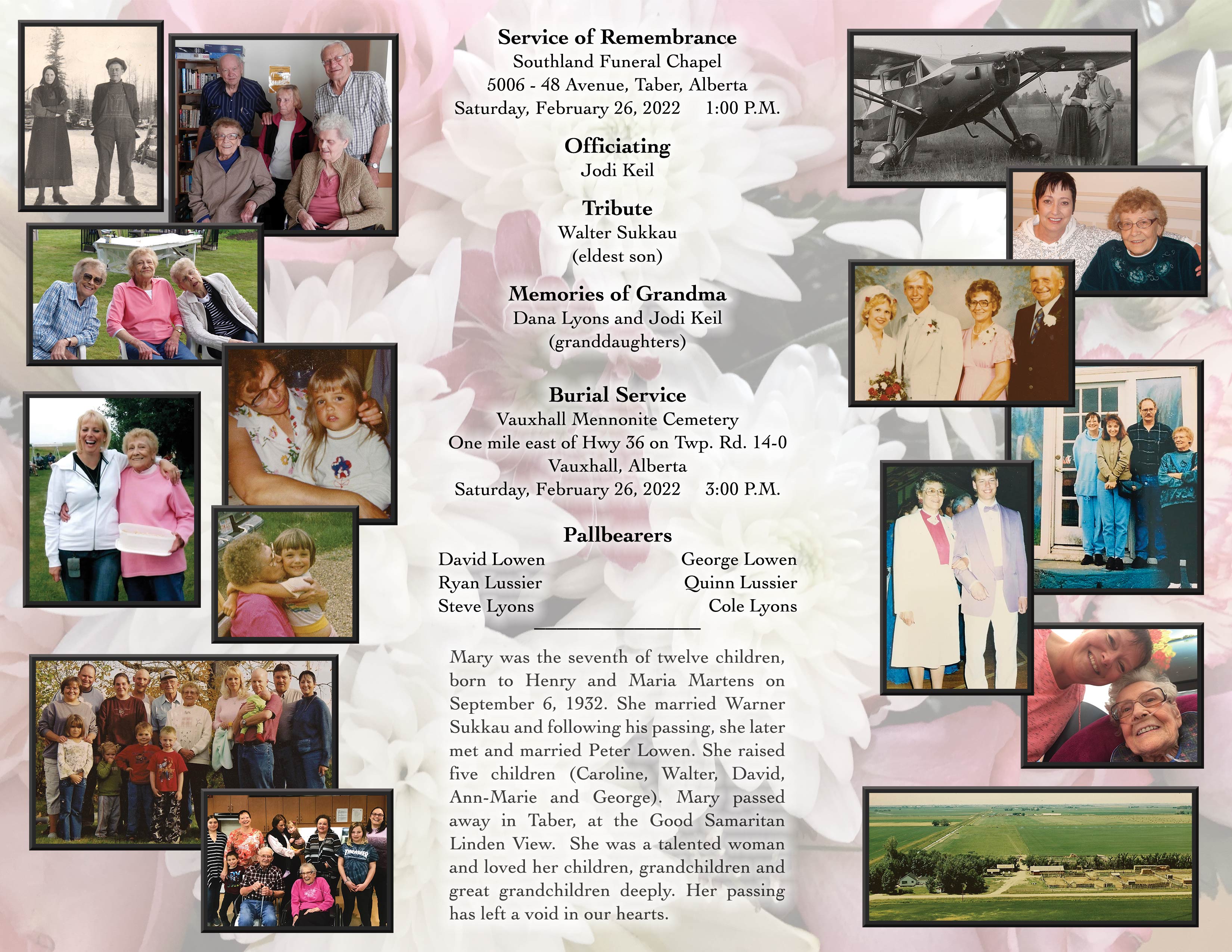 Mary is survived by her four children, Walter (Audrey, née Patershuk) Sukkau of Banjul, Gambia, Africa, David Lowen of Leduc, Ann-Marie (Paul) Mathers (née Sukkau) of Lethbridge and George Lowen of Okotoks; seven grandchildren and eleven great grandchildren. She is also survived by her brother David (Ruth, née Rempel) Martens of Coaldale and by numerous members of her extended family.
