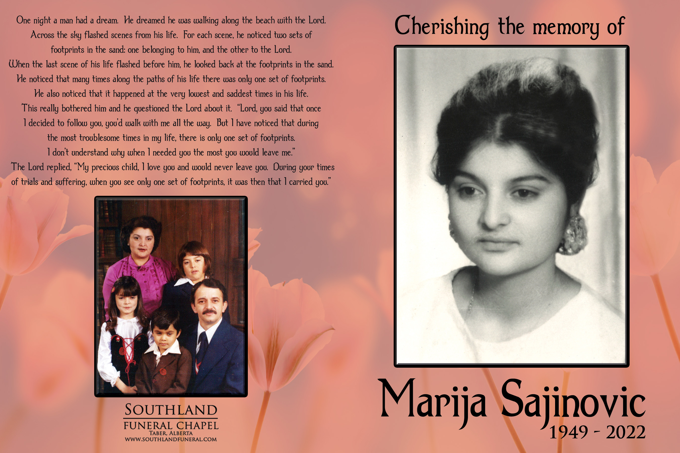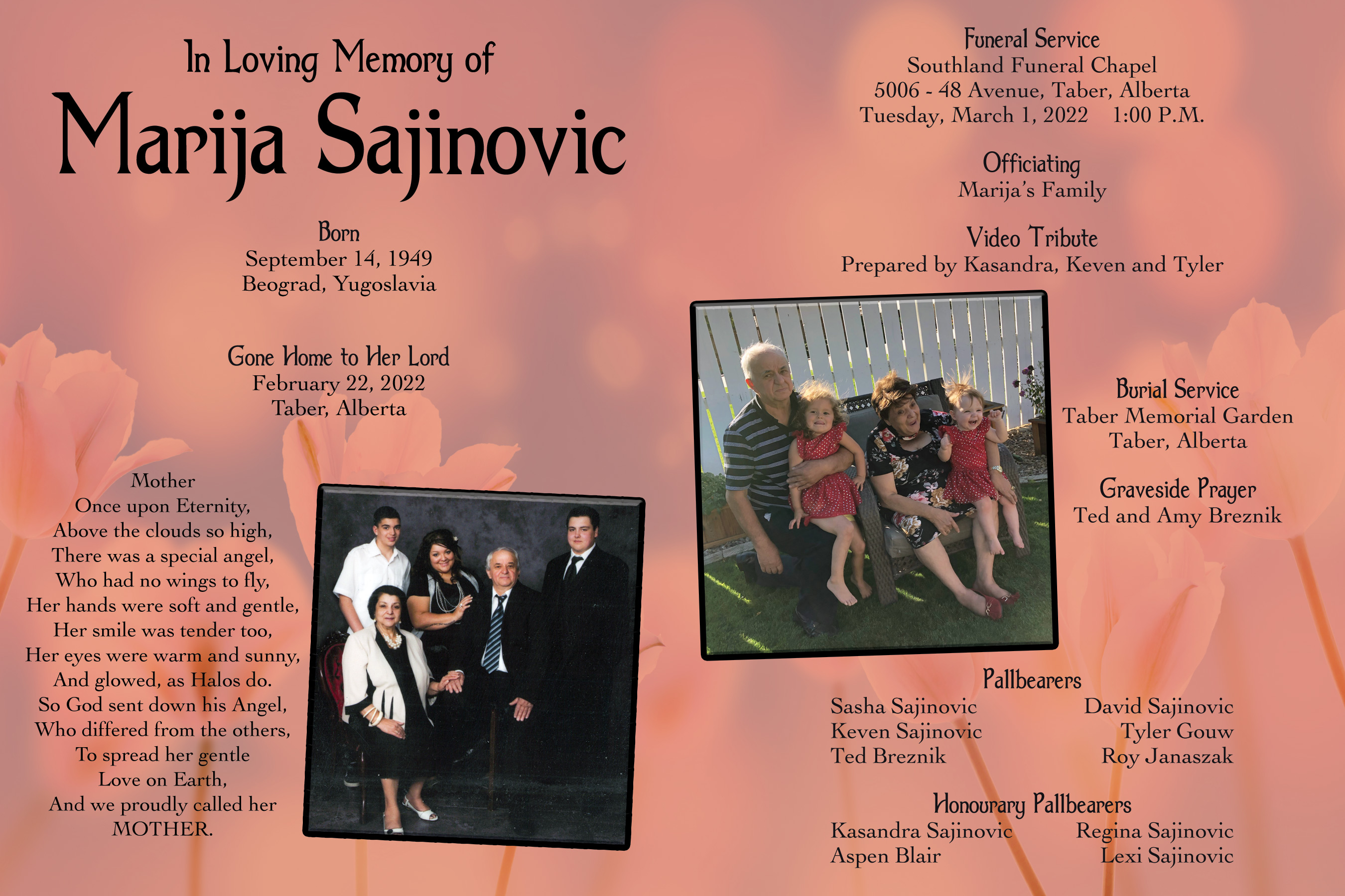 The funeral service was held at Southland Funeral Chapel, 5006 - 48 Avenue, Taber on Tuesday, March 1, 2022 at 1:00 P.M. Burial followed at the Taber Memorial Garden.