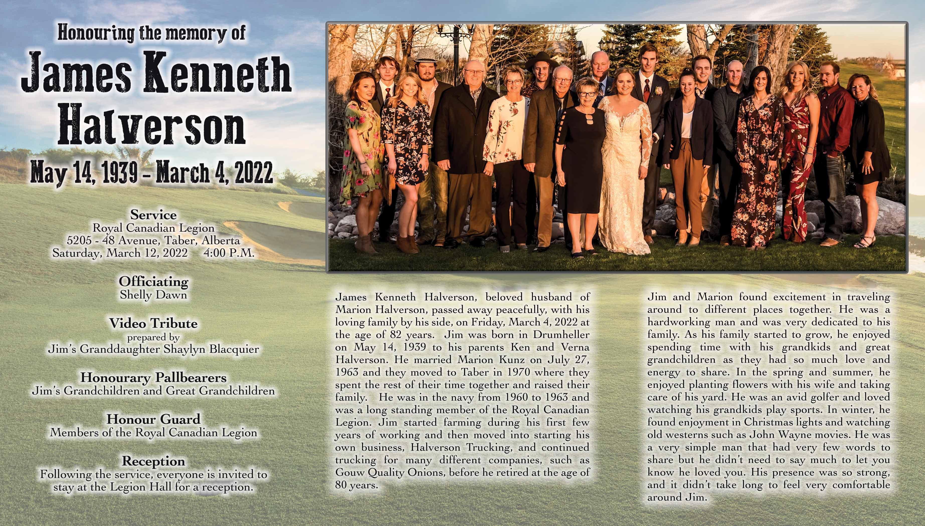 Besides Marion, his loving wife of fifty seven years, Jim is survived by their four children Darcey Halverson of Edmonton, Tracey (Dave) Wilkins of Taber, Lonny (Shauna) Halverson of Taber and Shawna Sekura (Eric Ross) of Taber; grandchildren Brendan Blacquier of Edmonton, Taylor (Codie) Gouw of Taber, Colton (Kianna) Gouw of Taber, Logan (Kassidy) Gouw of Taber, Shaylyn (Bradley) Blacquier of Edmonton, Jayme (Mace) Perozak of Stavely, Amanda (Matthew) Van Liere of Coaldale, James Halverson of Coaldale and six great grandchildren. He is also survived by his sisters Eyvonne Dunn of High River, Colleen (Pete) Jenzen of Taber, his brother and sisters-in-law Luella (Reg) Easthope of Edmonton, Martin Kunz of Calgary, Dianne (Gary) Firth of St. Albert, Bobby (Roger) Elliott of Coaldale, Debbie Lewis of Taber as well as numerous nieces and nephews.