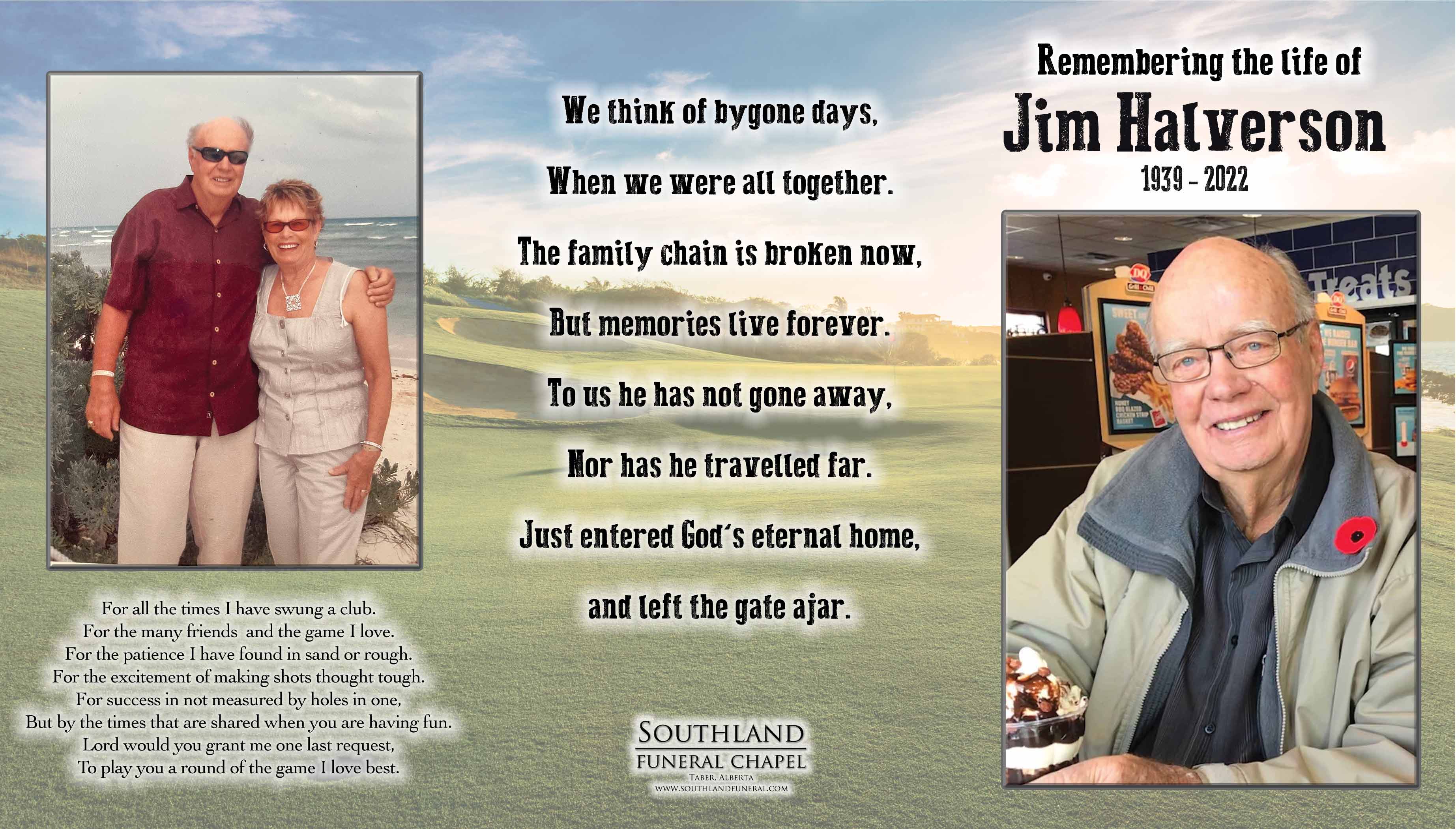 Jim was born in Drumheller on May 14, 1939 to his parents Ken and Verna Halverson. He married Marion Kunz on July 27, 1963 and they moved to Taber in 1970 where they spent the rest of their time together and raised their family.